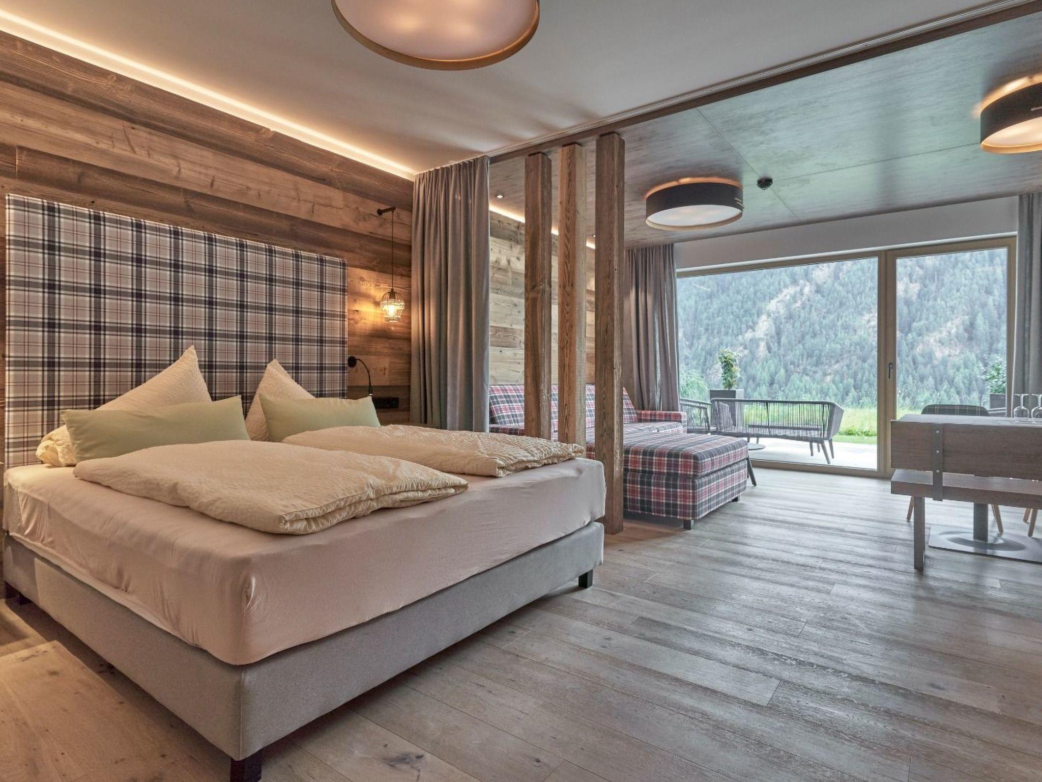 Inside, modern and Alpine-style chalets and flats await you, furnished with Ötztal old wood, which creates a cosy and comfortable atmosphere. Bright, generously proportioned rooms invite you to linger. The high-quality box-spring beds in the bedrooms ensure a restful night's sleep. A fully equipped kitchen and chic bathrooms with rain showers fulfil all your wishes in terms of comfort and design.