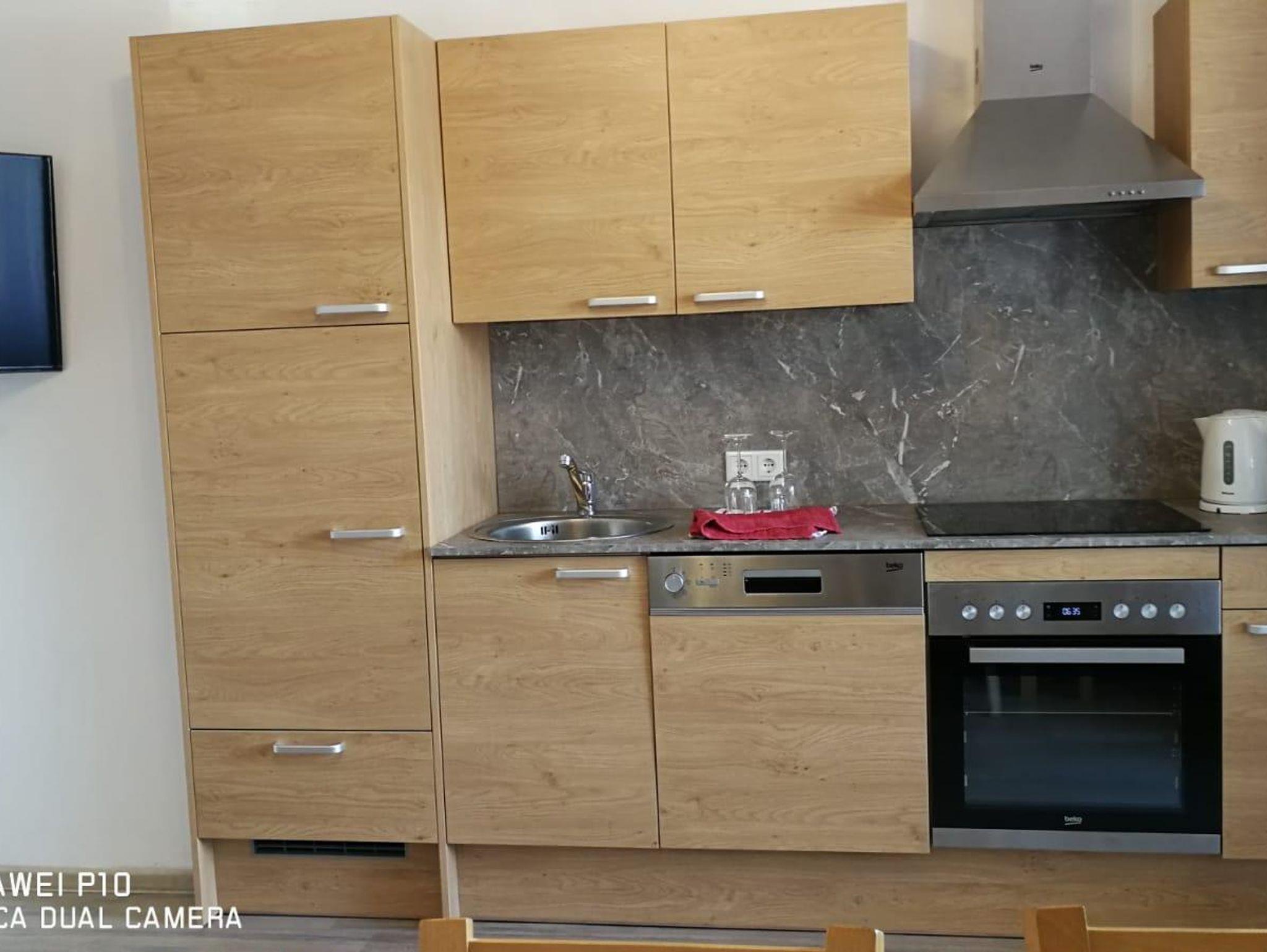 Das 70 m² große Appartement besteht aus vollständig eingerichteter Wohnküche mit Fernseher, Schlafzimmer (Doppelbett, Dusche, WC), Schlafzimmer (Etagenbett, Dusche) und einem kleinen Zimmer mit Etagenbett. Im Vorraum steht noch ein weiteres WC zur Verfügung. Zum Appartement gehören auch 2 Balkone. Bettwäsche, Handtücher und Geschirrtücher sind vorhanden.