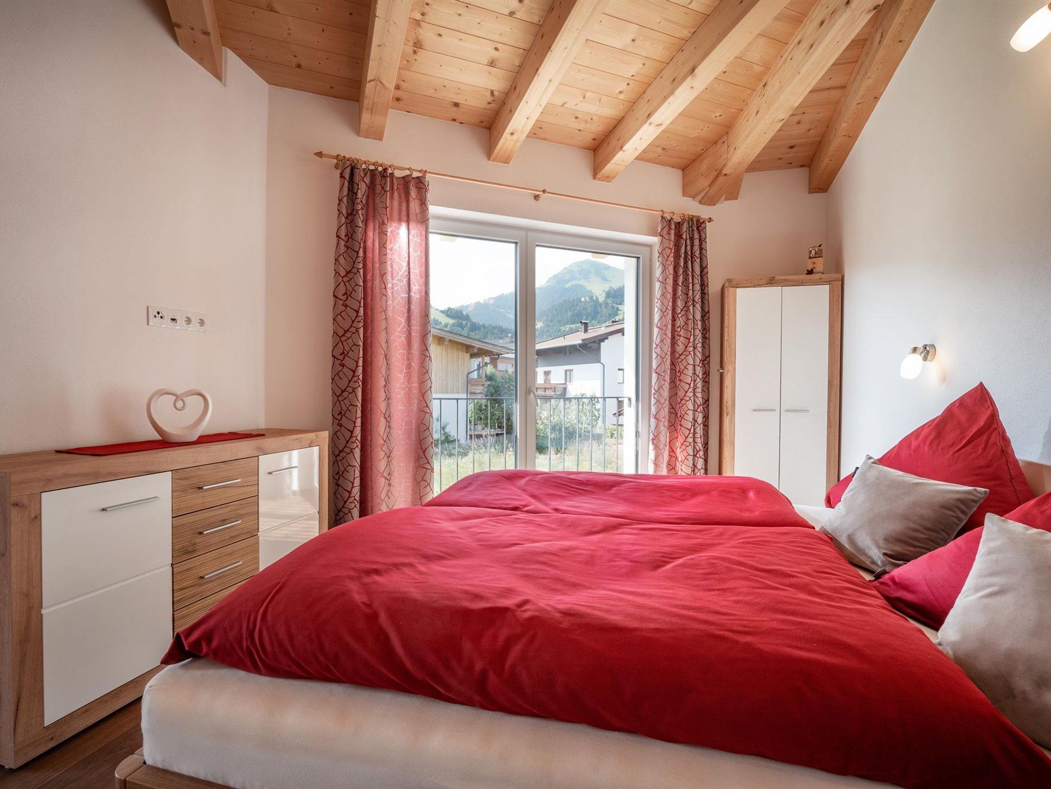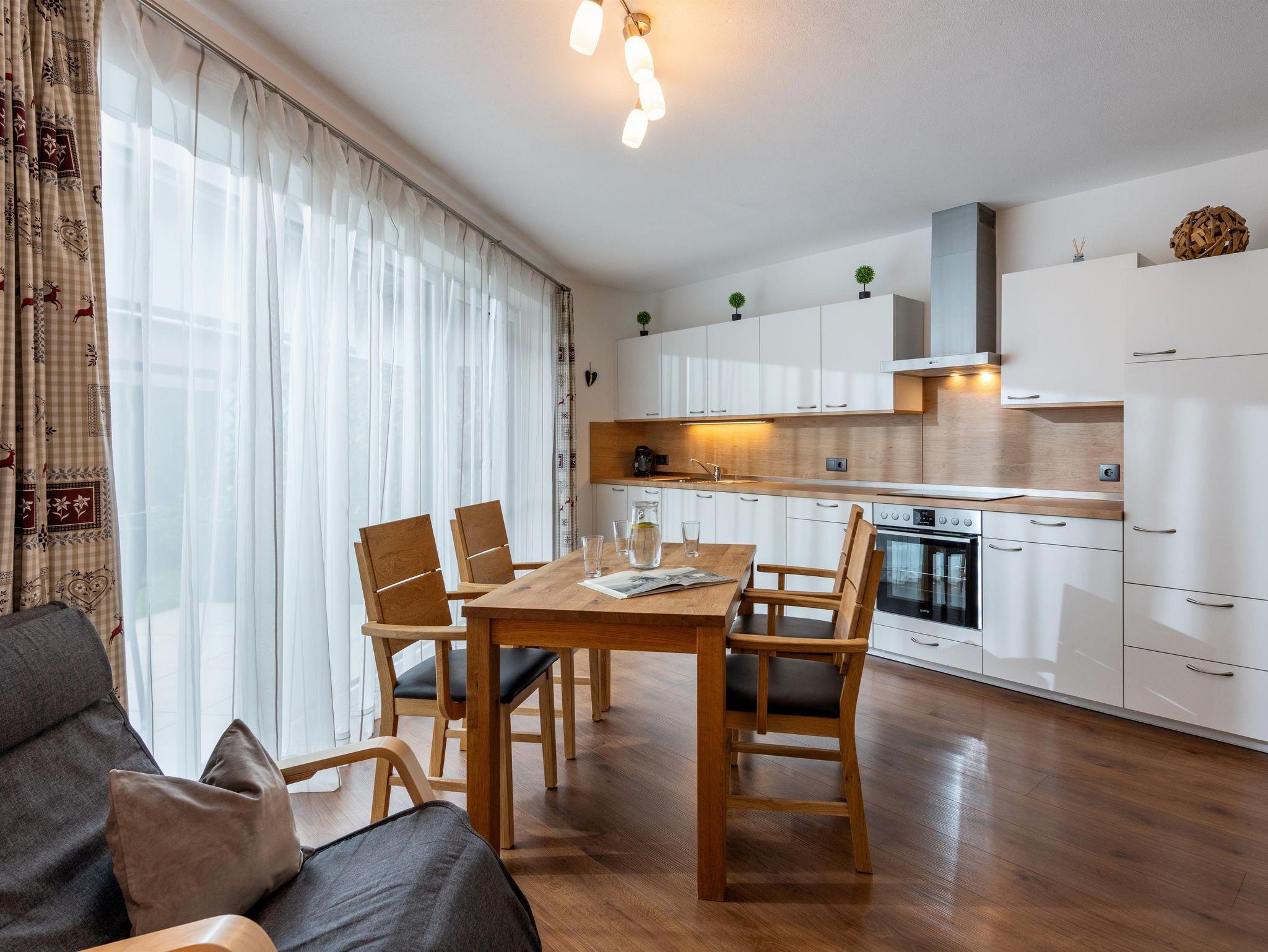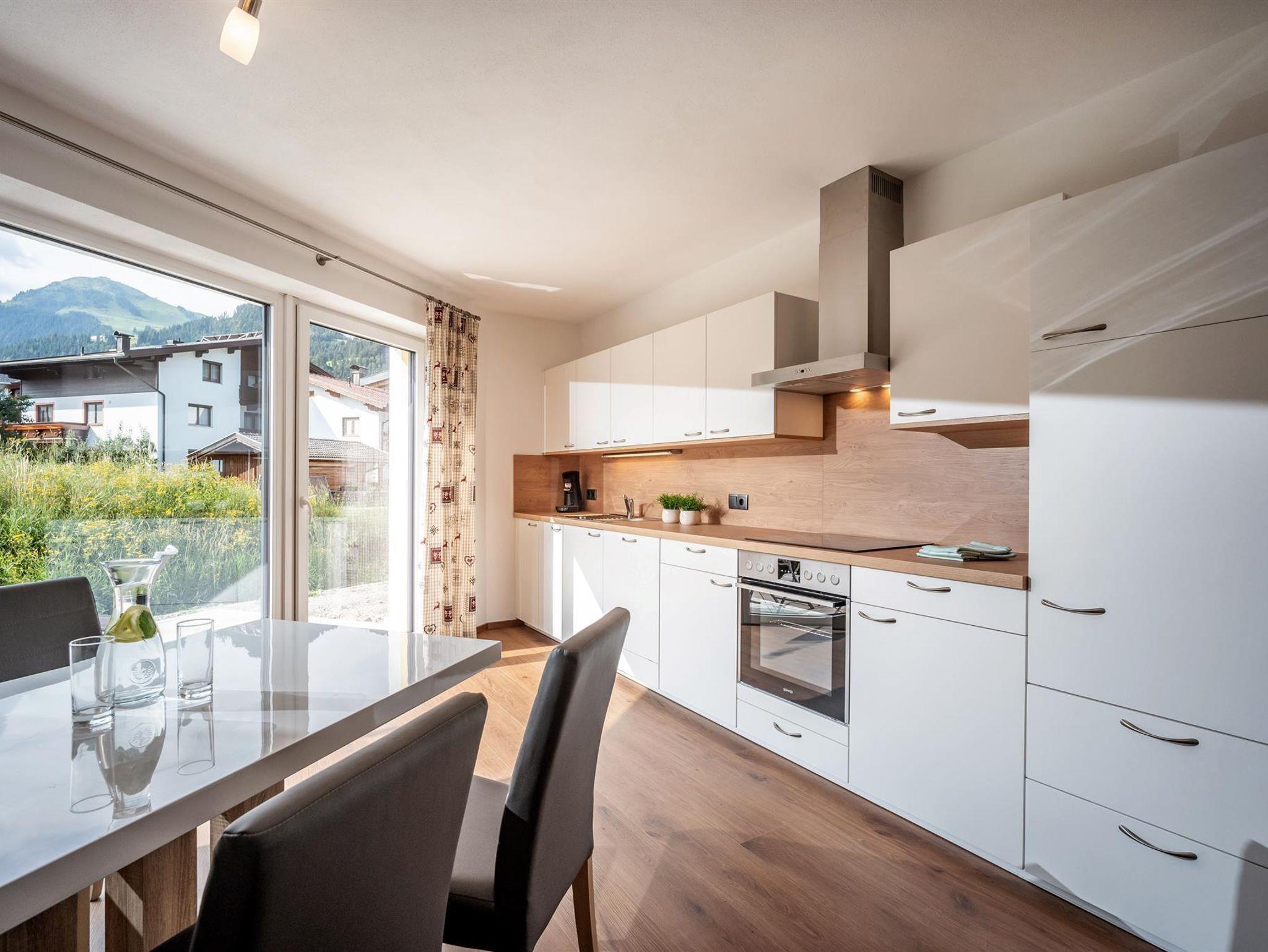 Unsere 2019 errichtete Ferienwohnung (ca. 62m²) besteht aus 2 Schlafzimmern (Doppelbett, 1,90 m Stockbetten), vollausgestattete Wohnküche, diese verfügt über ein gemütliches und ausziehbares Sofa, 2 Fernseher, Geschirrspüler, Kühl- und Gefrierschrank, Dusche/WC und separates WC, Garderobe, in der ganzen Wohnung Fußbodenheizung, (nachhaltiges Heizsystem), Balkon, eigene Terasse mit Garten. Gratis WLAN. Sie können einen wunderbaren Blick auf die umliegenden Berge und das Bergdoktorhaus genießen.