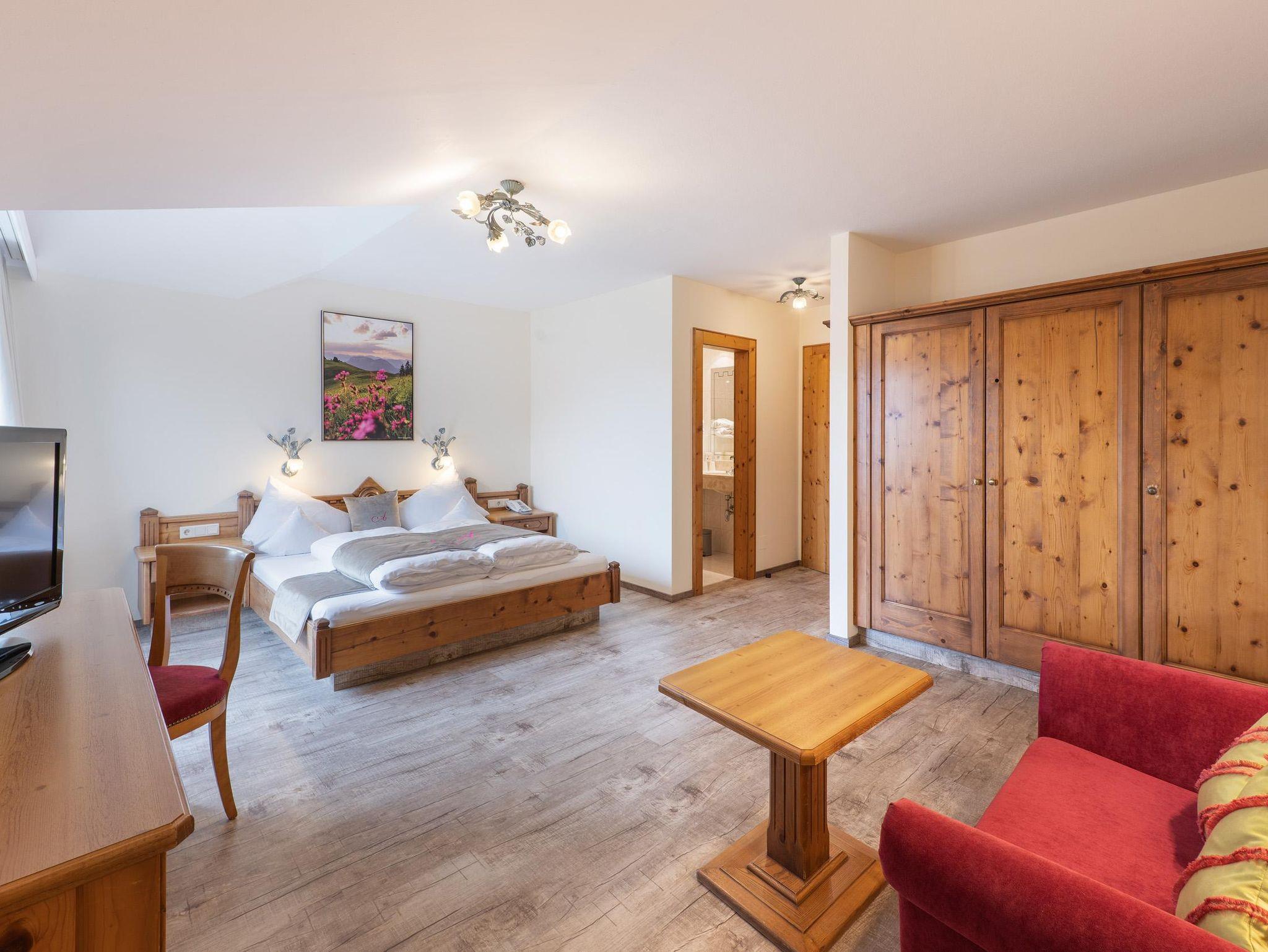 Genießen Sie Ihren Aufenthalt im sonnigen Komfortdoppelzimmer mit ausziehbarer Couch, für 2 Erwachsene und 2 Kinder geeignet. Bad mit Badewanne und Dusche, WC separat, Kosmetikspiegel, Haartrockner, Telefon, SAT-TV mit Fernsehprogramm, Radio, Safe, Minibar, Balkon mit Tal- und Bergblick, kostenloser Parkplatz (im Freien), WLAN!