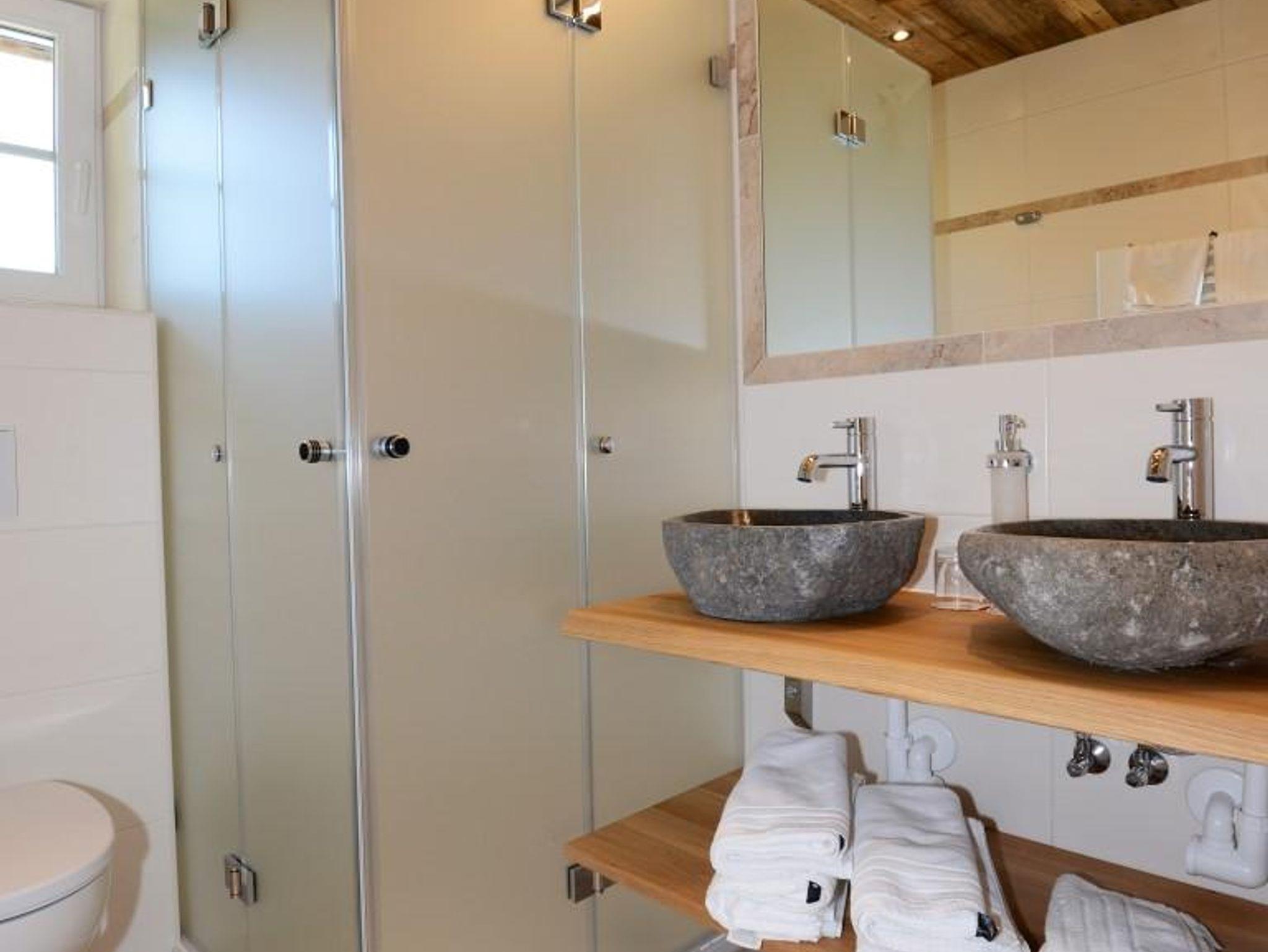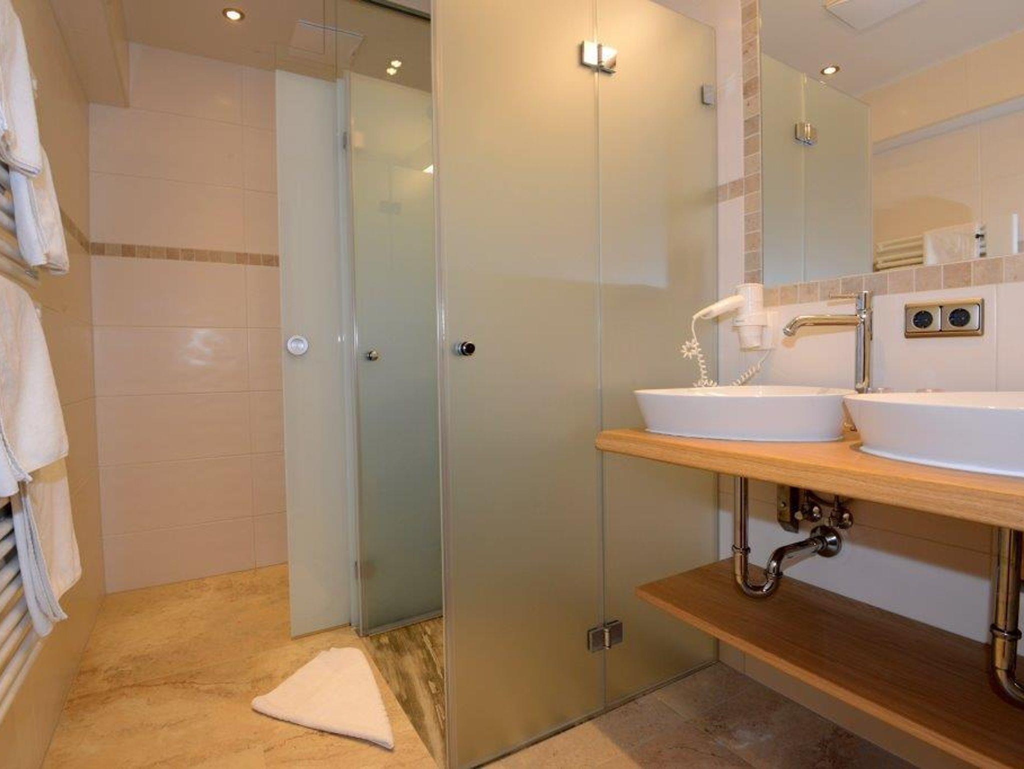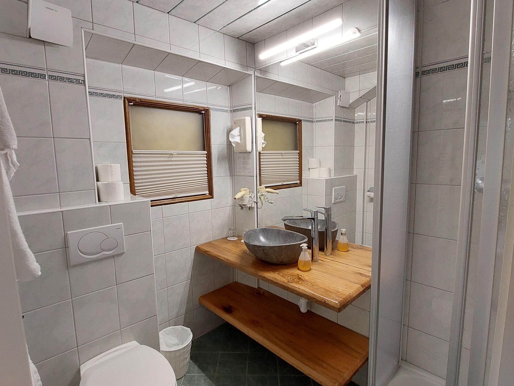 Badezimmer mit Dusche, WC getrennt, Haarfön