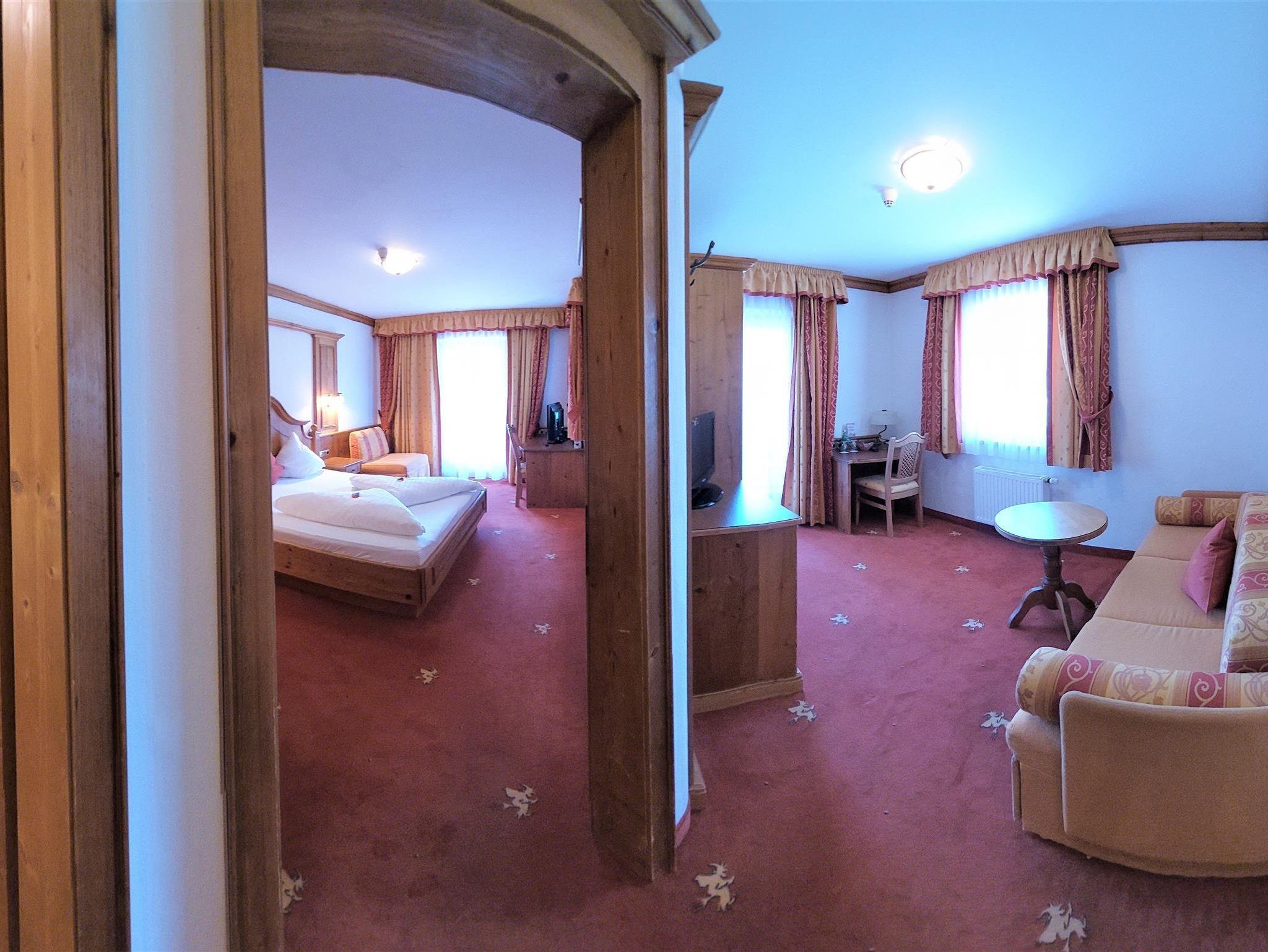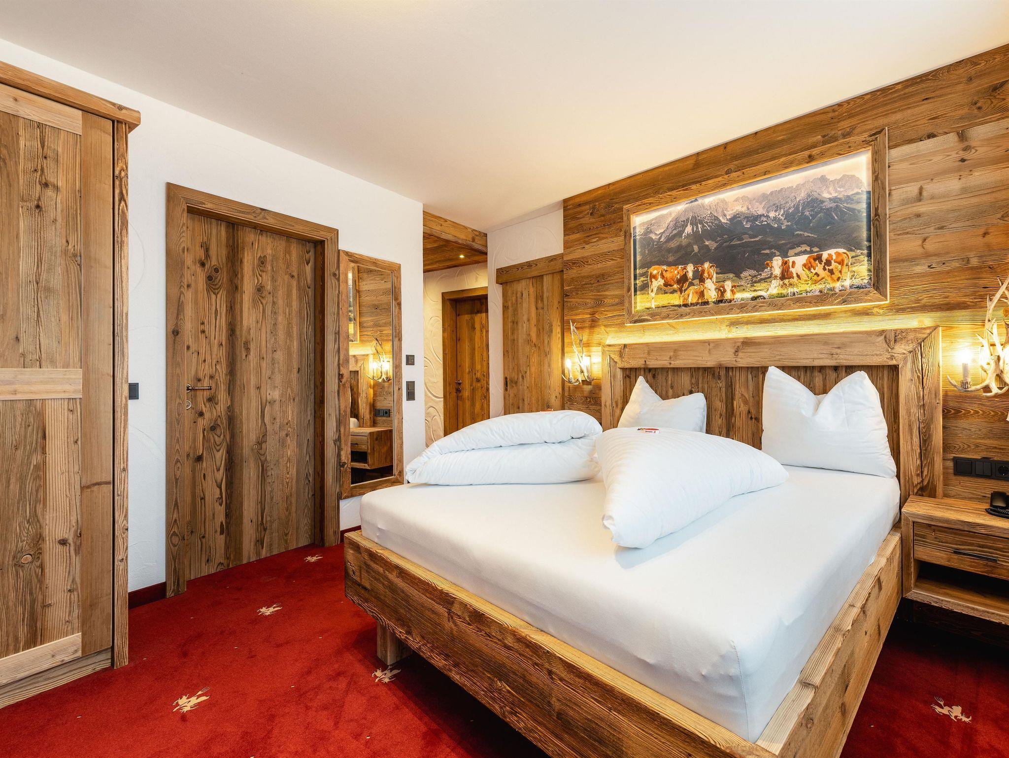 Familiensuite im Tiroler Landhausstil - Balkon - 36m² gesamt - Schlafzimmer mit Doppelbett, Wohnzimmer bzw. Kinderzimmer abgetrennt mit Couch, bei Kinder Ausziehcouch, Zimmersafe, 2x TV, Telefon, Wlan