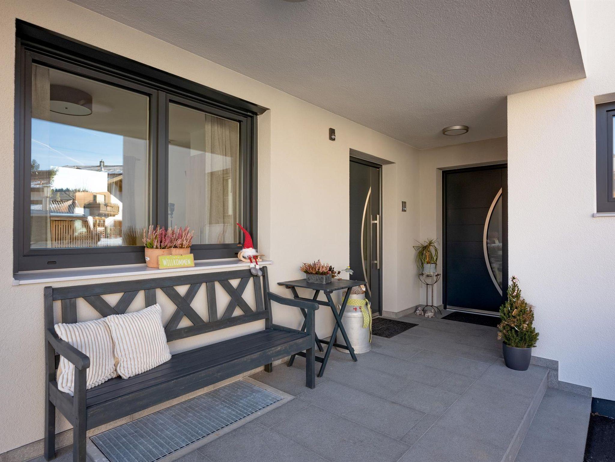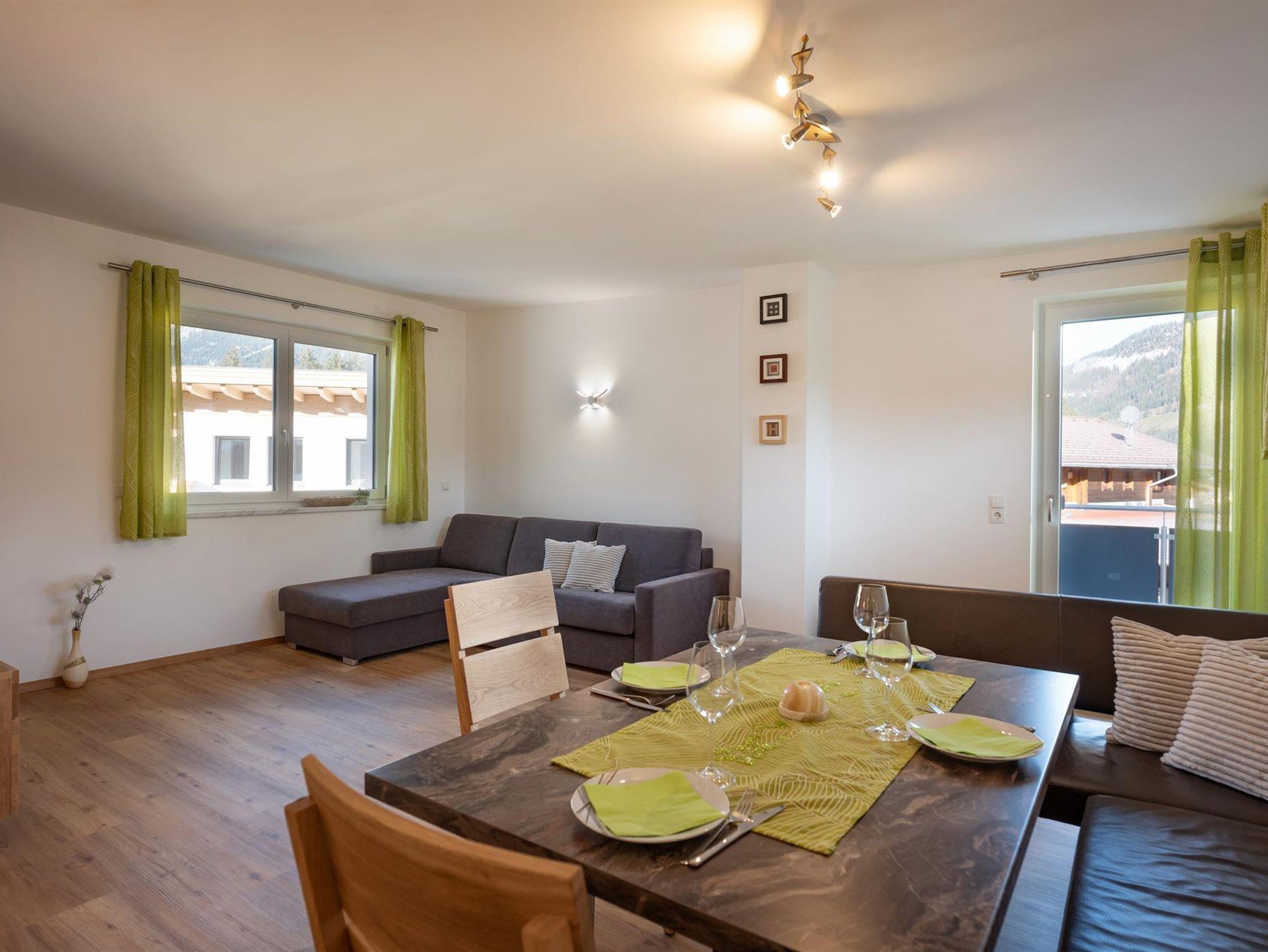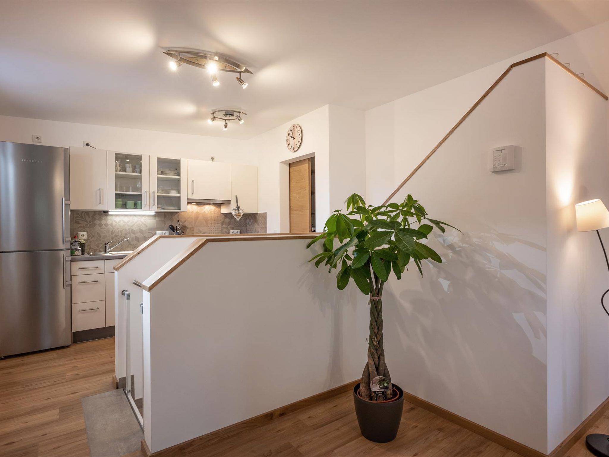 Das Appartement ist geteilt in zwei Stockwerke. Im Erdgeschoss befindet sich das Schlafzimmer mit einem Doppelbett für zwei Personen. Auch das Badezimmer und das separate WC befinden sich im Erdgeschoss. Vom Gang gelangen Sie in den Garten der über eine Terrasse verfügt. Im zweiten Stock befindet sich die großzügige und vollausgestattete Wohnküche mit einer Doppelschlafcouch. Von hier gelangen Sie auf die Dachterrasse die mit perfektem Blick auf den Wilden Kaiser einzigartig ist.