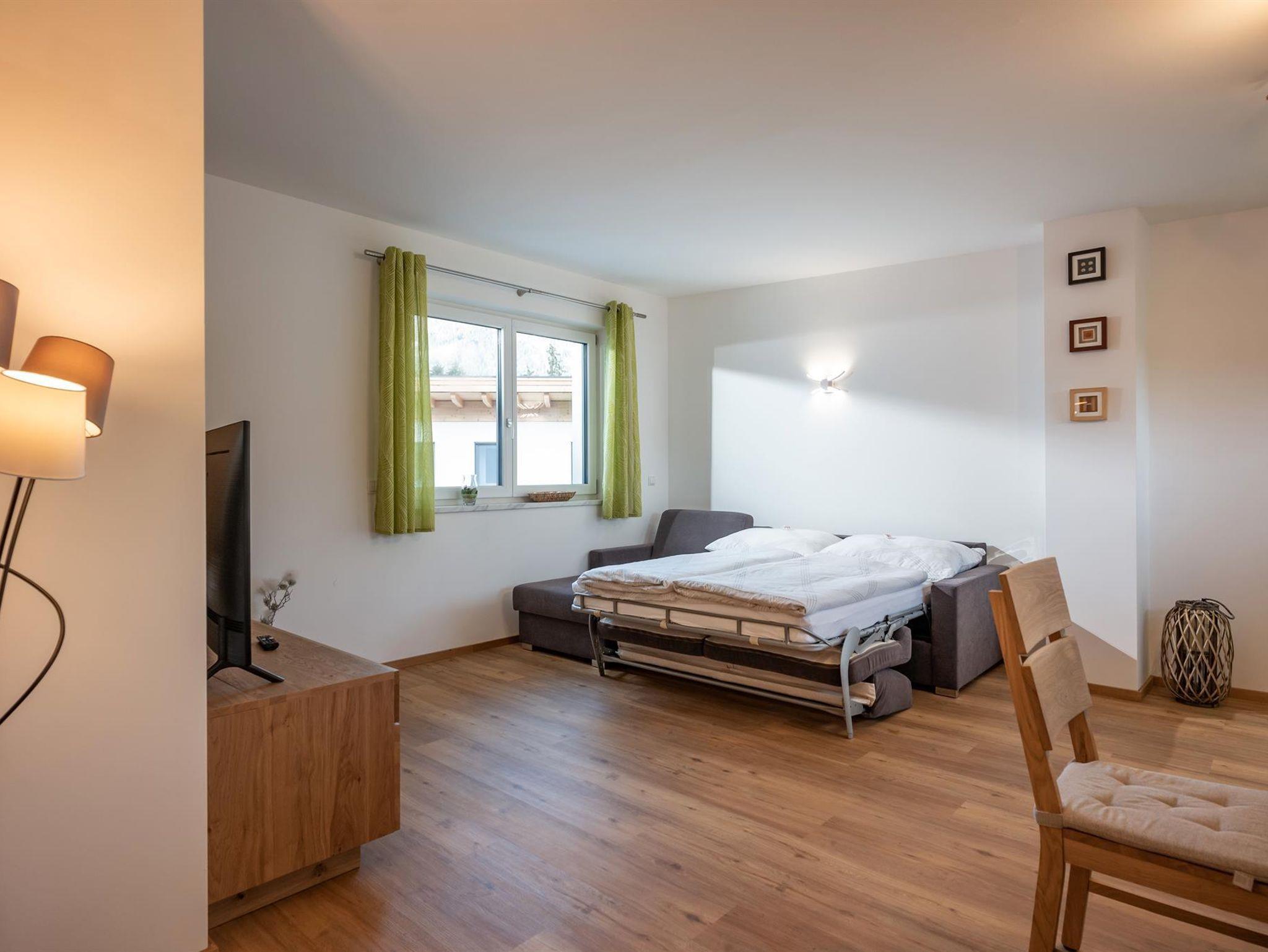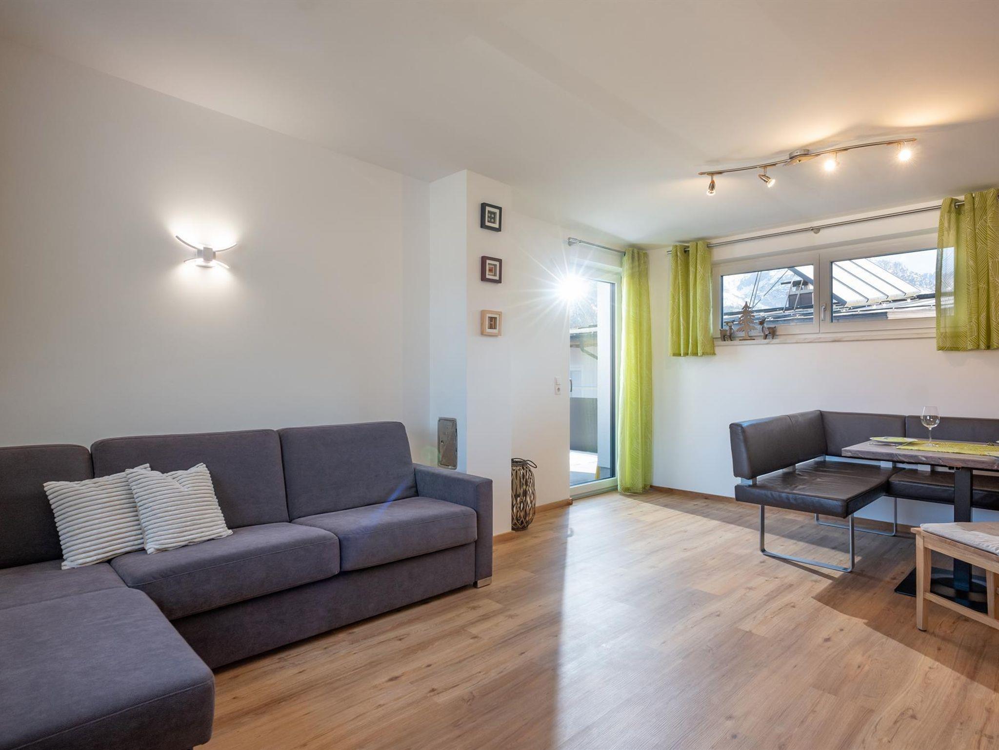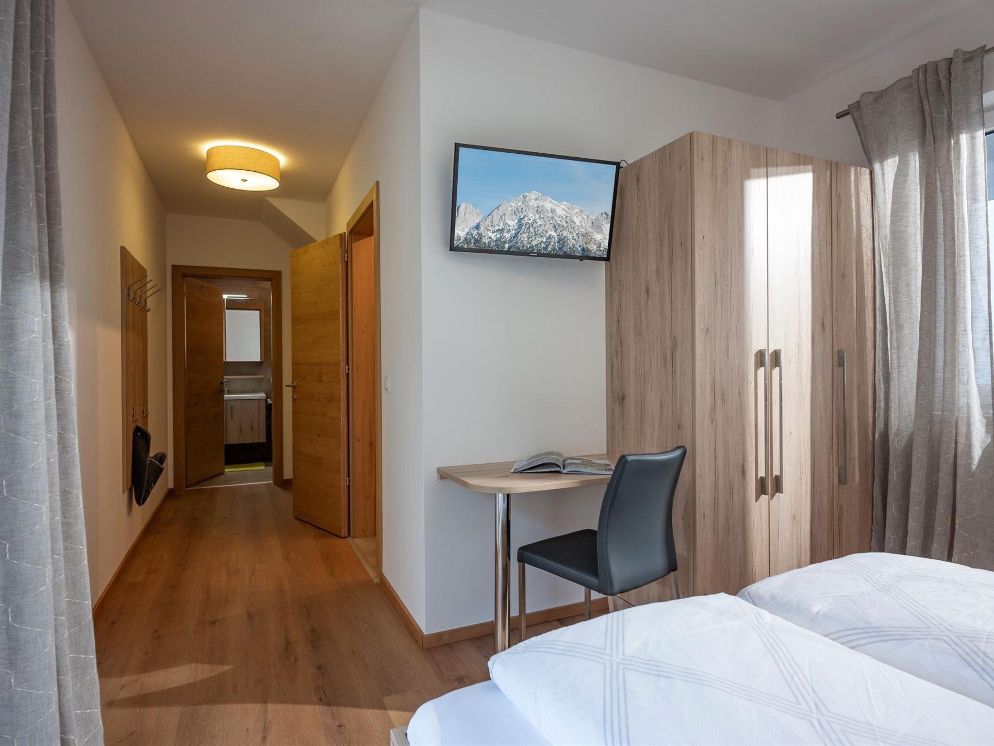 Das Appartement ist geteilt in zwei Stockwerke. Im Erdgeschoss befindet sich das Schlafzimmer mit einem Doppelbett für zwei Personen. Auch das Badezimmer und das separate WC befinden sich im Erdgeschoss. Vom Gang gelangen Sie in den Garten der über eine Terrasse verfügt. Im zweiten Stock befindet sich die großzügige und vollausgestattete Wohnküche mit einer Doppelschlafcouch. Von hier gelangen Sie auf die Dachterrasse die mit perfektem Blick auf den Wilden Kaiser einzigartig ist.