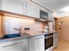 På 1. etage: (åbent køkken(elkedel, komfur(Komfur med to kogeplader), kaffemaskine(kaffetragt), ovn, køle-fryseskab), Stue/soveværelse(dobbeltskabsseng, Fjernsyn, balkon), badeværelse(bruser, håndvask), toilet) loungerum(deles med andre gæster)(bruser, 2x sauna, toilet, liggestole), skiopbevaring(skistøvlevarmere), cykelopbevaring, parkering