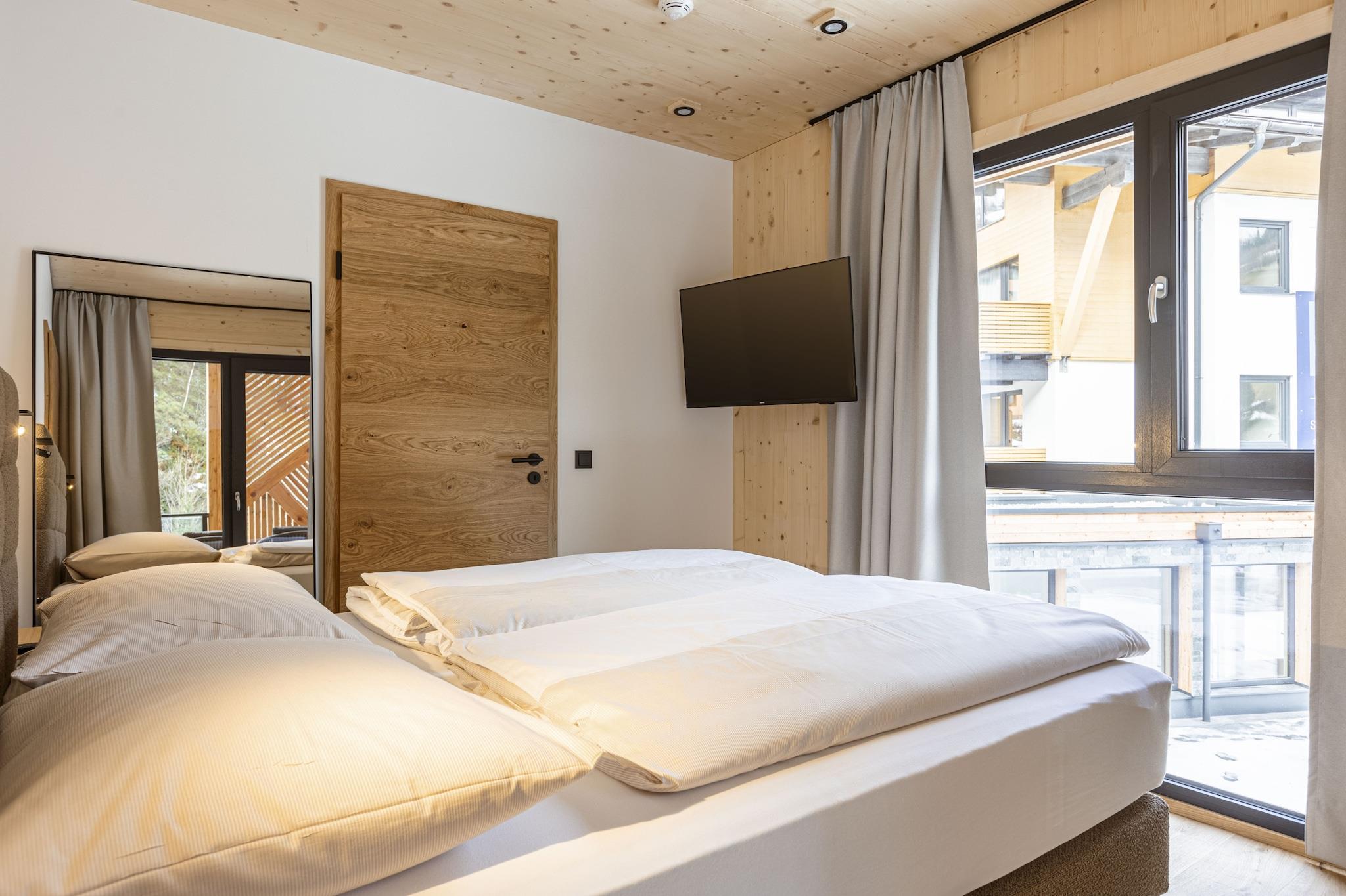 Denne lejlighed tilbyder luksuriøs og rummelig indkvartering til din ferie med 88 m² plads og plads til op til 6 gæster. Det første soveværelse har en fleksibel modulseng, der tilpasser sig dine behov og kan bruges som en dobbeltseng eller med en ekstra udtrækkelig enkeltseng, hvilket skaber et familie- eller trepersonersværelse. Det andet soveværelse er møbleret med en klassisk dobbeltseng og en dobbelt sovesofa i opholdsstuen, hvilket gør det ideelt for familier eller grupper. Begge soveværelser har eget badeværelse og et ekstra separat toilet. Saalbach Suites ligger direkte på pisterne i Saalbach-Hinterglemm og er en ideel base for skiløbere med nem adgang til ski-in/ski-out. Gæsterne kan også nyde wellness-området med en opvarmet udendørs pool og saunaer. Resortet ligger tæt på adskillige attraktioner, herunder de maleriske landskaber i Salzburger Land, hvilket gør det til den perfekte destination for udendørsaktiviteter hele året rundt. Fra maj til oktober får gæster med Joker Card rabatter på lokale attraktioner og aktiviteter. Nyd ultimativ afslapning med adgang til en privat sauna med et ekstra brusebad. Suiten har også et hyggeligt udendørs badekar på balkonen eller terrassen, perfekt til afslapning efter en dag på pisterne. Suiten har også moderne bekvemmeligheder såsom kapselkaffemaskine, elkedel, køleskab og et udvalg af køkkenredskaber for din bekvemmelighed. Åbningstider: Pool: 11:00 - 20:00 / Wellness: 14:00 - 20:00