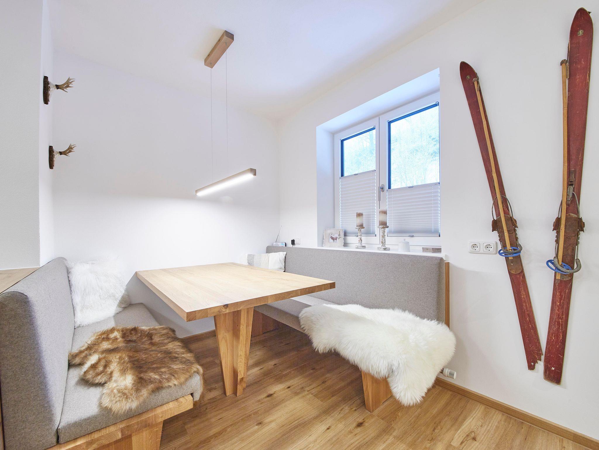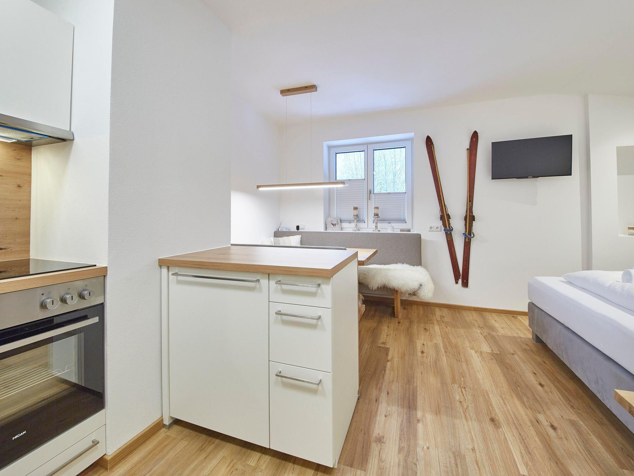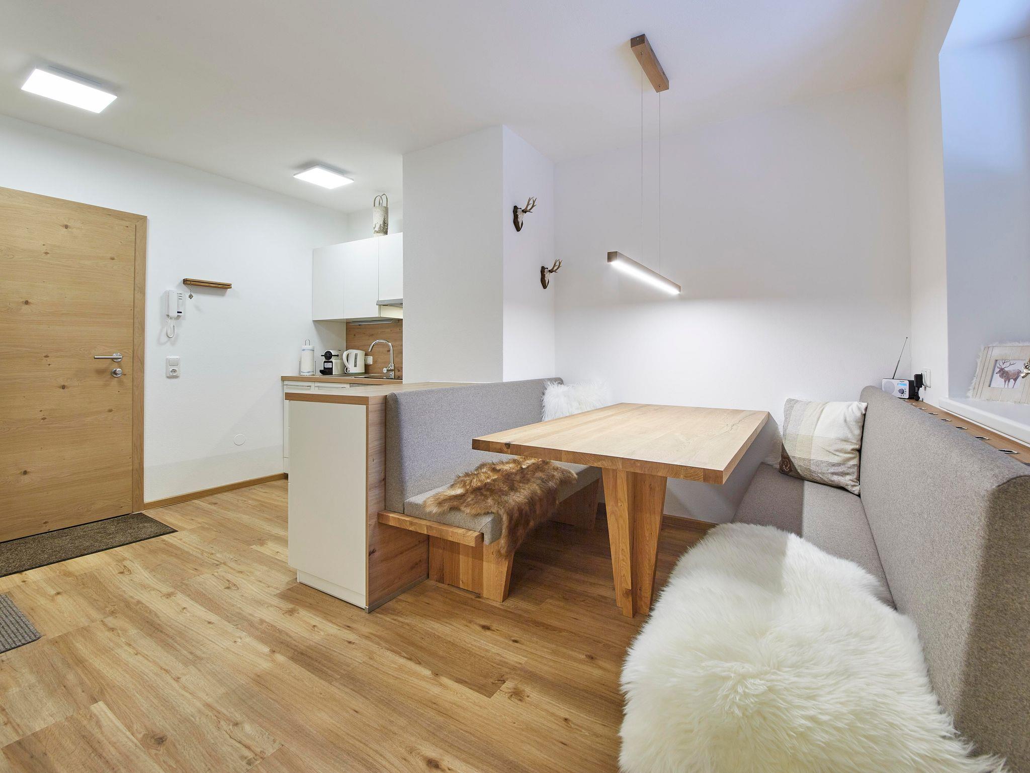 Unser Appartement Bergzeit stellt auf rund 25 m² eine kleine aber feine Unterkunft in ruhiger und doch zentraler Lage zwischen Saalbach und Hinterglemm dar. Die Wohnung bietet einen Wohnbereich mit Doppelbett, einem Essbereich, eine Küche sowie ein Badezimmer mit Dusche und WC. Ein Skiraum sowie ein Innenpool zur Gemeinschaftsnützung stehen unseren Gästen zur Verfügung. Ein kostenloser Parkplatz sind je nach Verfügbarkeit direkt hinter dem Gebäude vorhanden.