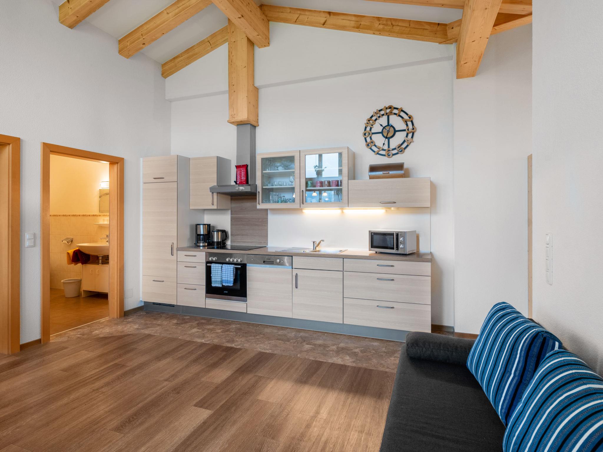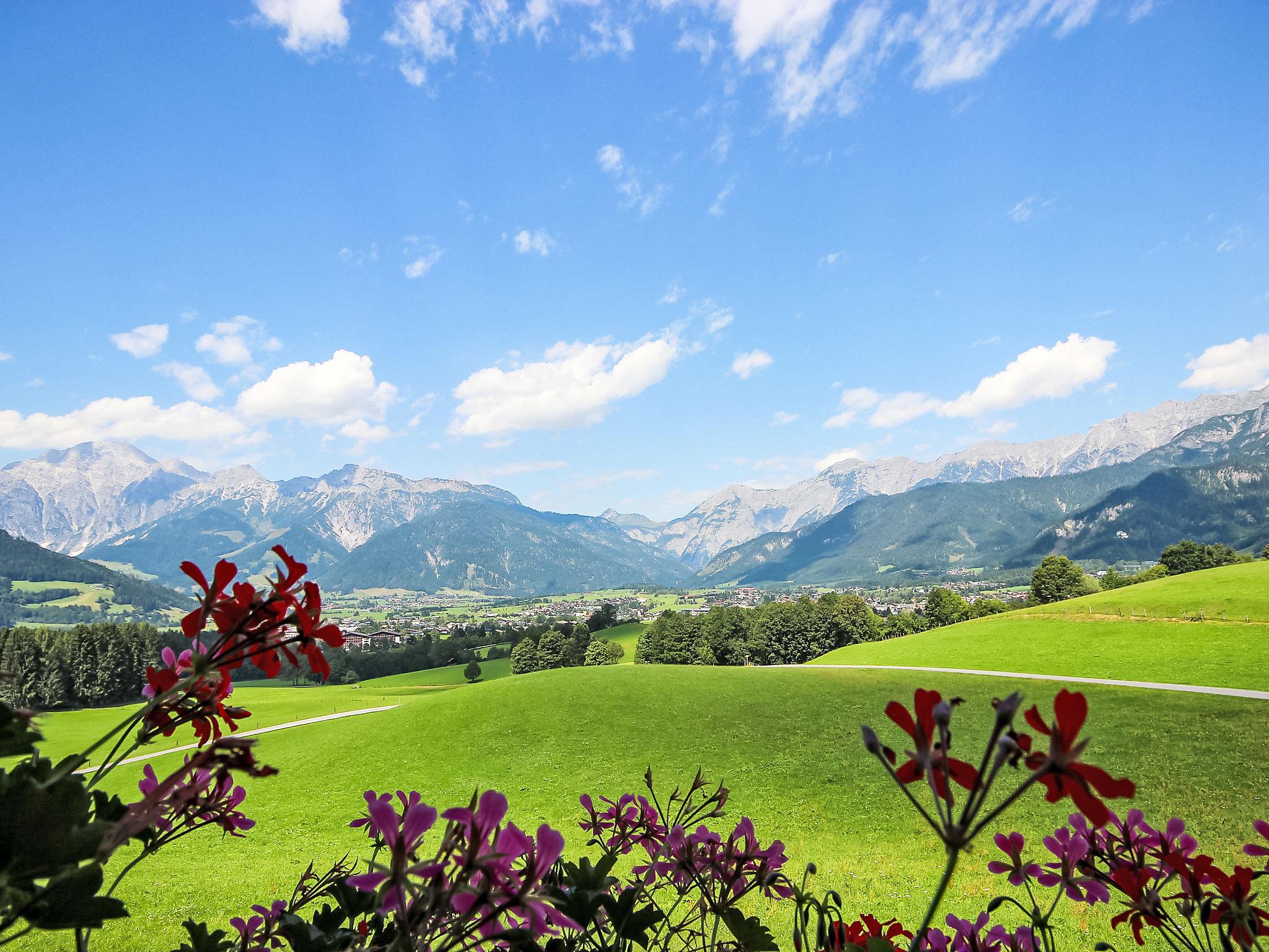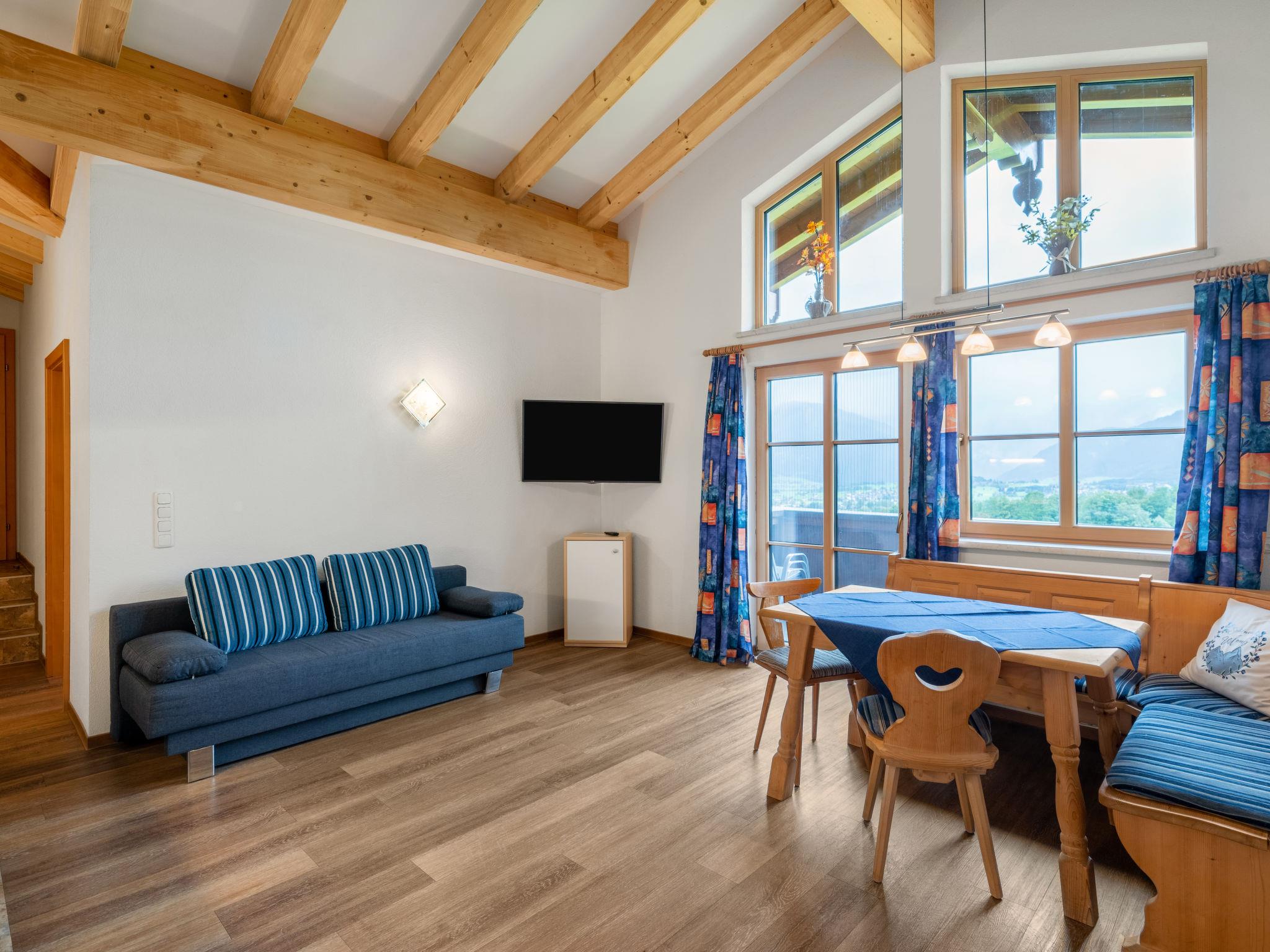 "Steinernes Meer", 3-room apartment 68 m2, on the top floor. Spacious and bright, partly with sloping ceilings, cosy furnishings: entrance hall. Living/dining room with dining nook and cable TV (flat screen). Exit to the balcony. 1 double bedroom. 1 room with 1 bed and 1 double bed. Open kitchen (oven, dishwasher, 4 ceramic glass hob hotplates, microwave, electric coffee machine). Shower/WC. Balcony furniture. Very beautiful panoramic view of the mountains and the countryside. Facilities: Internet (DSL/LAN, free). Please note: smoke alarm. 50619-005594-2020