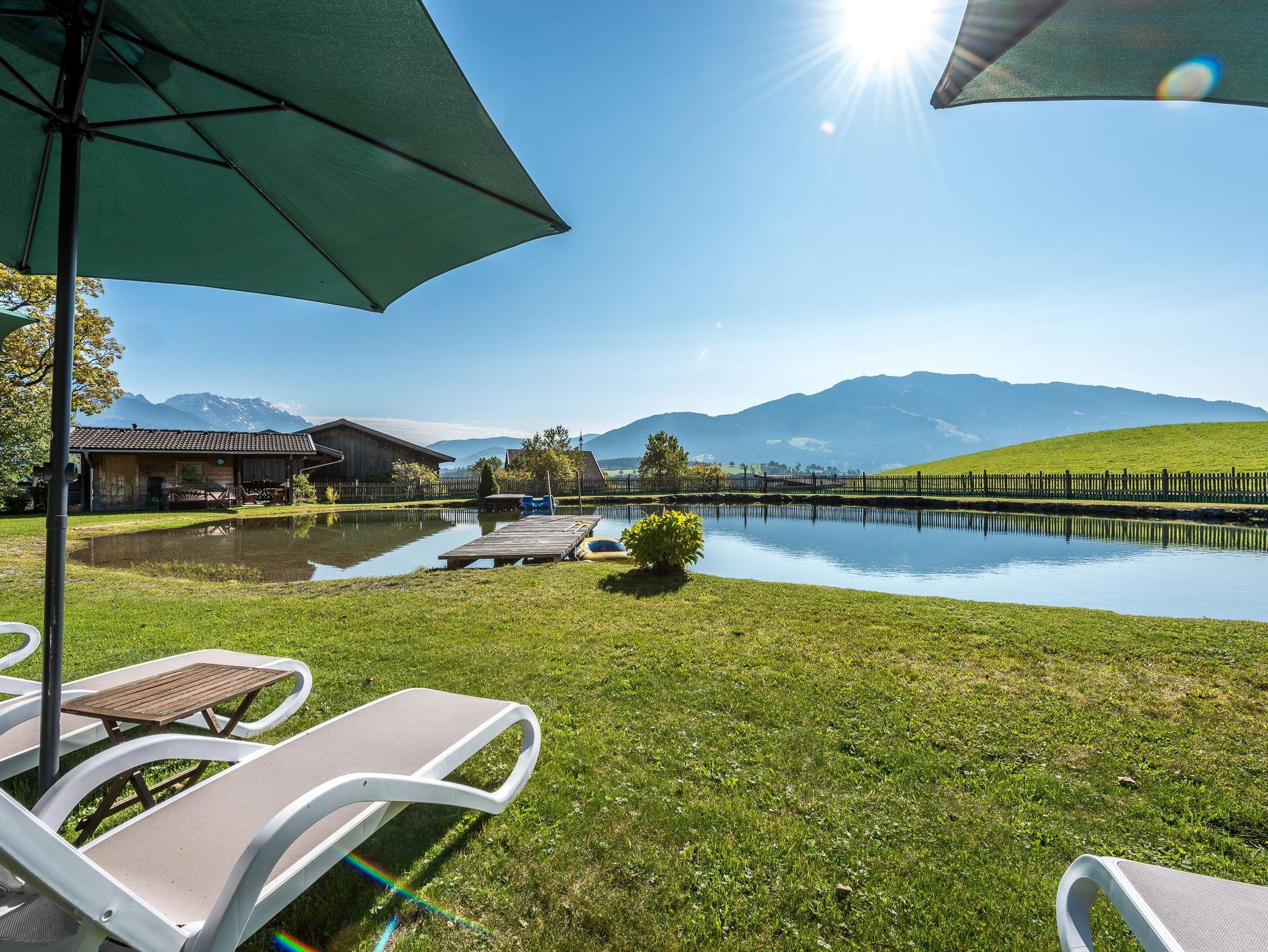 • hauseigener Badesee (700 m² Wasserfläche) mit Sonnenschirme und Liegen, Badeseehütte mit Umkleidekabine, Kühlschrank und Sitzecke