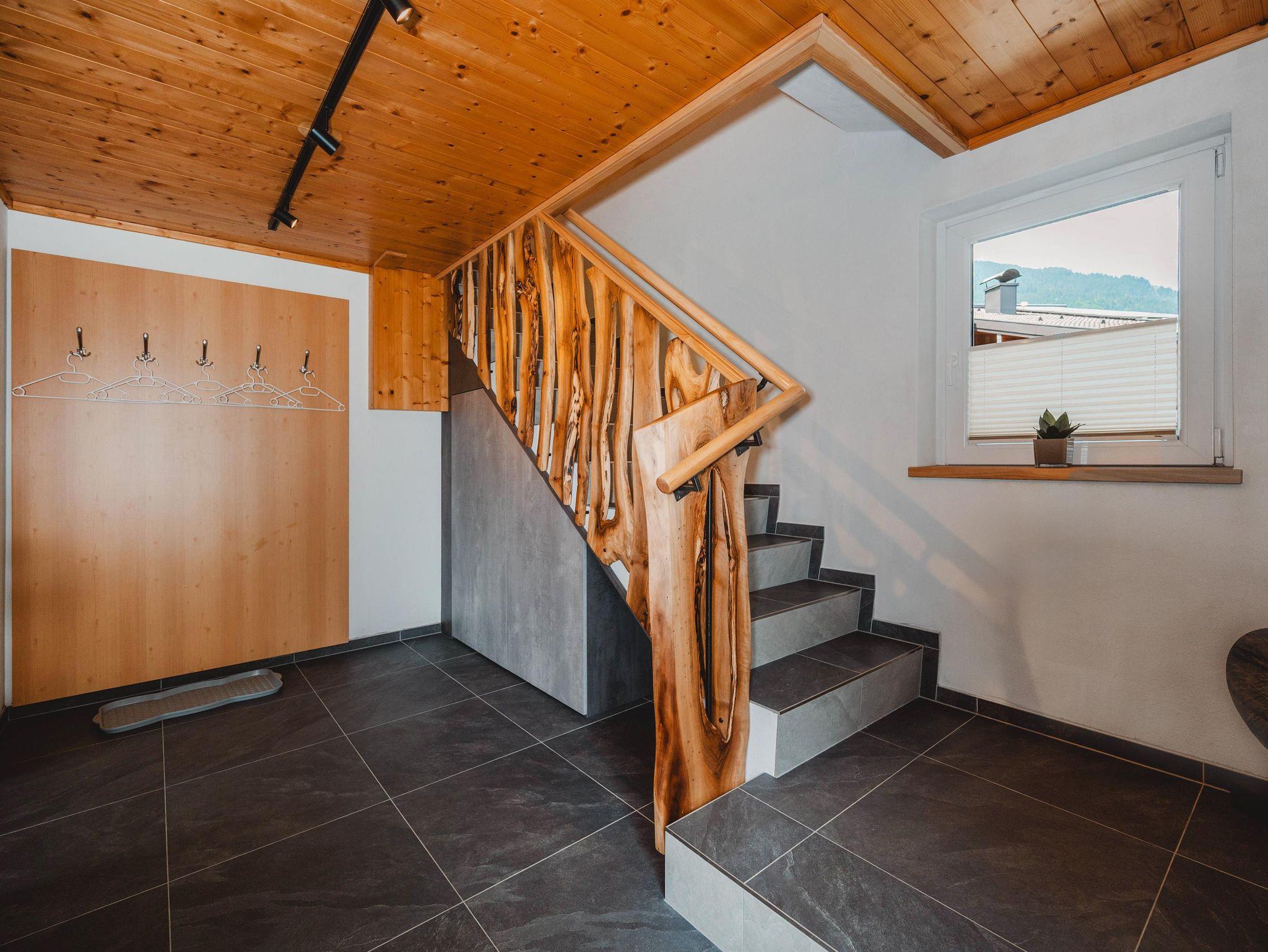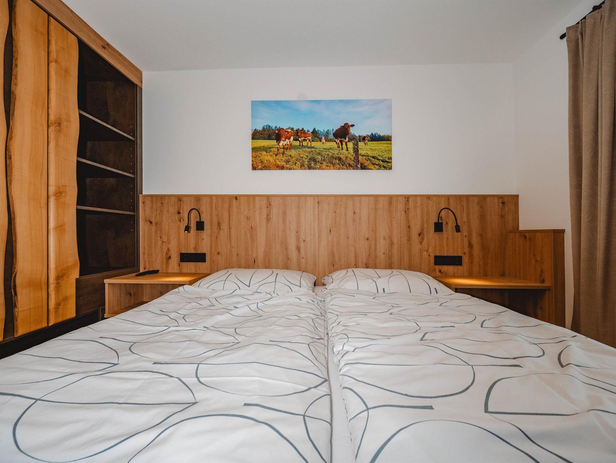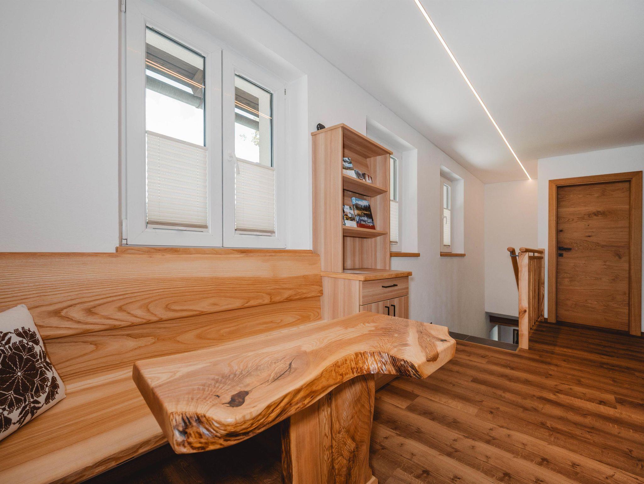 Das Ferienhaus ist gemütlich eingerichtet, insbesondere die Schlafzimmer mit ihren dekorativen Holzelementen fallen auf. Im Erdgeschoss befindet sich ein freundlicher Aufenthaltsraum, im ersten Stock sind die Küche und die Schlafzimmer. Angrenzend an den gepflegten Garten befindet sich eine überdachte Terrasse mit Tischen und Bänken. Hier kannst du die Natur bei entspannten Grillabenden inmitten einer einzigartigen Landschaft genießen und den atemberaubenden Blick bis zu den schneebedeckten Bergen erleben.