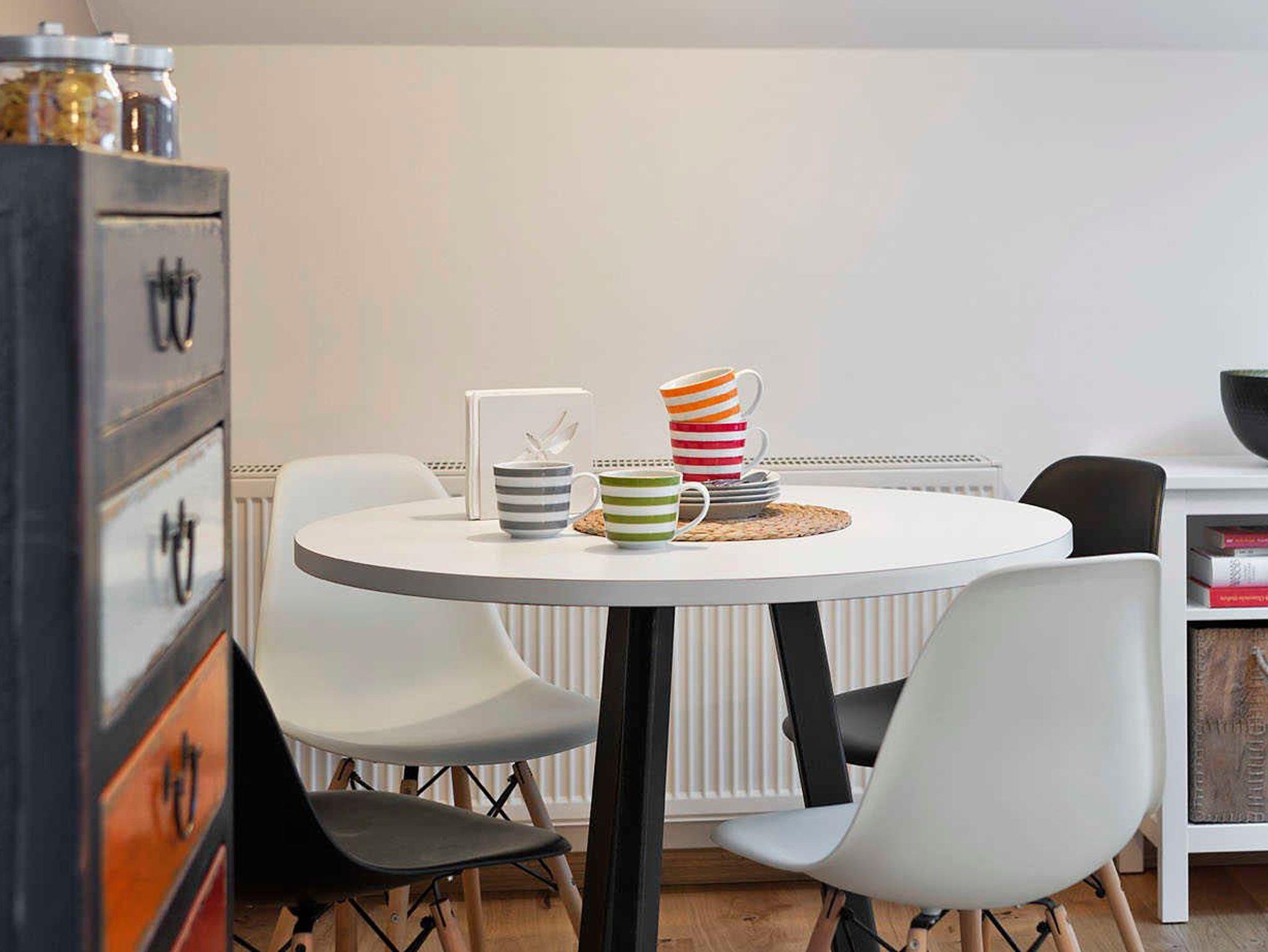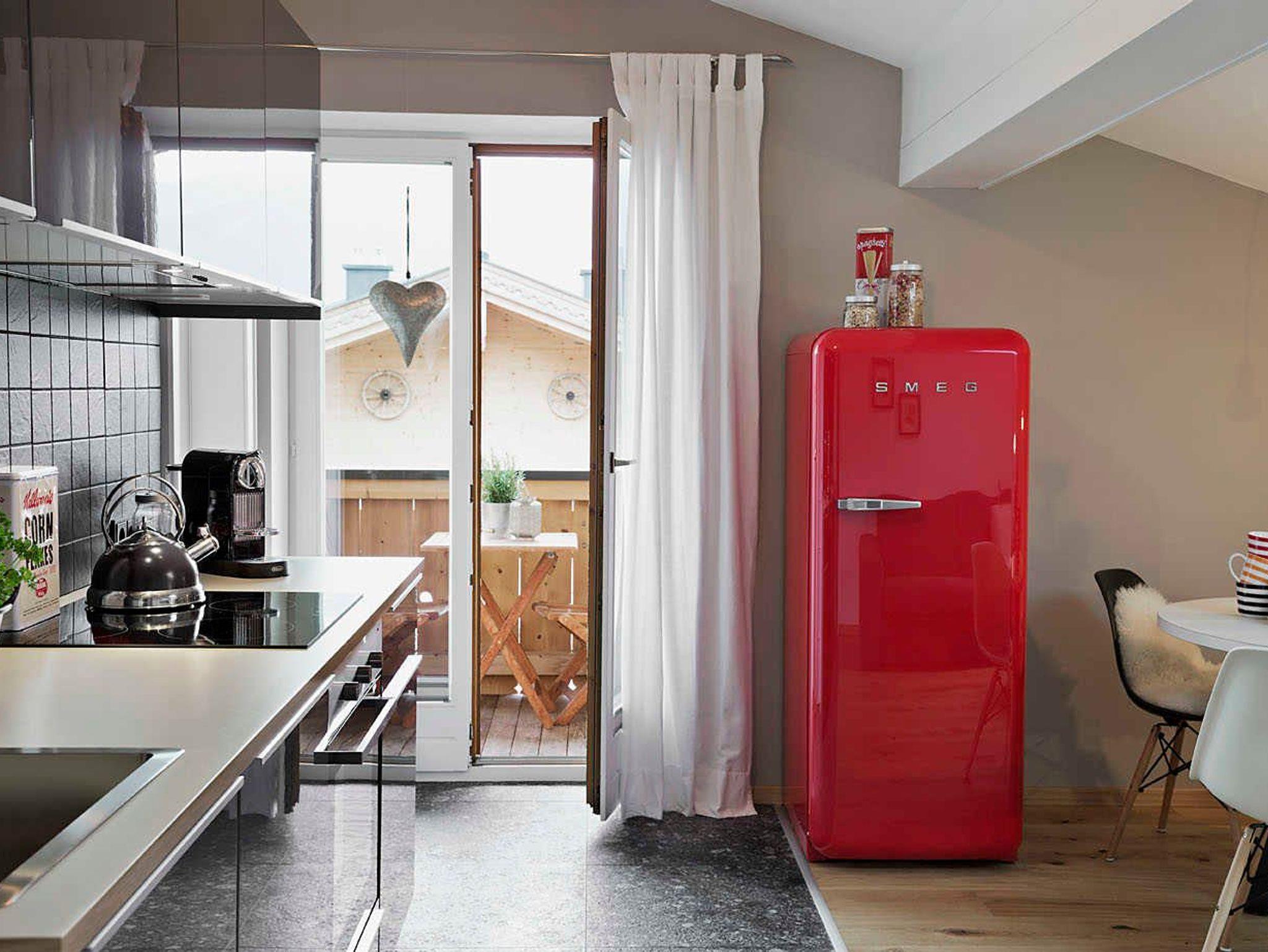 • Voll ausgestattete Wohnküche mit ausziehbarem Schlafsofa und Esstisch, E-Herd mit Backofen, SMEG-Kühlschrank, Toaster, Wasserkocher, Nepresso-Kaffeemaschine (inkl. einer Packung Nespresso-Kapseln), Geschirrspüler