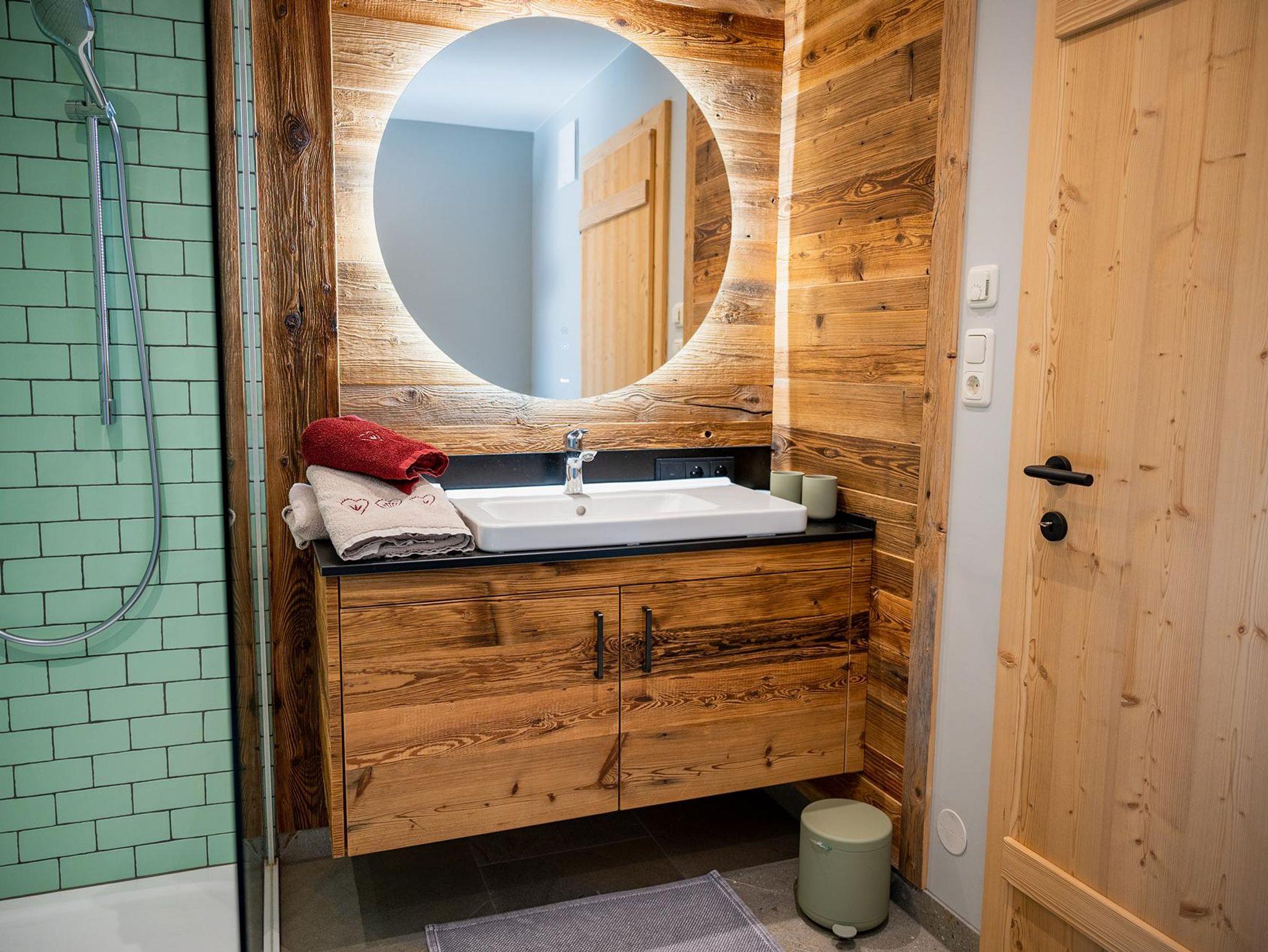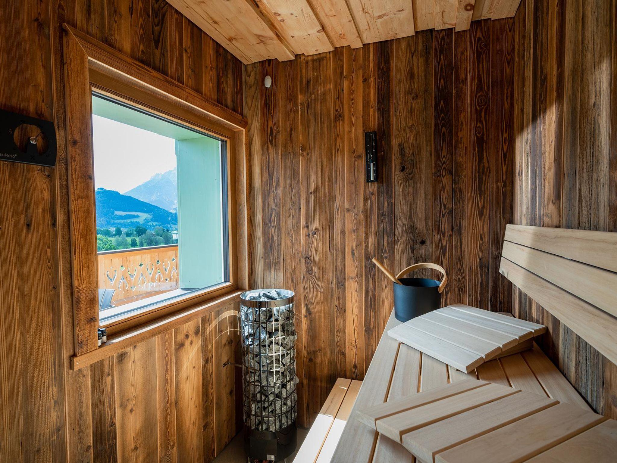 • Badezimmer mit Sauna (inkl. Aufgussöle) mit Blick auf den Ritzensee