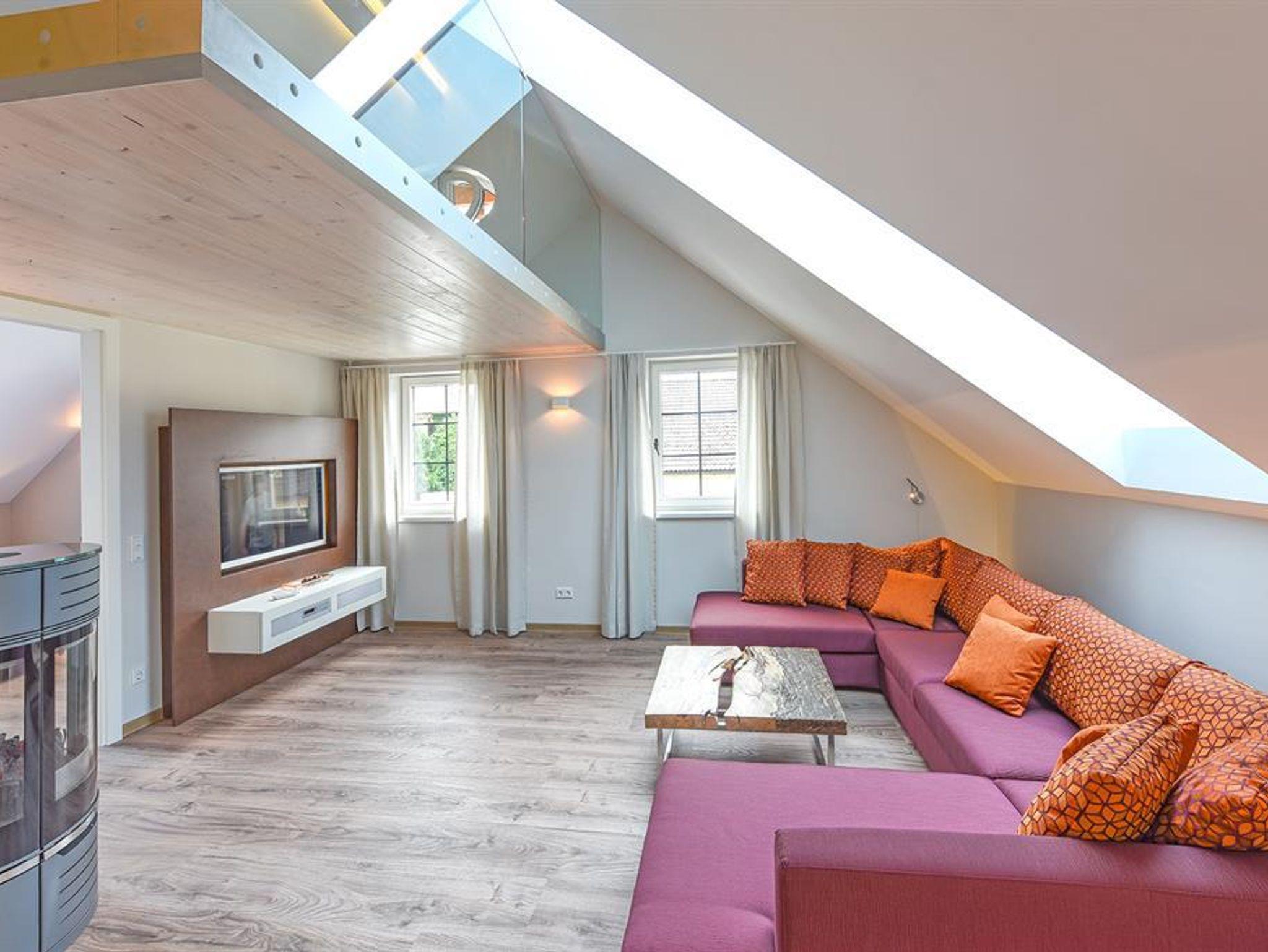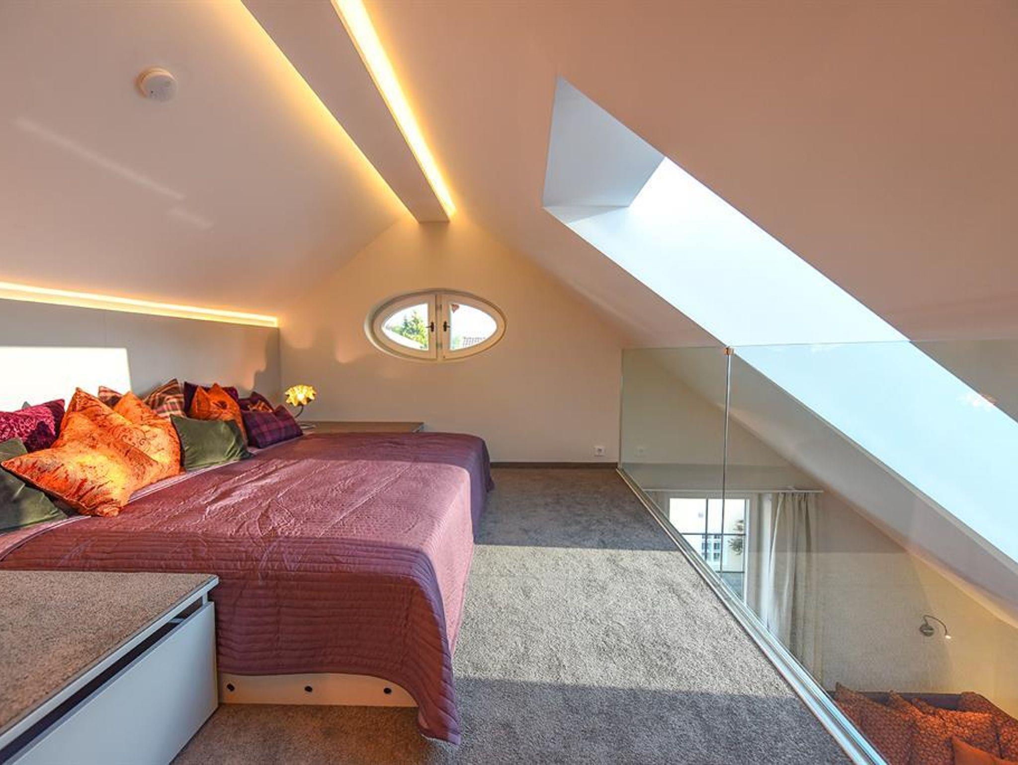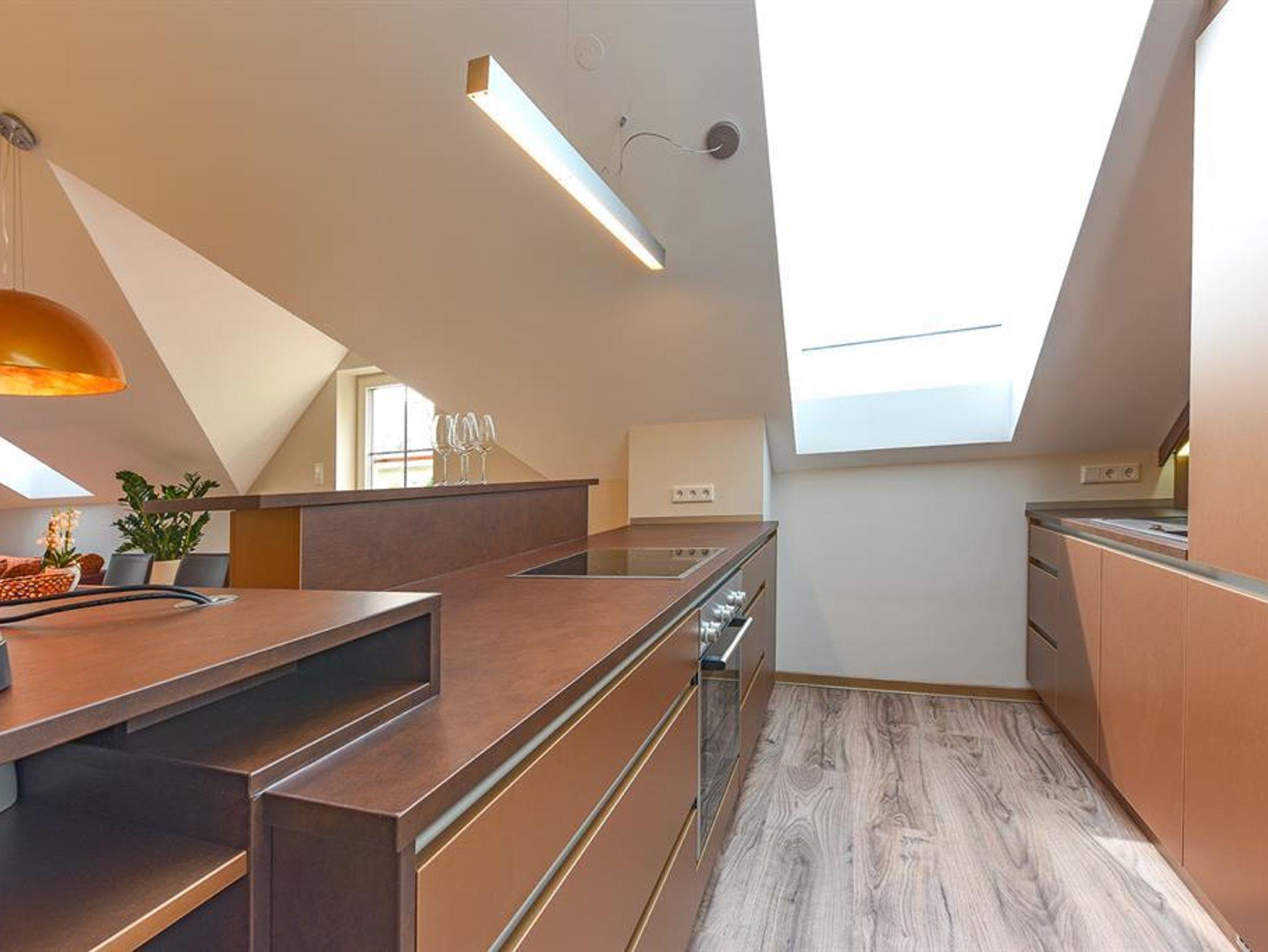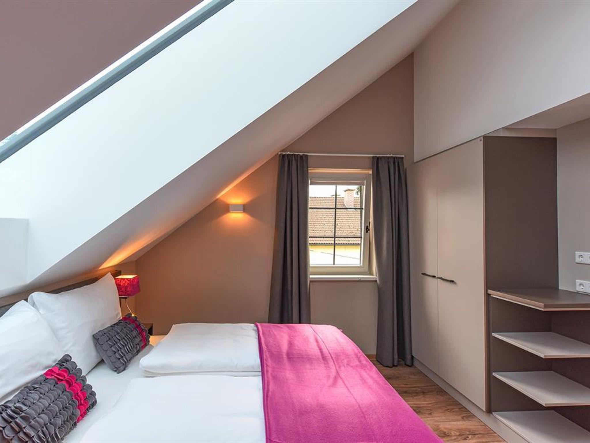 Penthouse Festung Unser Penthouse Festung gehört wohl zu den schönsten und luxuriösesten Möglichkeiten den Urlaub in der Stadt Salzburg zu verbringen. Das Penthouse umfasst das gesamte Dachgeschoss der Villa Salzburg und verfügt über bis zu 5 m hohe Räume. Eingerichtet wurde die Wohnung mit Designermöbeln. Die verwendeten Materialien sind von höchster Qualität. Das Symposium von herrschaftlicher Architektur und modernem, extravagantem Design verleiht dem Penthouse ein einzigartiges Ambiente. Auf ca. 120 m² verfügt das Penthouse über 2 Schlafzimmer mit großen Doppelbetten. Das helle, lichtdurchflutete Wohnzimmer bietet dank der großen Fensterflächen wunderbare Ausblicke. Für gemütliche Abende steht der dänische Kamin im Wohn-Essbereich für Sie bereit. Das Highlight im Badezimmer ist die freistehende Badewanne, die sich direkt unter einem 3,5 m² großen Dachfenster befindet. Das Penthouse verfügt zudem über eine 10 m² großen Chill-Out Empore mit tollem Ausblick auf den Untersberg. Hier können Sie die Seele baumeln lassen und den Urlaub in Salzburg in vollen Zügen genießen. Das Penthouse im Überblick ca. 120 m² mit bis zu 5 m hohen Räumen für 4-8 Personen 2 Schlafzimmer mit Luxus-Boxspring-Doppelbetten 1 zusätzliches Doppelbett auf der Empore Die hochwertige Hotelcouch im Wohnzimmer kann zu einem zusätzlichen Bett für 2 Personen umfunktioniert werden. Wohnzimmer mit großen Dachfenstern und dänischen Kamin Entertainmentcenter mit HIFI-Anlage und DVD & Blu-ray Player UHD Flat TV im internationalen Sendern über Satellit (Astra) 10 m² große Chill-Out Empore komplett ausgestattete Küche Badezimmer mit Dusche und freistehender Badewanne, 3,5 m² Dachfenster, 2 Waschbecken, Haarfön, zuschaltbare Infrarotheizung und Handtüchern separat angelegte Toilette und Pissoir Safe Benützung der allgemein zugänglichen, sonnigen 70 m² großen Dachterrasse mit Liegestühlen und Lounge-Möbeln kostenloses W-Lan kostenloser Parkplatz Die Küchenausstattung im Detail WMF Töpfe Berndorf Besteck Design Porzellan Nespresso Kaffeemaschine Melitta Toaster, Kaffeemaschine, Stabmixer und Wasserkocher Siemens Küchengeräte - wie beispielsweise Herd, Geschirrspüler, Mikrowelle, Hochkühlschrank mit Tiefkühlfach etc. Babystuhl und Flaschenwärmer
