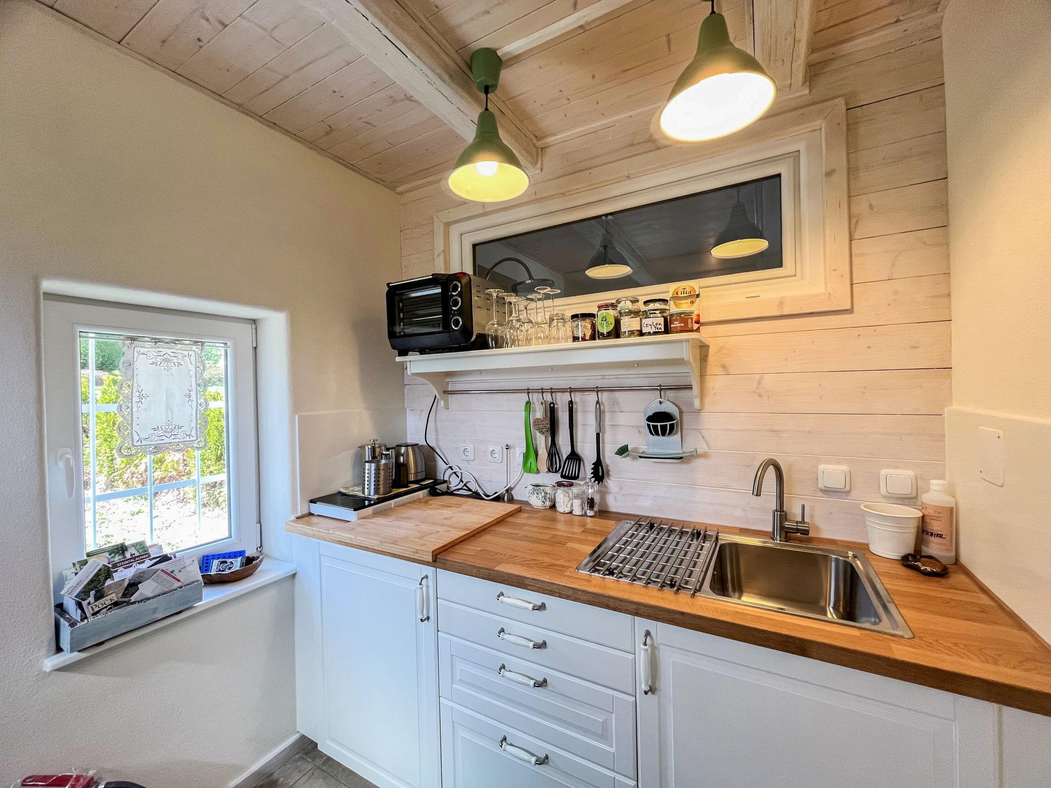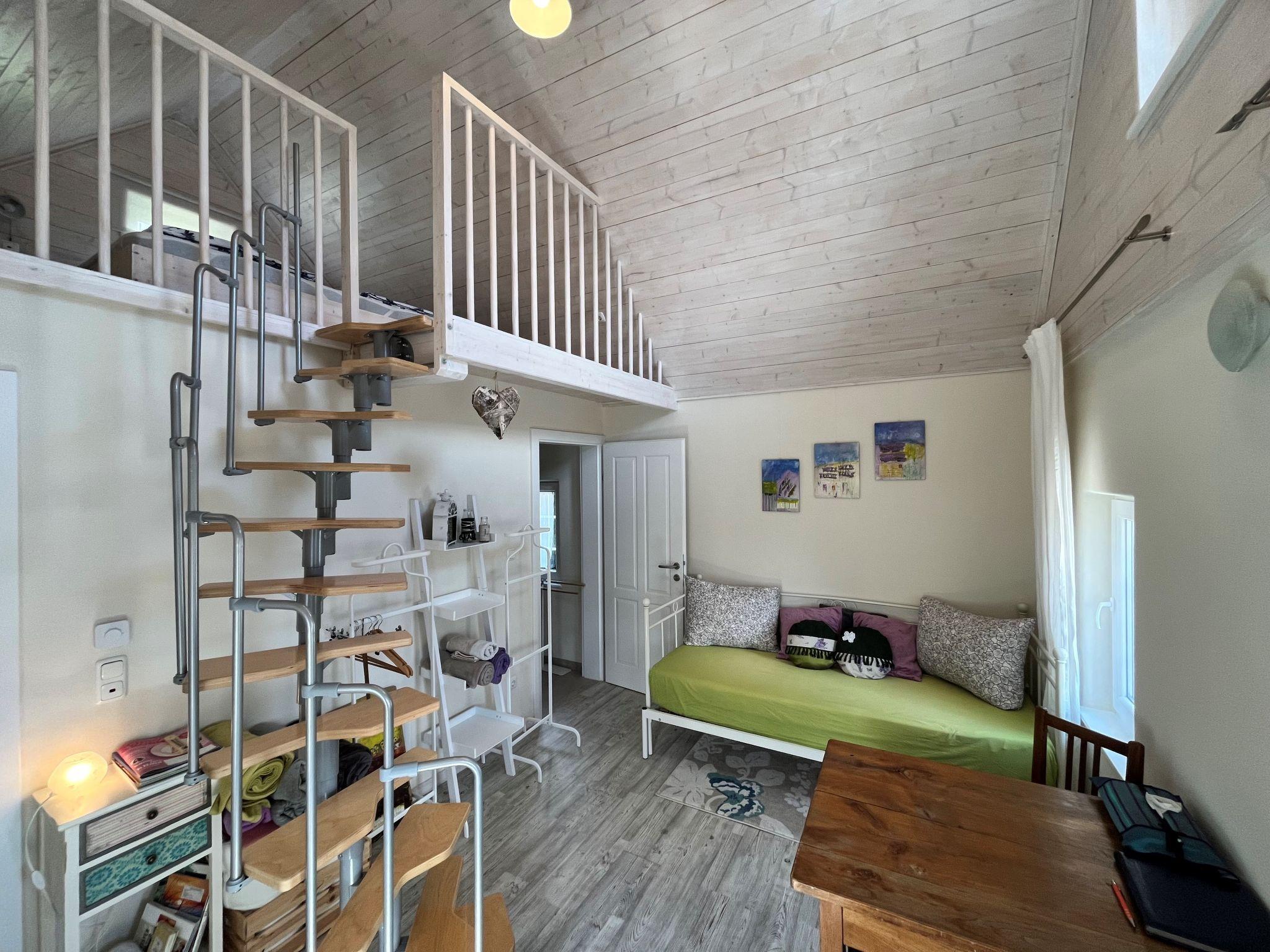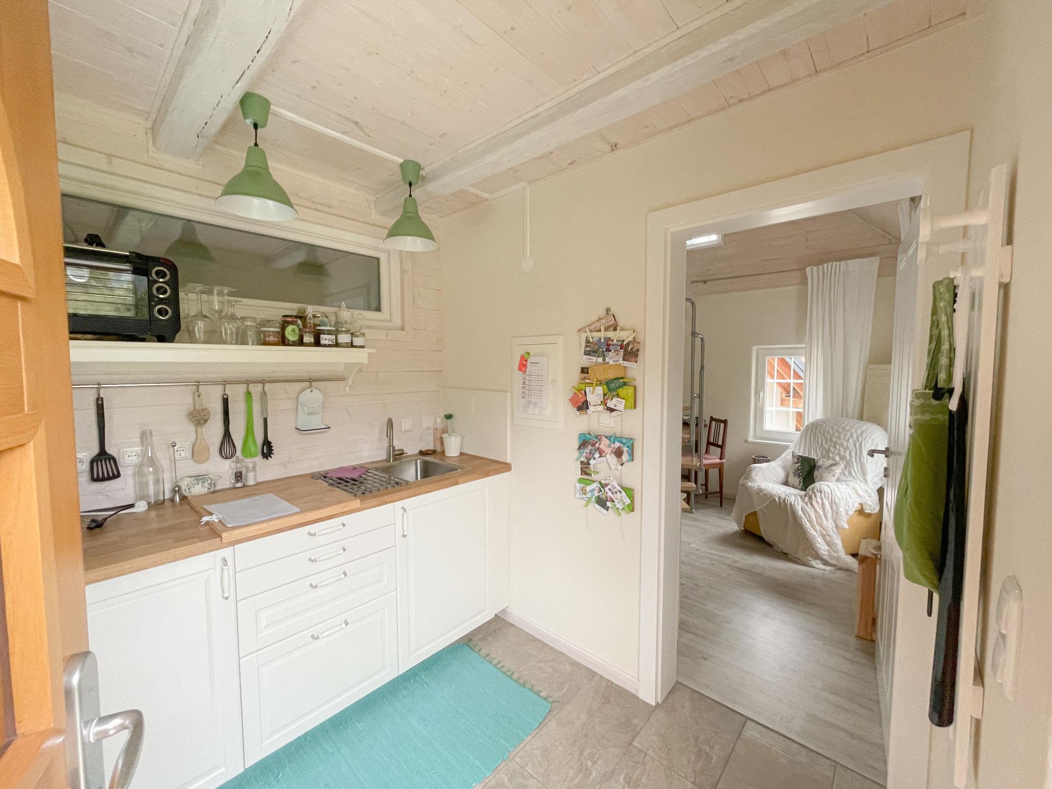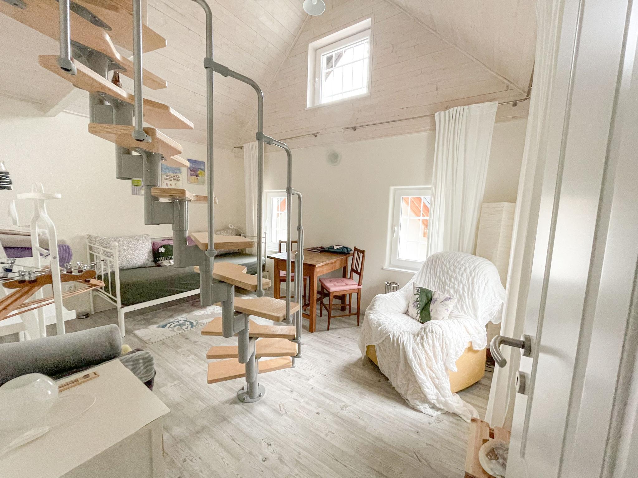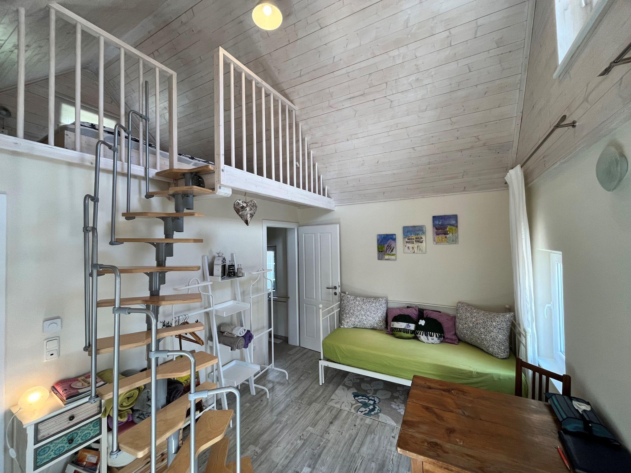 1-room house 33 m2, on the upper ground floor. Object suitable for 2 adults. Partly with sloping ceilings, renovated in 2021, tasteful and cosy furnishings: living/dining room with dining table and shower/WC. Gallery with sloping ceilings with 1 double bed. Kitchenette in the entrance (mini-oven, 2 induction hot plates, kettle). Parquet floors. Facilities: baby cot for up to 2 year olds, hair dryer. Internet (WiFi, free). Please note: non-smoking house. Maximum 1 pet/ dog allowed. Instead of an enclosed bedroom, some sleeping areas are located in an open-plan area (gallery, alcove, etc.).