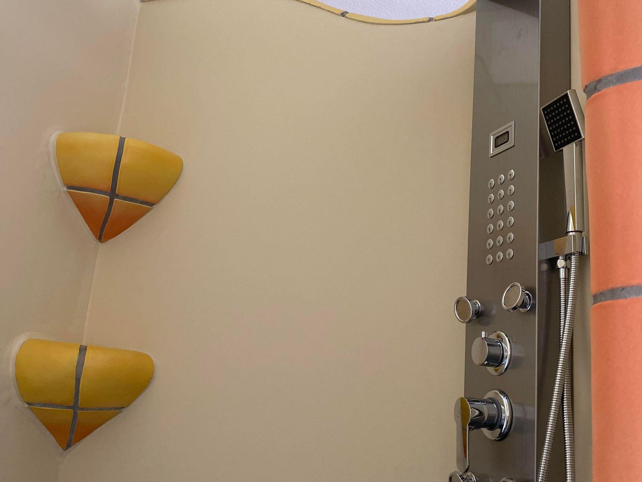• Das Badezimmer verfügt über eine Badewanne, Dusche und Doppelwaschbecken.