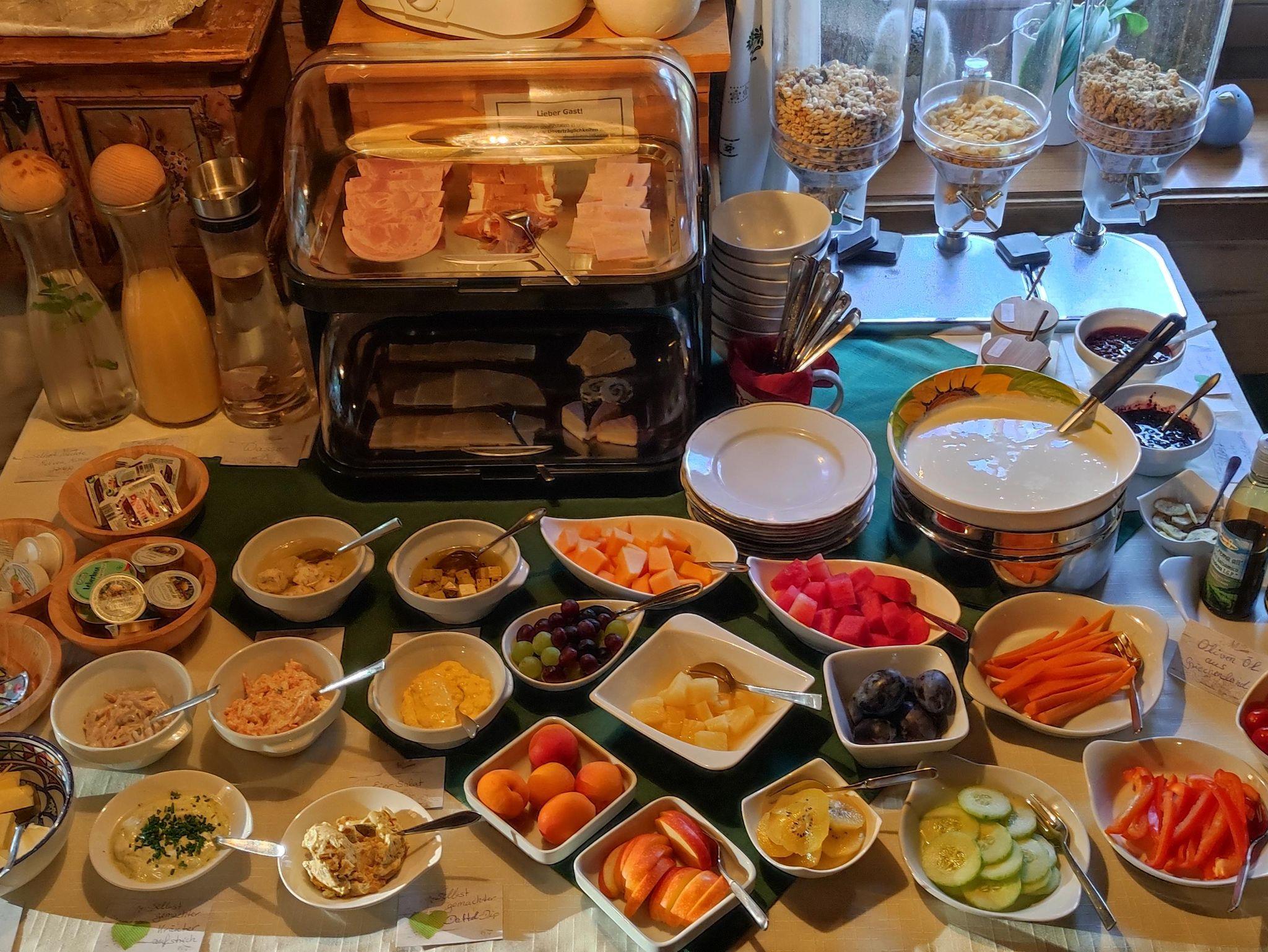 Frühstücksbuffet mit viel selbstgemachten Produkten aus eigener Erzeugung w.z.b.Marmelade,Butter,Brot genießen Sie in unsere alten Bauernstube,die sich auch gut eignet für gemütlichen Stunden.