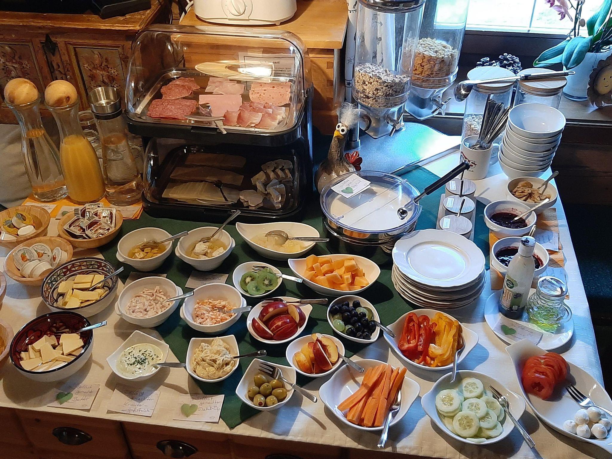 Frühstücksbuffet mit viel selbstgemachten Produkten aus eigener Erzeugung w.z.b.Marmelade,Butter,Brot genießen Sie in unsere alten Bauernstube,die sich auch gut eignet für gemütlichen Stunden.