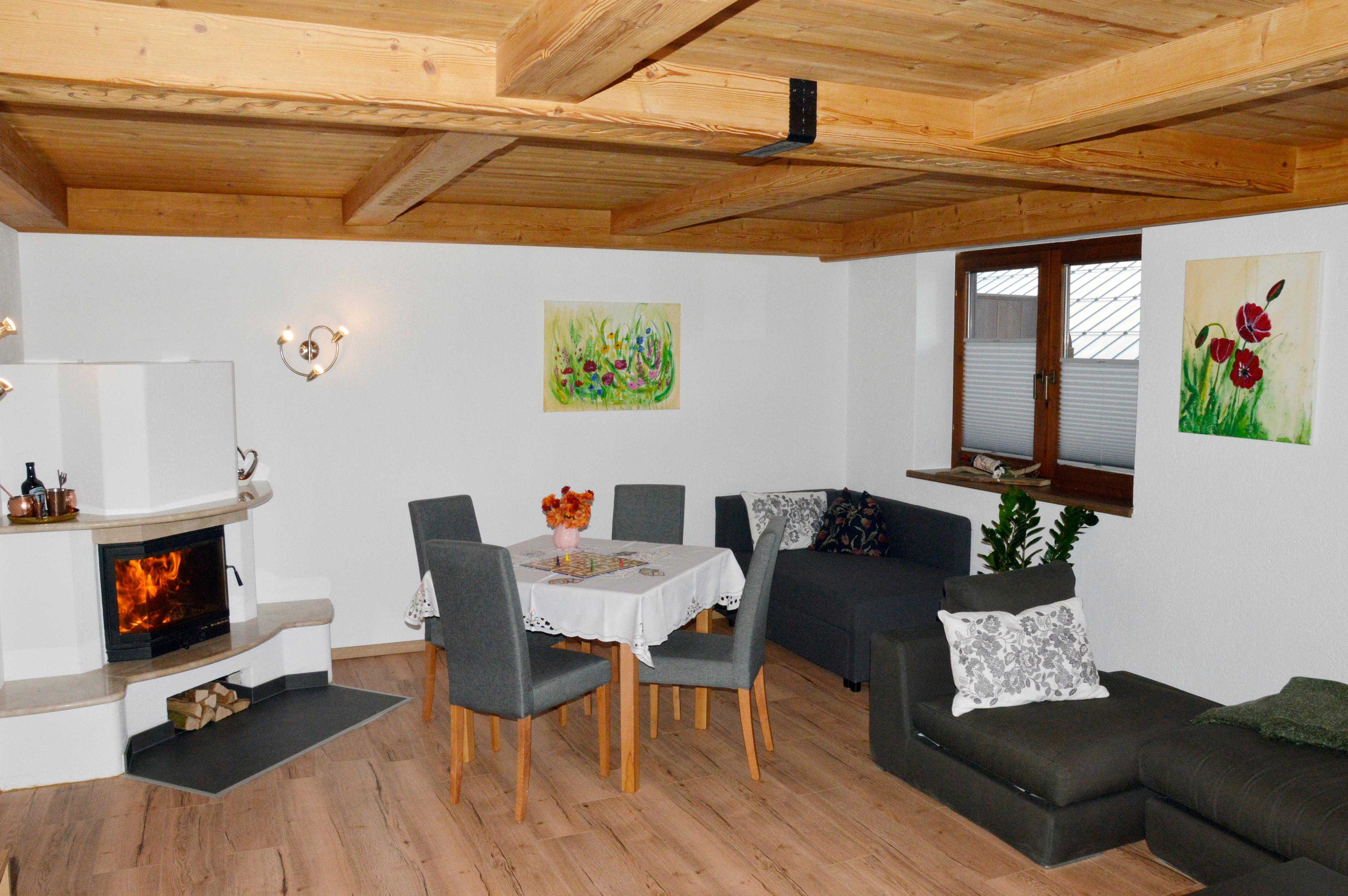 Gemütliches Wohnzimmer mit Kachelofen und einem Ausziehbett; neue Küche mit großzügiger Sitzgarnitur; Kinderzimmer mit einem sehr hochwertigem Etagenbett und einem Ausziehbett; Elternschlafzimmer mit Doppelbett in Comforthöhe; Badezimmer mit Dusche, WC und Waschbecken; separates WC; Abstellraum; Keller. Böden: Fliese und Korkböden im Wohnzimmer und den Schlafzimmern.