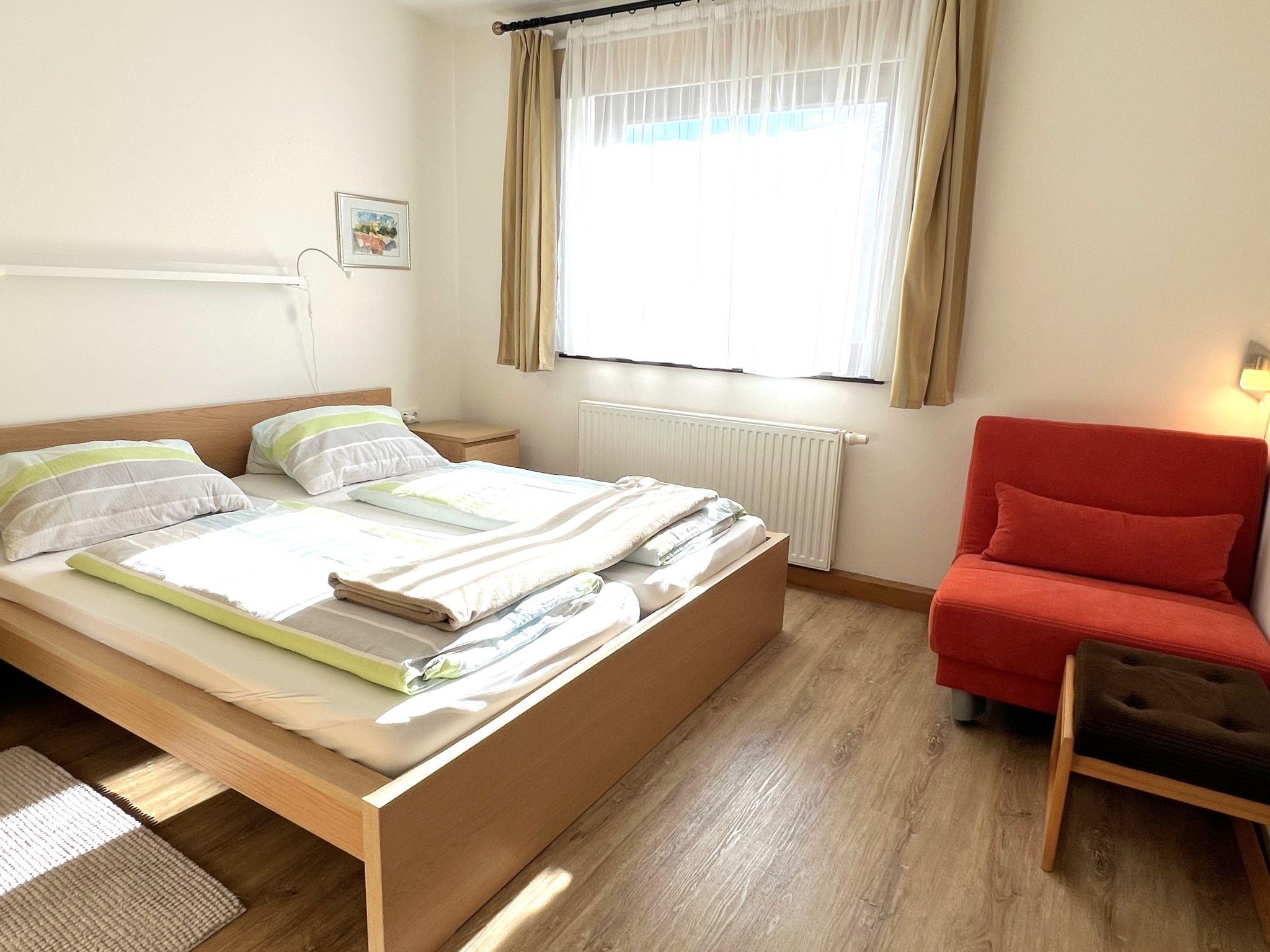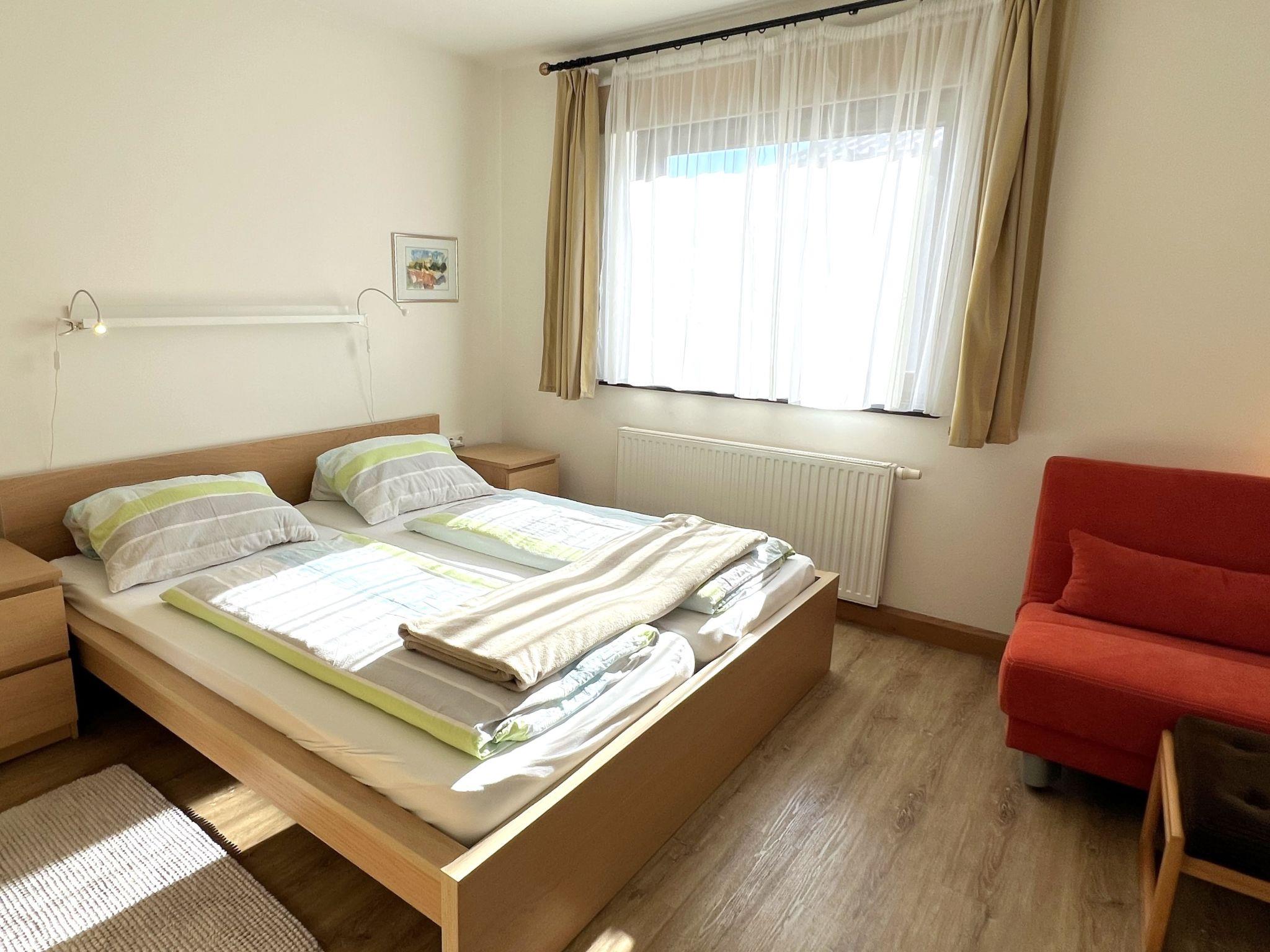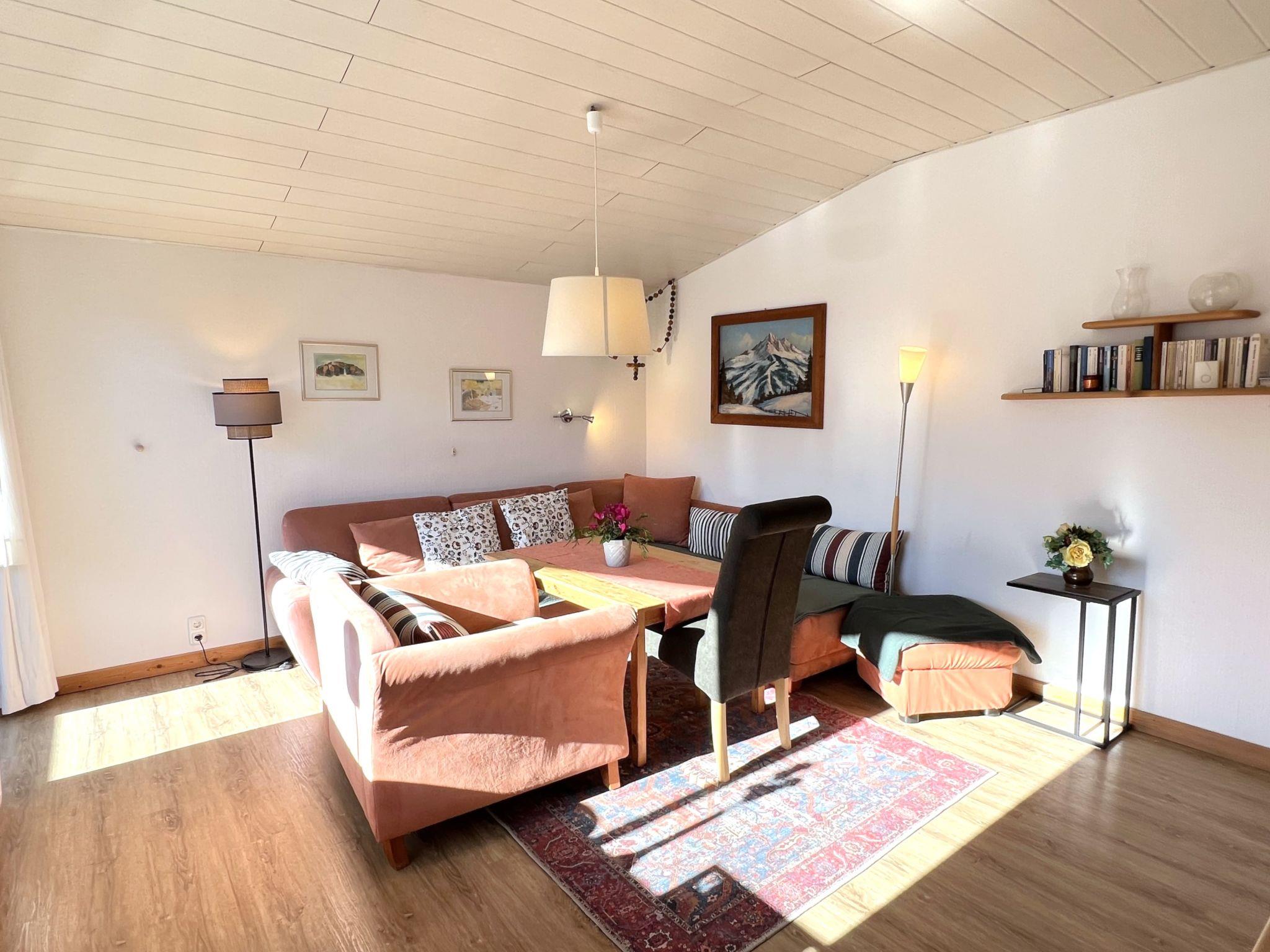 3-room apartment 70 m2 on 1st floor. Spacious and bright, cosy furnishings: 1 room with 1 double bed (2 x 90 cm, length 200 cm), 1 sleeping facility (90 cm, length 200 cm). 1 room with 2 beds (90 cm, length 200 cm). Living room with TV and flat screen. Kitchen (oven, 4 ceramic glass hob hotplates, toaster, kettle, electric coffee machine) with dining table. Shower, sep. WC. Balcony. Very beautiful panoramic view of the mountains. Facilities: Internet (WiFi, free). Parking (1 car). Please note: suitable for families. Non-smokers only. Smoke alarm.