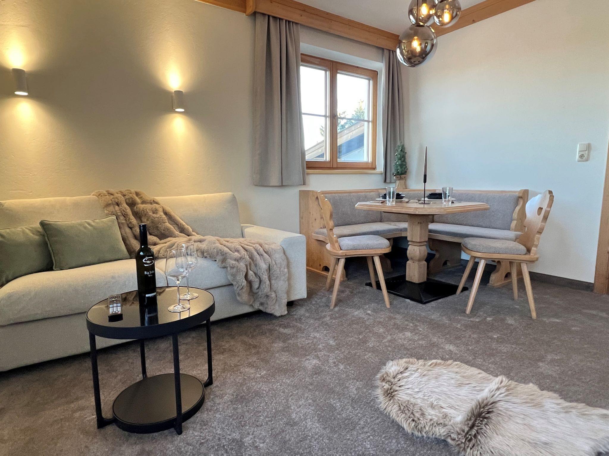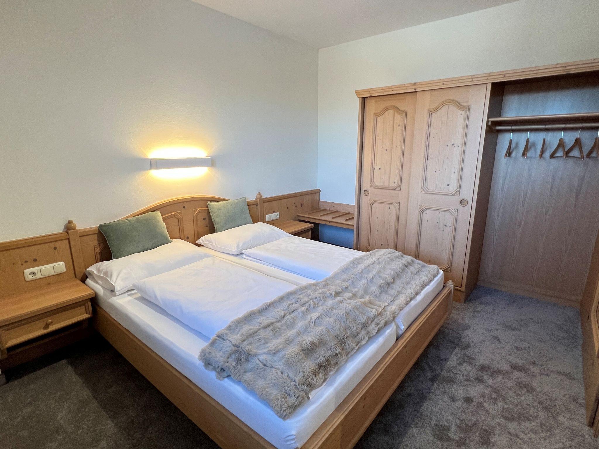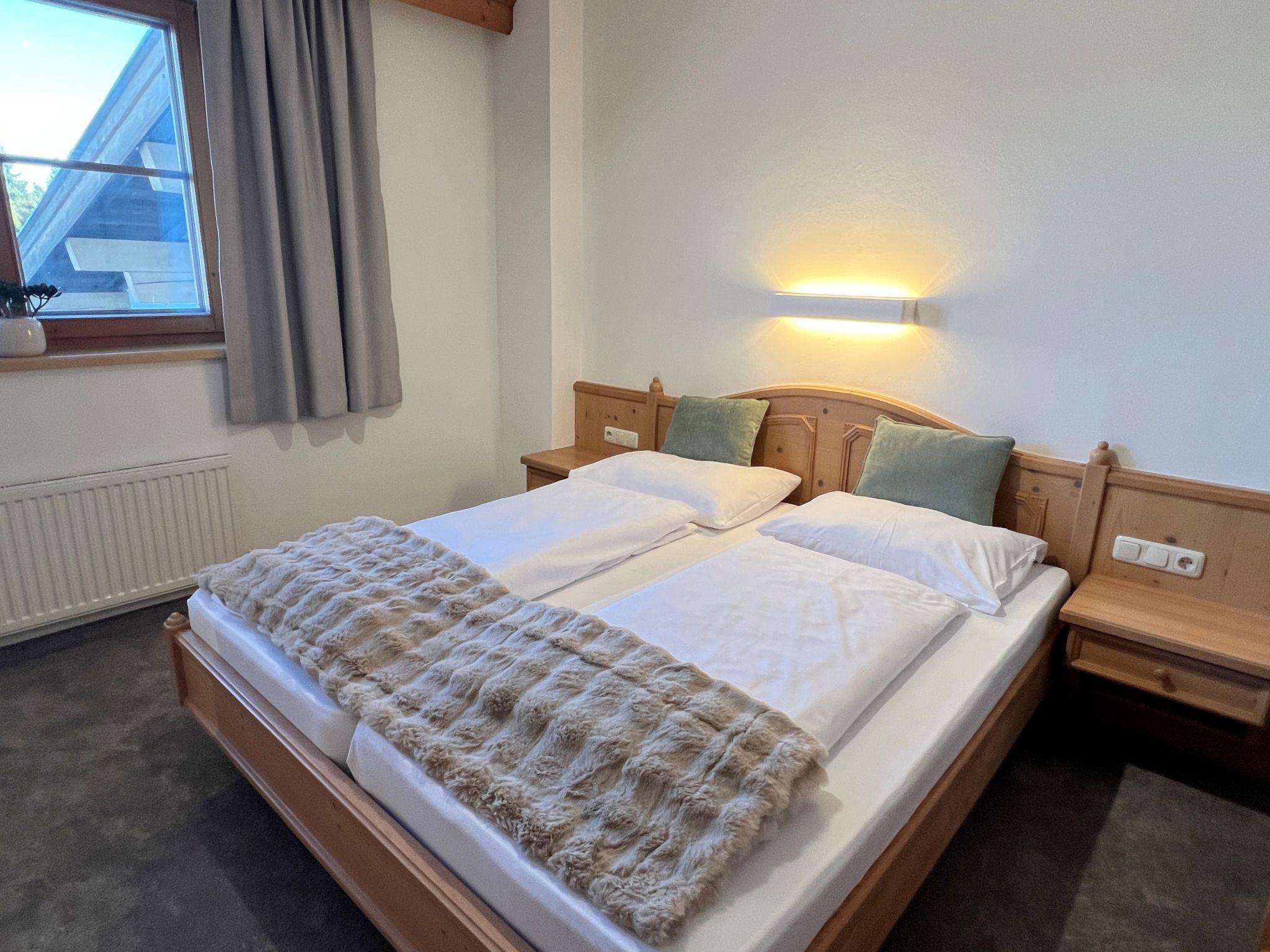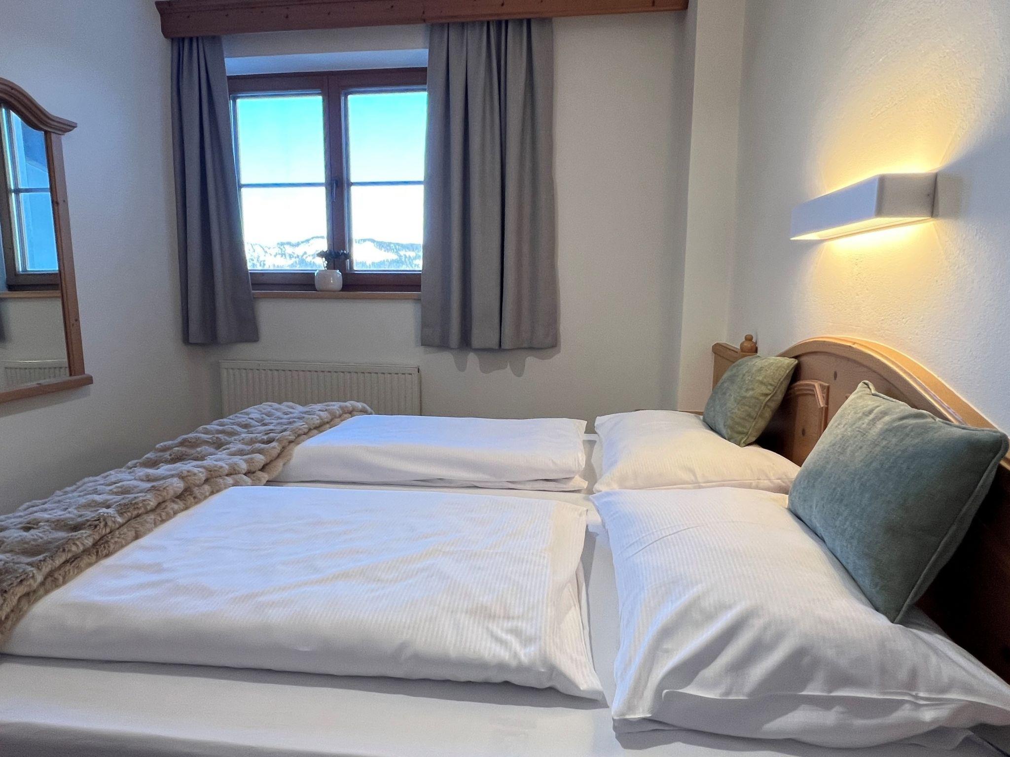 "Fellhorn", 2-room apartment 48 m2, on the ground floor. Cosy furnishings: 1 room with 1 double bed (180 cm, length 200 cm). Living room with 1 double sofabed (140 cm, length 200 cm), TV and flat screen. Kitchen (oven, 4 ceramic glass hob hotplates, toaster, kettle, electric coffee machine) with dining table. Sep. WC, bath or shower, double hand-basin. Very beautiful panoramic view of the mountains. Facilities: Internet (WiFi, free). Please note: non-smokers only. Maximum 1 pet/ dog allowed. Smoke alarm. All divan beds are fully functional beds with a slatted frame and mattress.