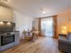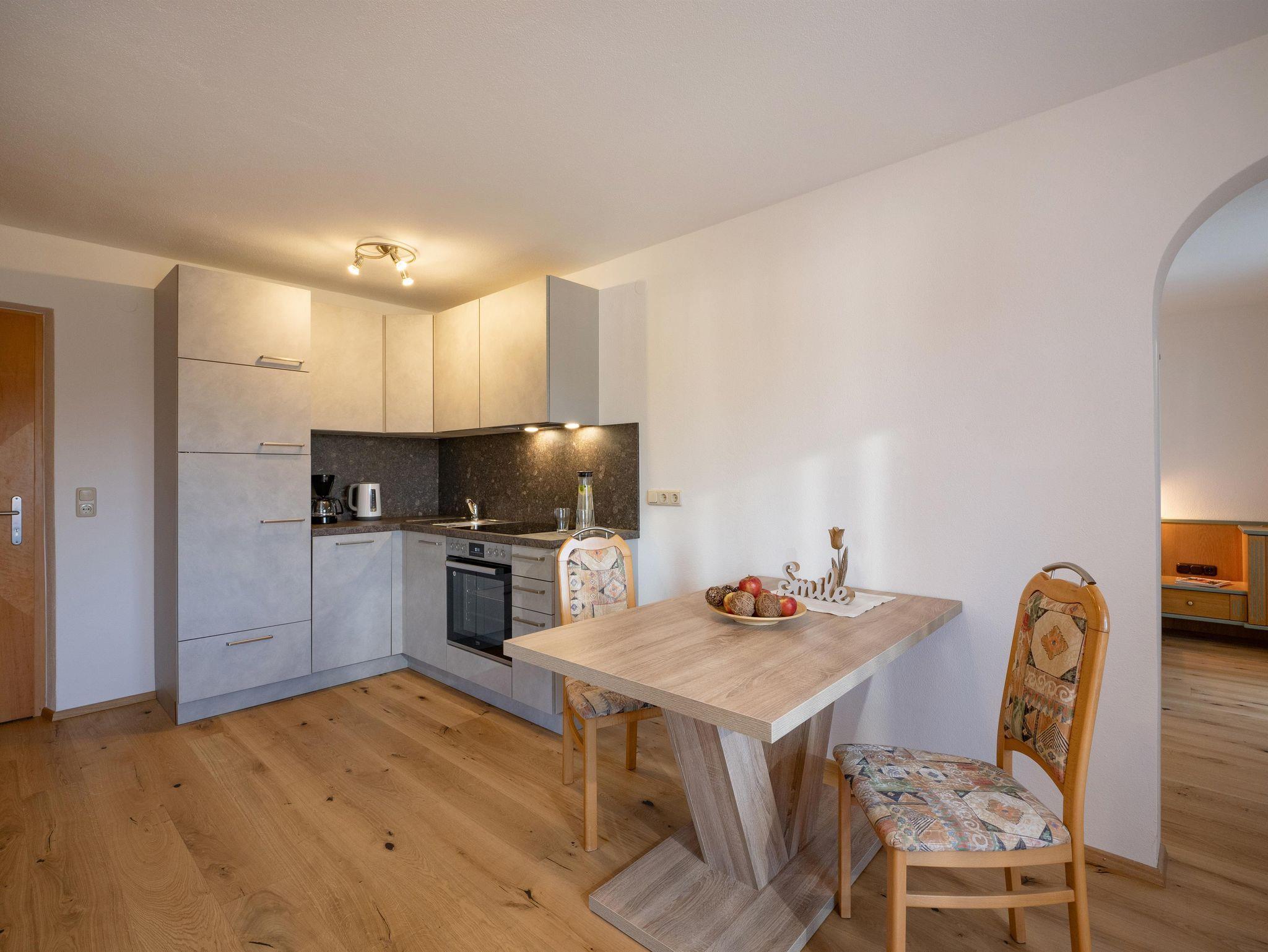 Das Apartment Gartenblick besteht aus einer Wohnküche mit Essecke, Sofa, Kleiderschrank und Balkon mit Blick auf das Kitzbühlerhorn. Der Schlafraum bietet ein Doppelbett, Kleiderschrank, TV und ein kleines Bad mit Dusche/WC. Beide Räume haben Zugang zum Balkon. Es befindet sich im 1. Stock.