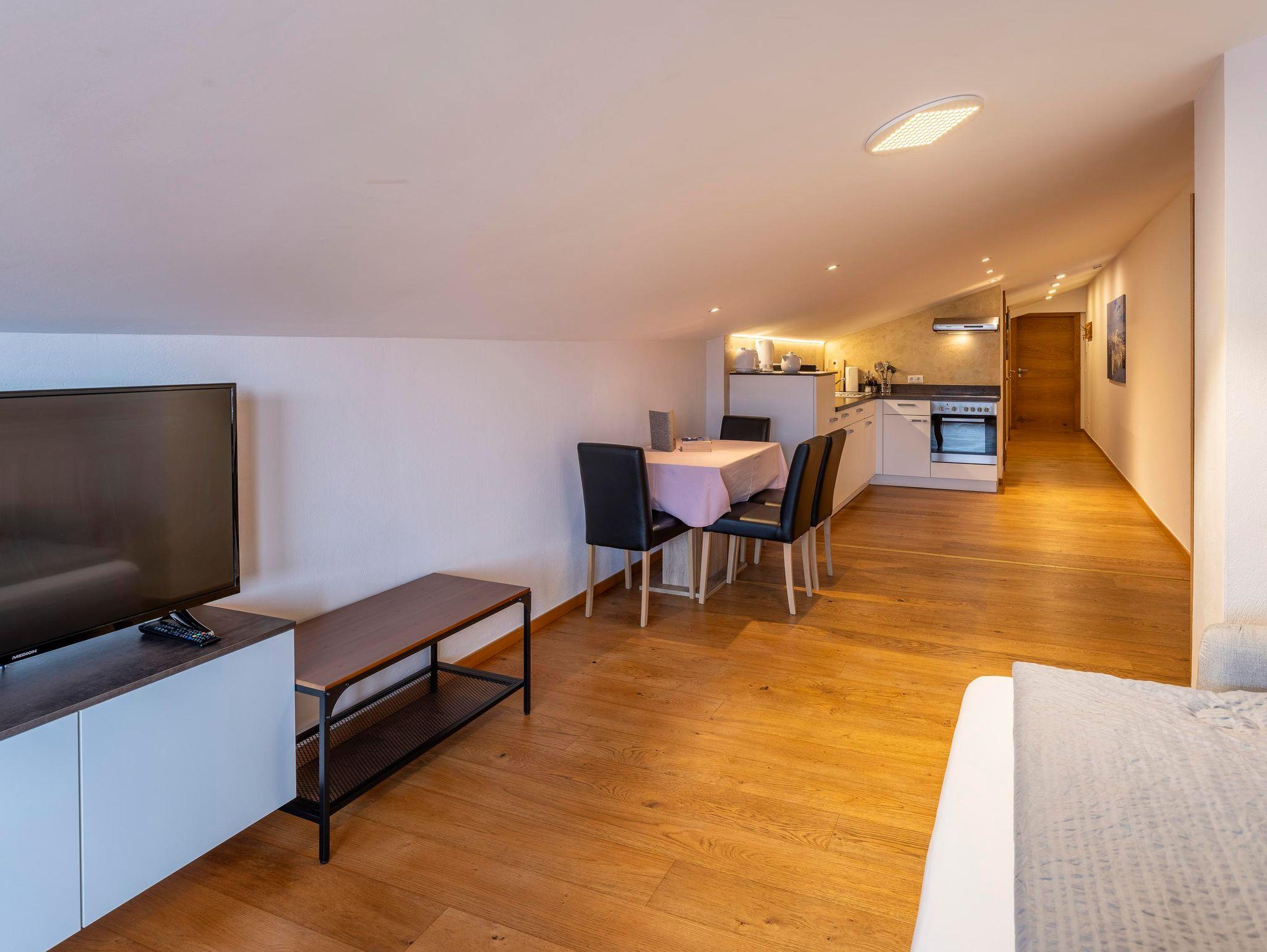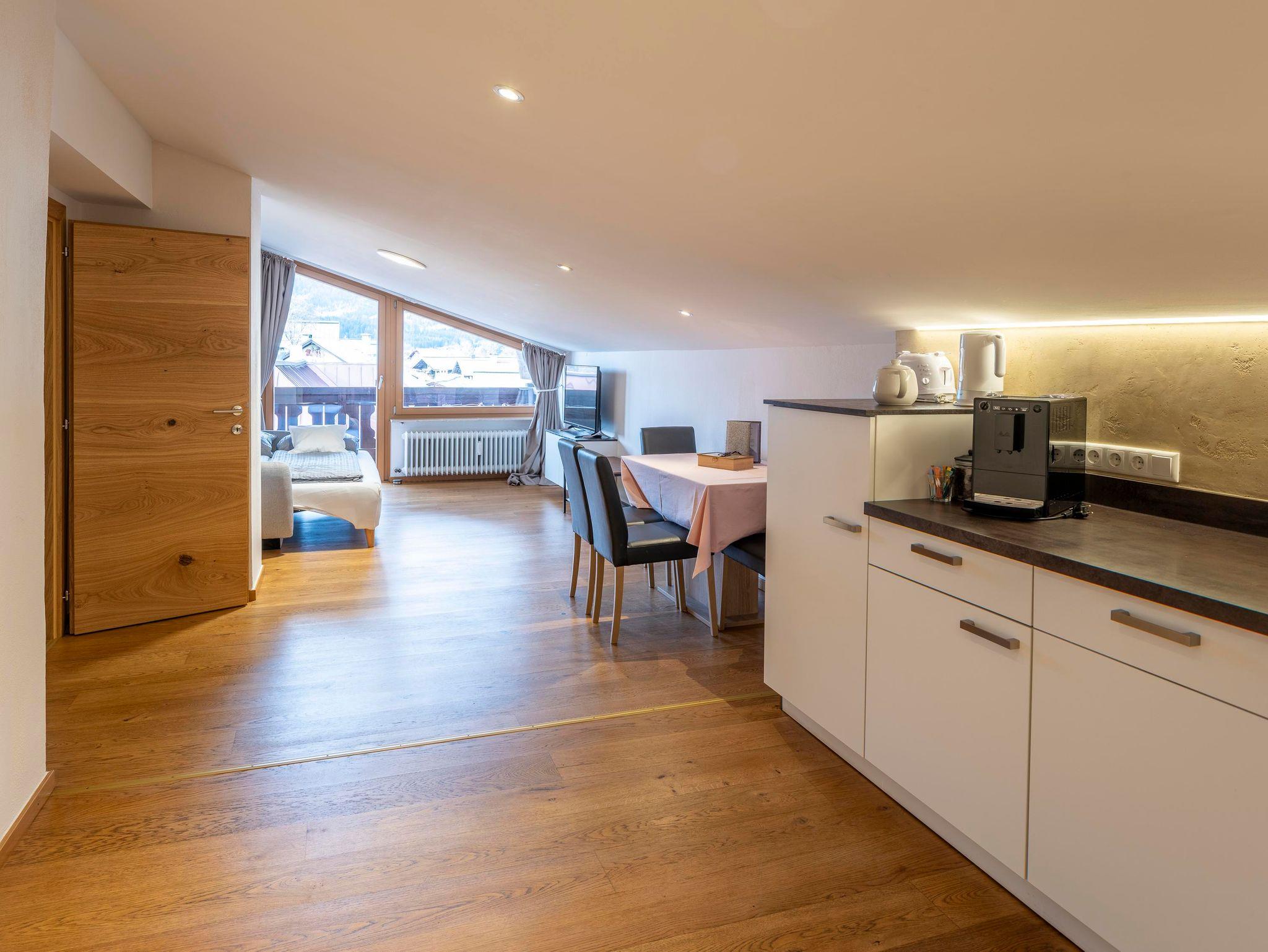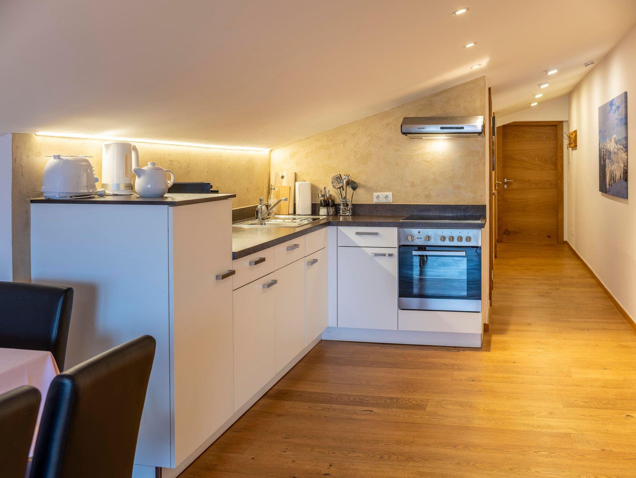 Gemütliches Appartement im Dachgeschoss (80m²) mit wunderschönem Blick auf den Wilden Kaiser. Schlafzimmer mit Doppelbett, Bad mit Dusche & WC, Sauna, WC extra, Küche, Essplatz und Wohnraum mit ausziehbarer Schlafcouch für 2 Personen, Balkon.