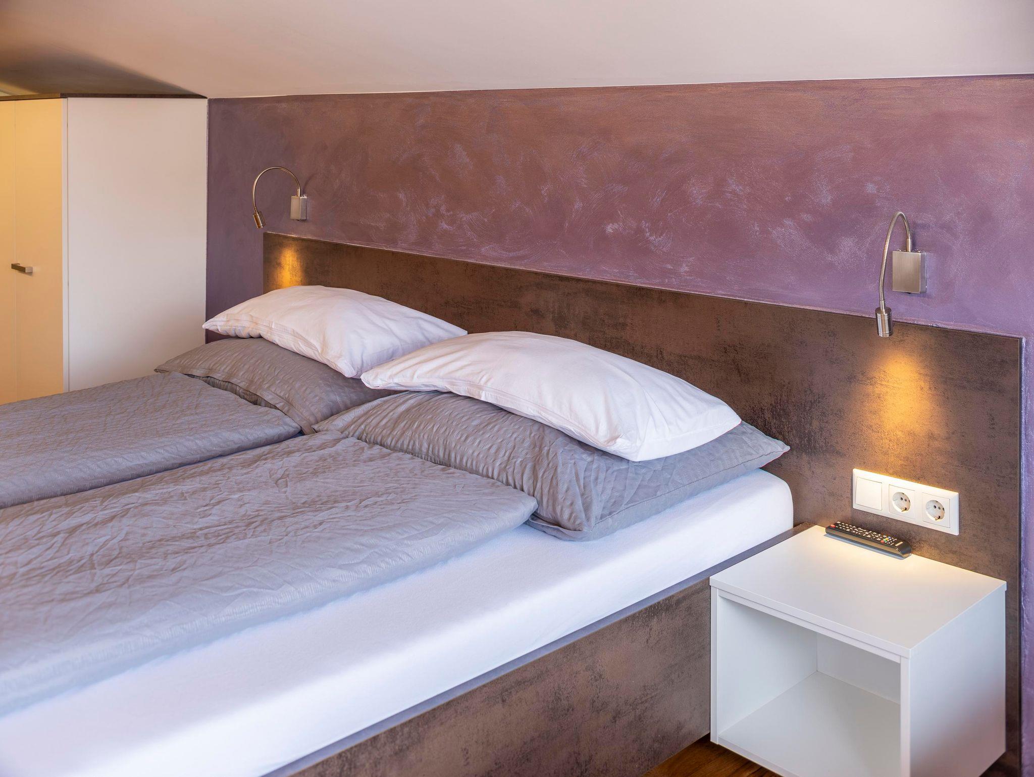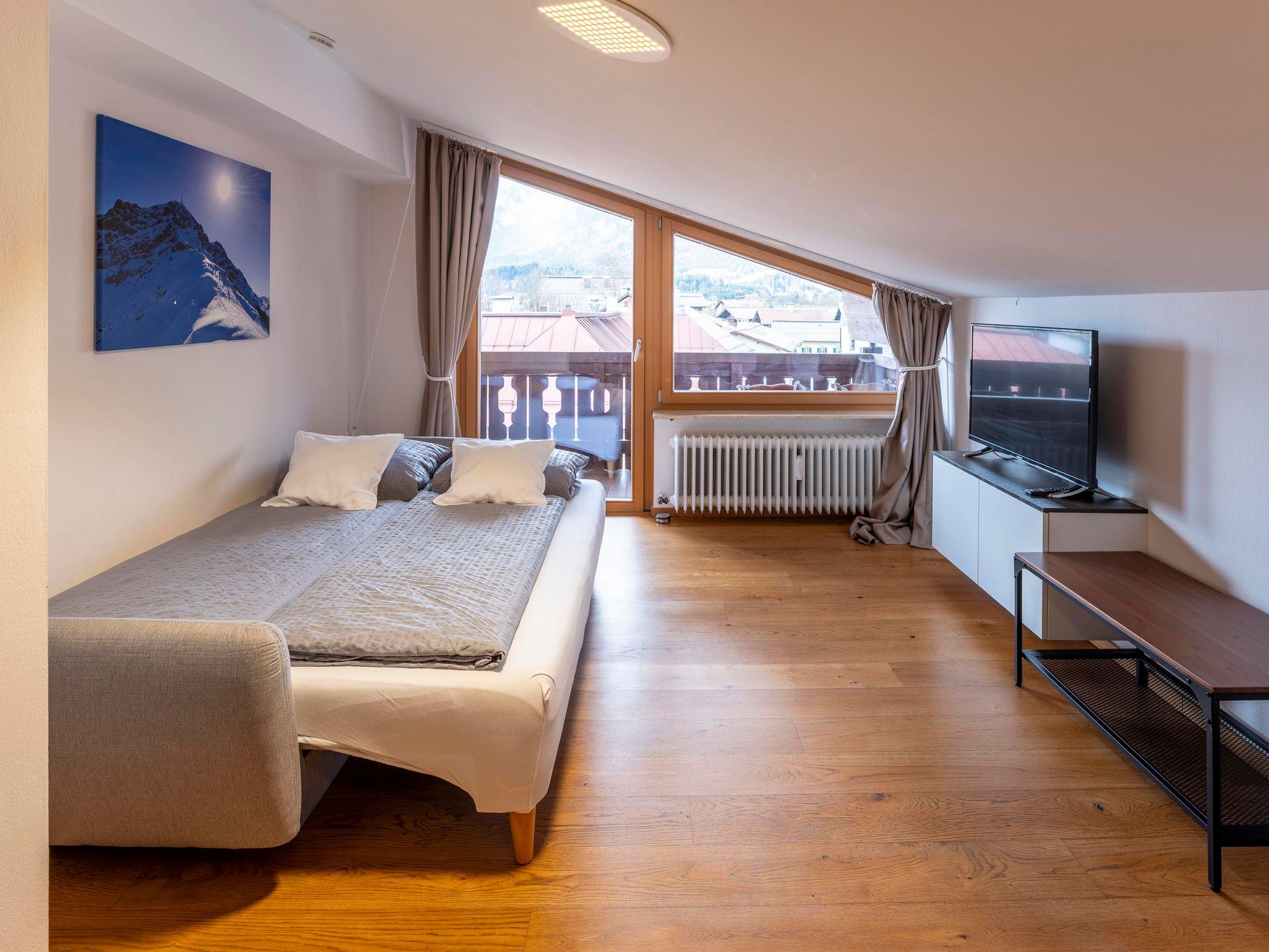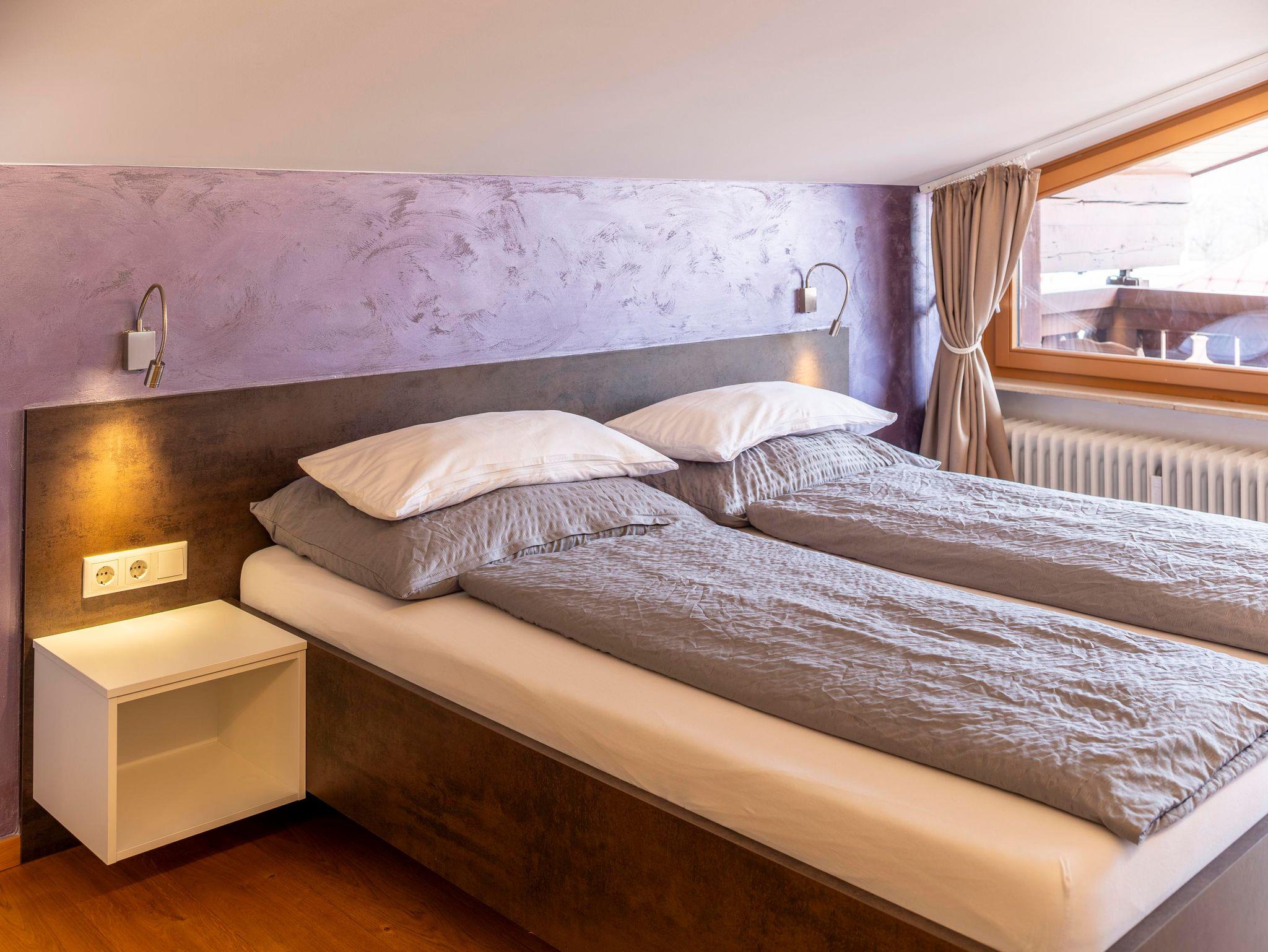 Gemütliches Appartement im Dachgeschoss (80m²) mit wunderschönem Blick auf den Wilden Kaiser. Schlafzimmer mit Doppelbett, Bad mit Dusche & WC, Sauna, WC extra, Küche, Essplatz und Wohnraum mit ausziehbarer Schlafcouch für 2 Personen, Balkon.