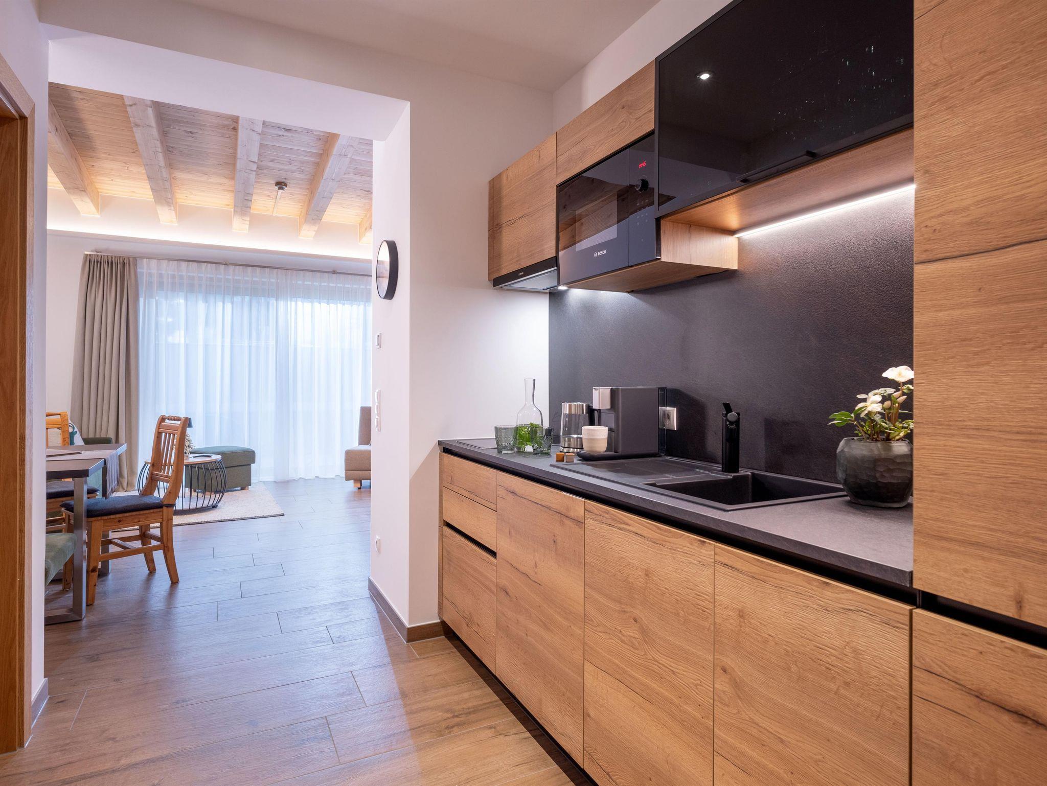 Apartments zum Anfassen Im 2. Stock des Hause befinden sich unsere zweistöckigen Wohnungen mit jeweils 58 m². Auf 20 m2 im Erdgeschoss befindet sich der Wohnbereich mit einer gemütlichen Sitzecke, einer Couch mit Couchtisch, PANASONIC Flatscreen-TV, Küchenzeile und Garderobe. Auf 38 m2 im Oberschoss befindet sich der kuschelige Schlafbereich mit zwei getrennten Schlafzimmern sowie Dusche und WC.