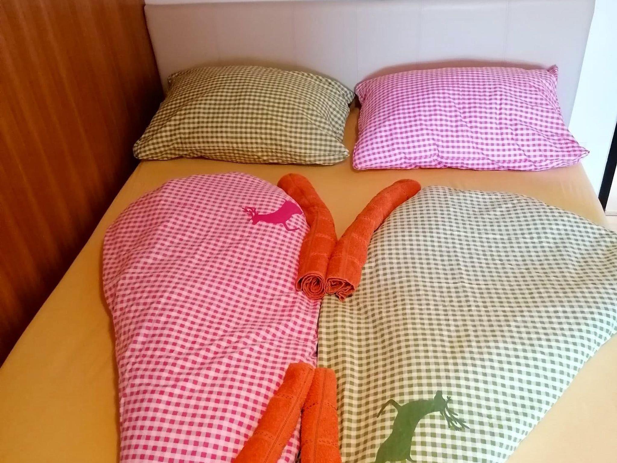 2 Zimmer NICHTRAUCHER-Wohnung,1 Schlafzimmer mit Doppelbett & 2er Sofa Schlaffunktion & 1Wohnzimmer. Im Wohnzimmer befindet sich ein eingebautes Bett im Wandschrank zum Ausklappen(mit Bettzeuglade). Bad mit Badewanne, WC extra, Vorzimmer mit Garderobe,voll ausgestattete Küche, 2 liebevoll gestalltete Balkone (Morgen- & Abendsonne),Balkonausstattung - Essmöglichkeit. Autoabstellplätze vor dem Haus. 1-max.5 Personen/ 2 Erw & 1-3 Kinder oder 3 Erw. & 1-2 Kinder. Wohnung neu 20 renoviert/gestaltet!