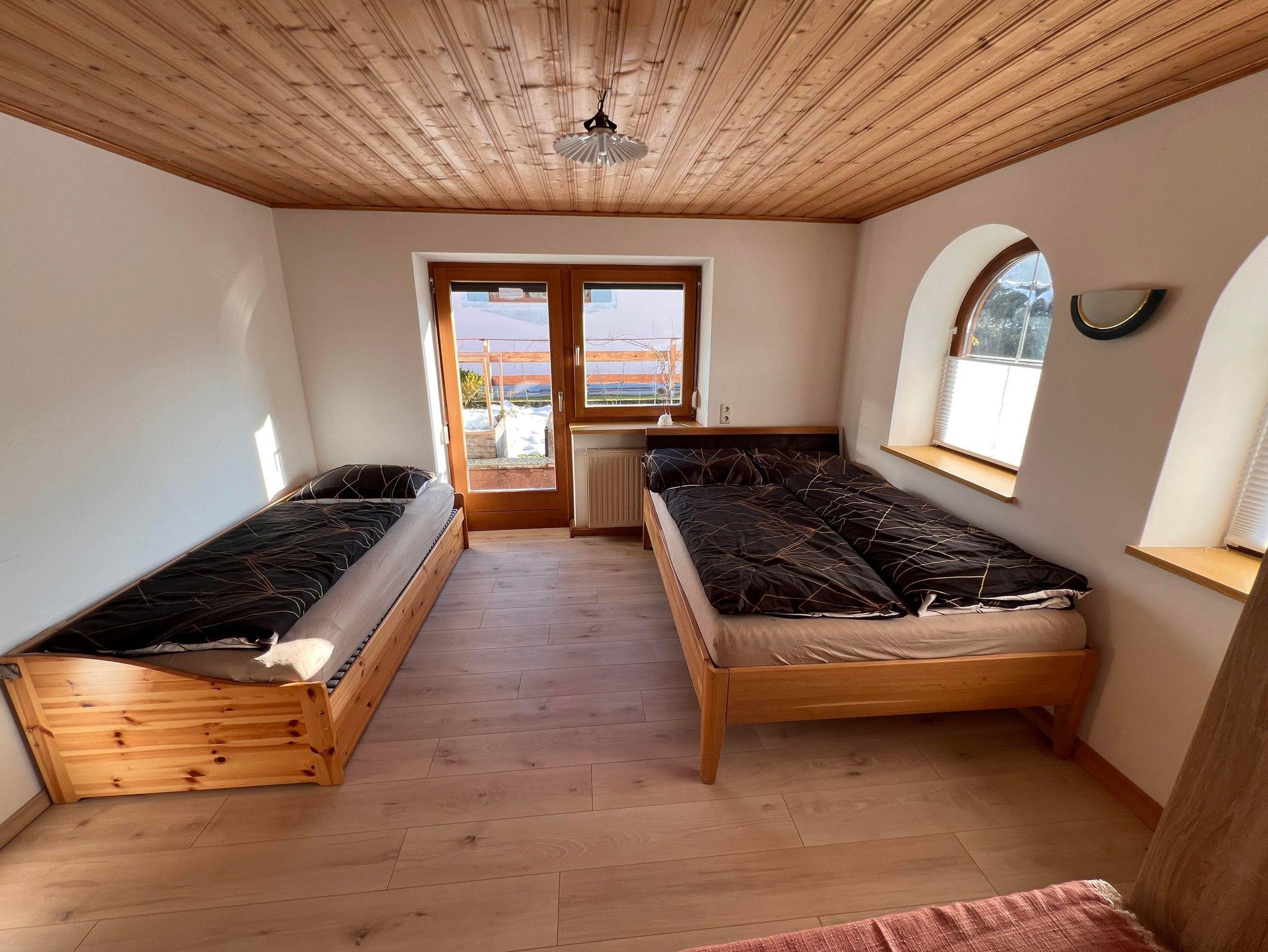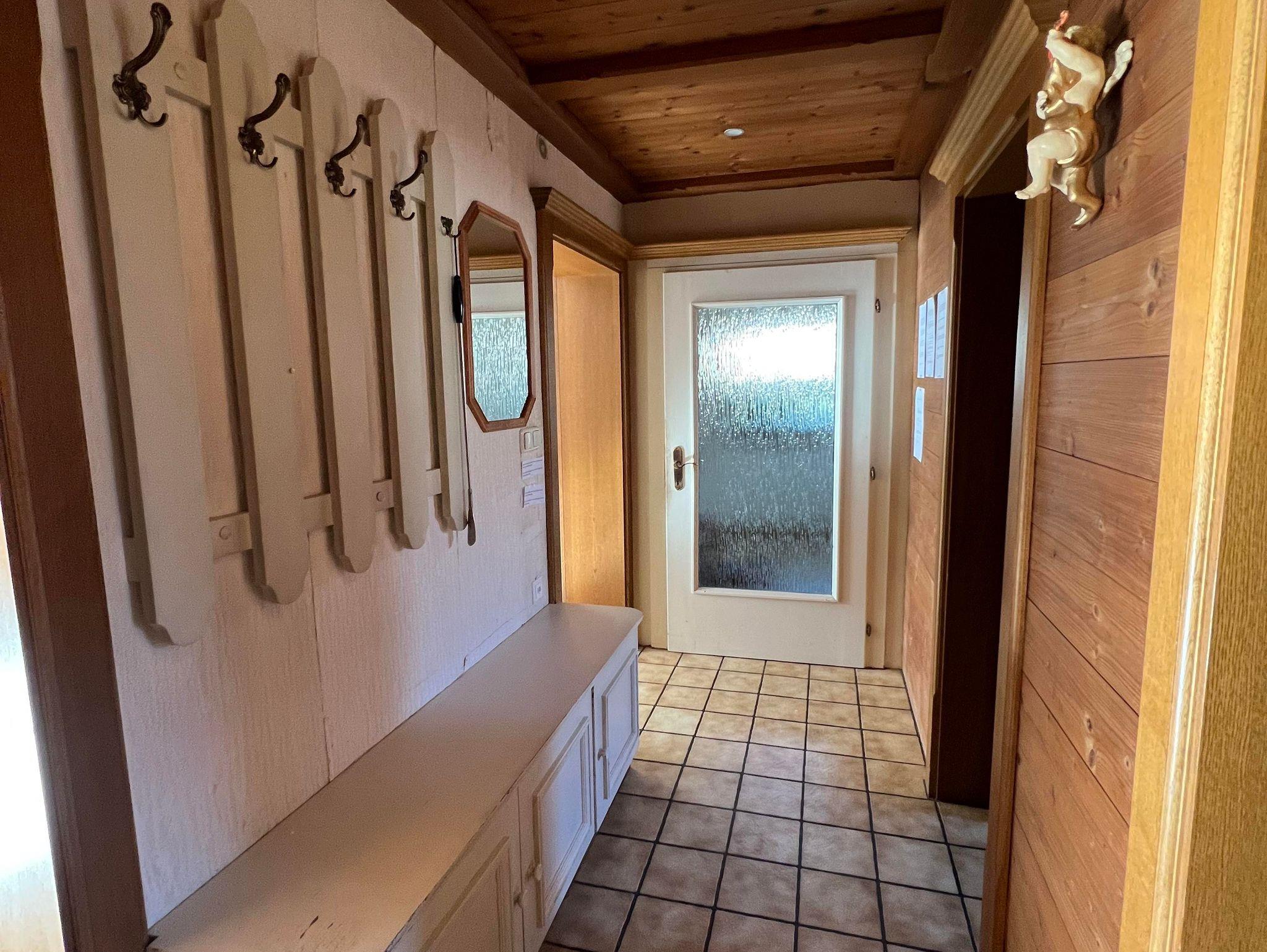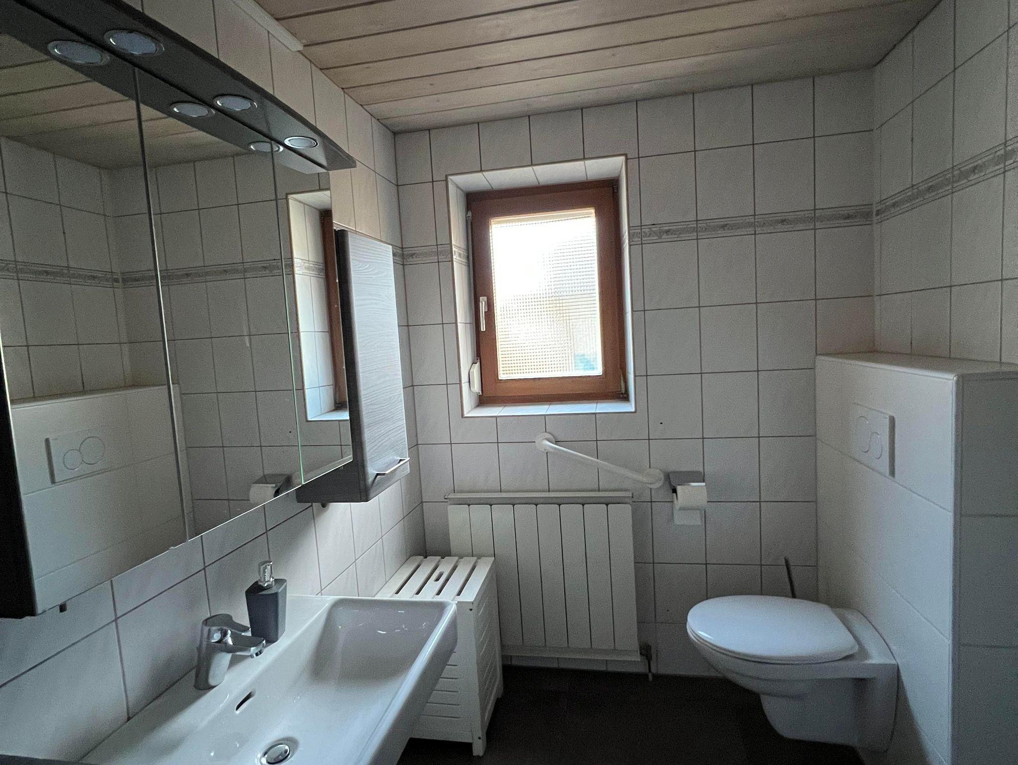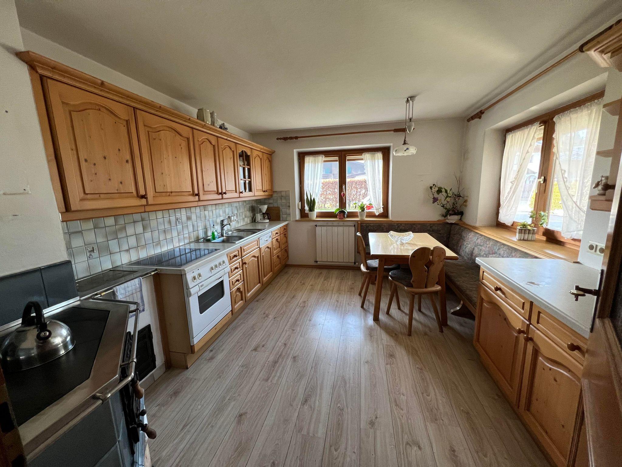 Die Wohnung verfügt über drei Schlafzimmer und eine große, komplett ausgestattete Küche mit Esstisch und zusätzlichem Kachelofen. Das helle Bad bietet Dusche, Waschtisch und WC, ergänzt durch ein separates WC. 2 Parkplätze stehen zur Verfügung