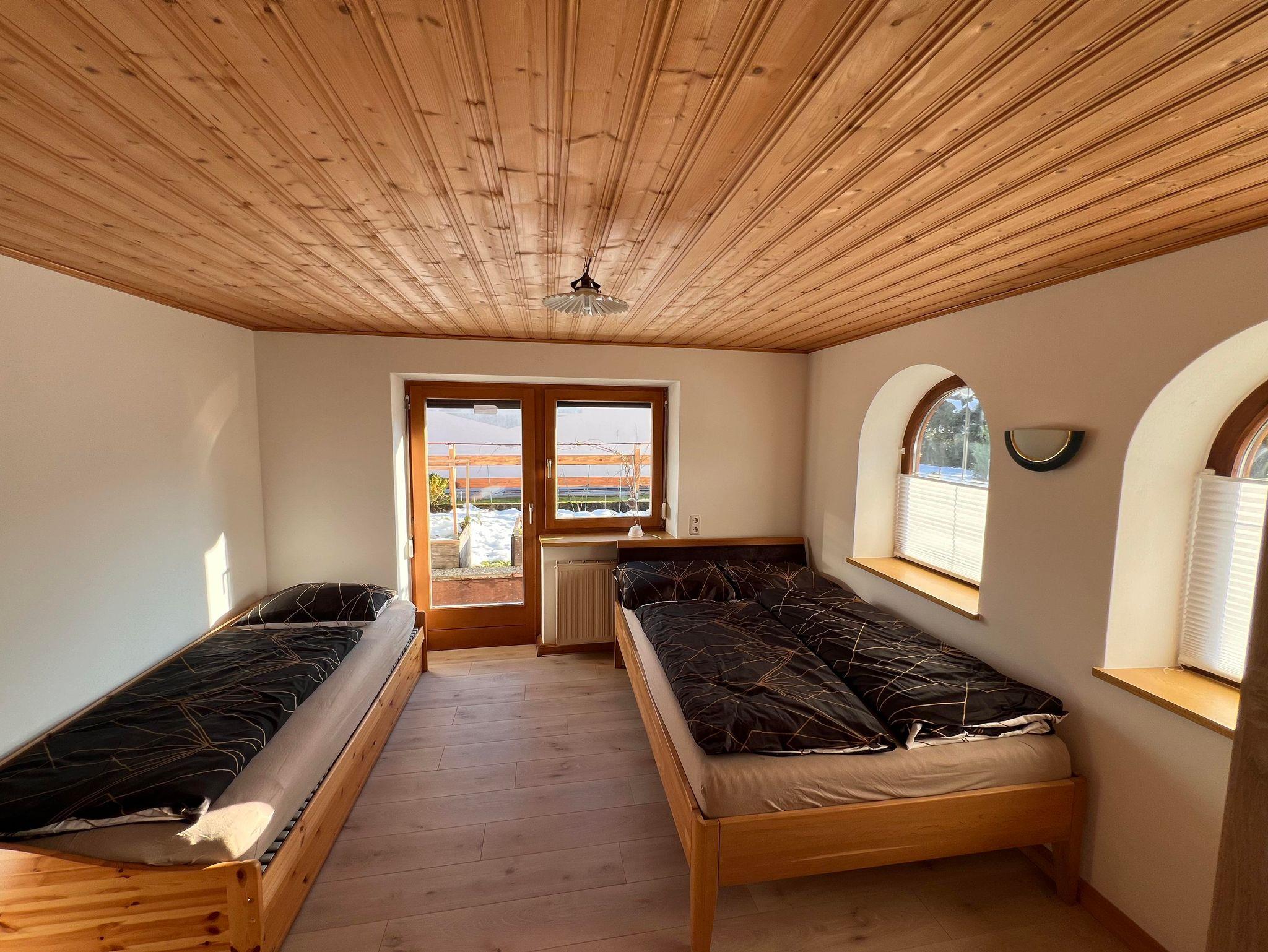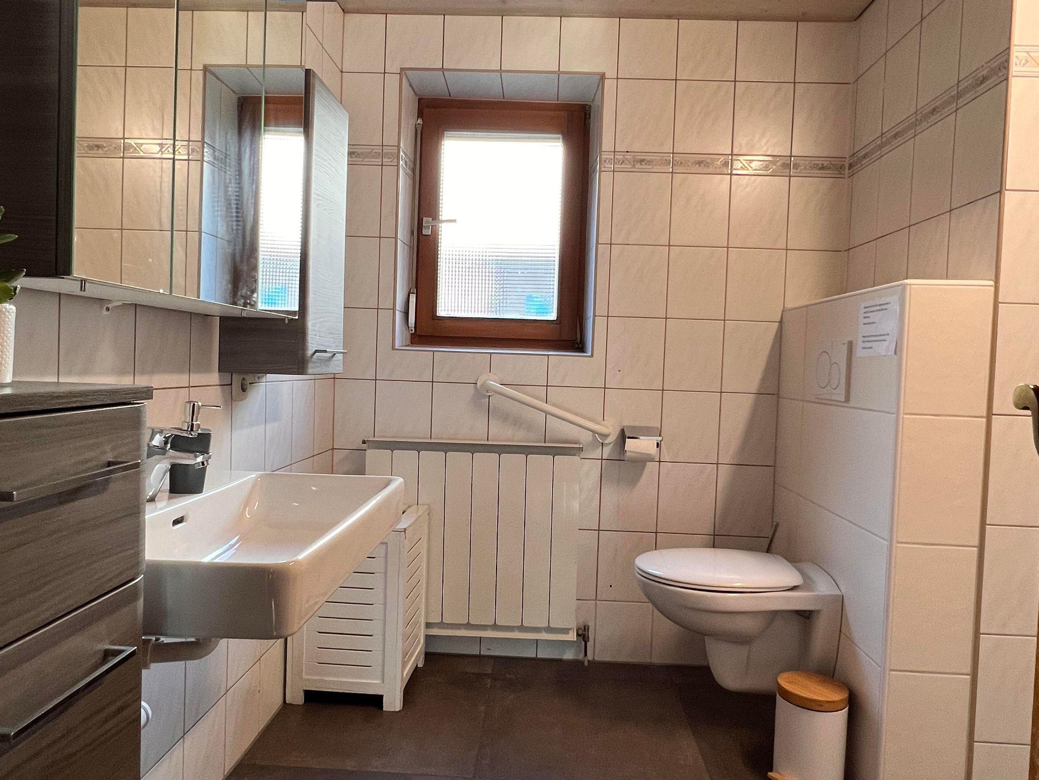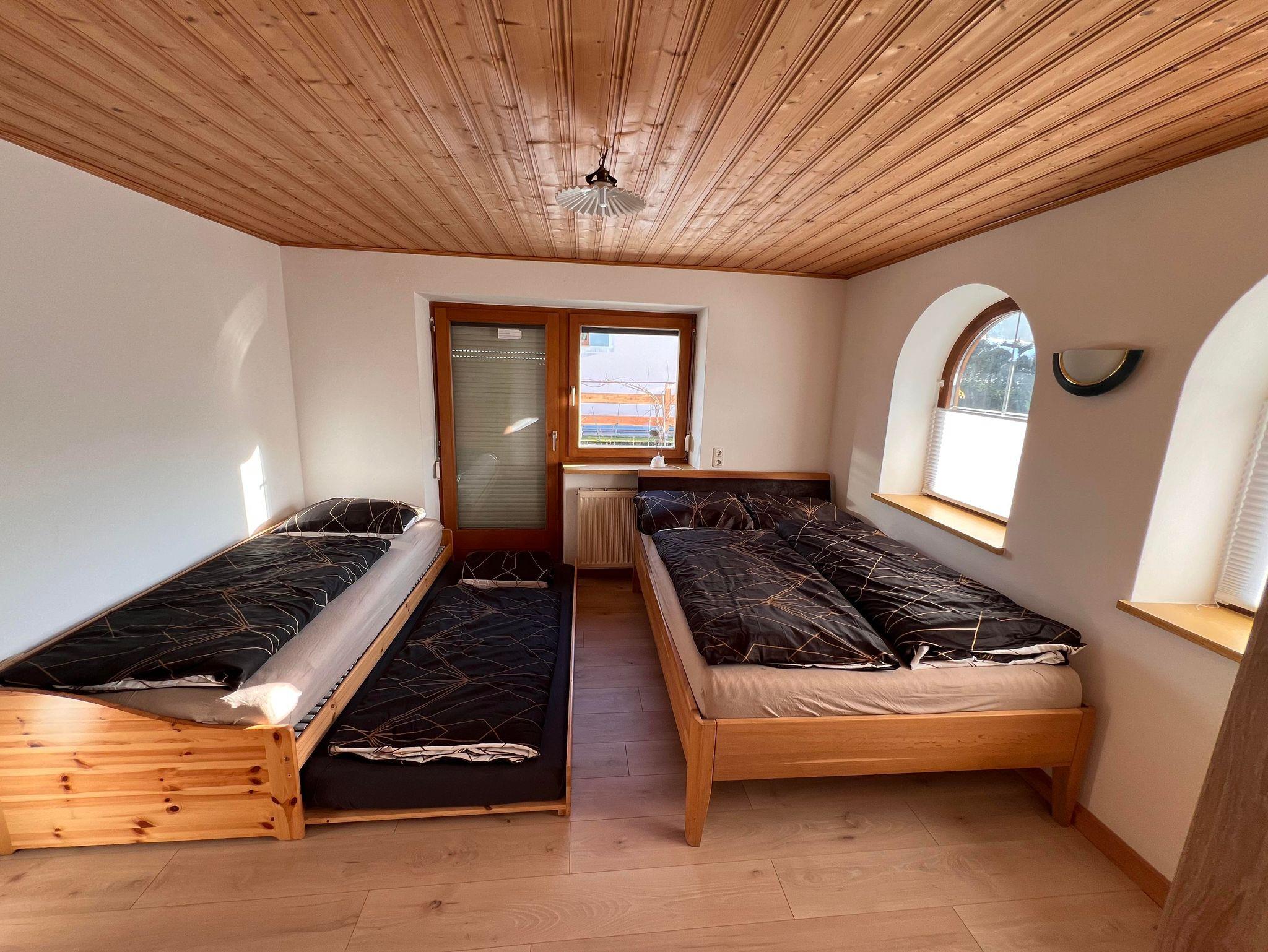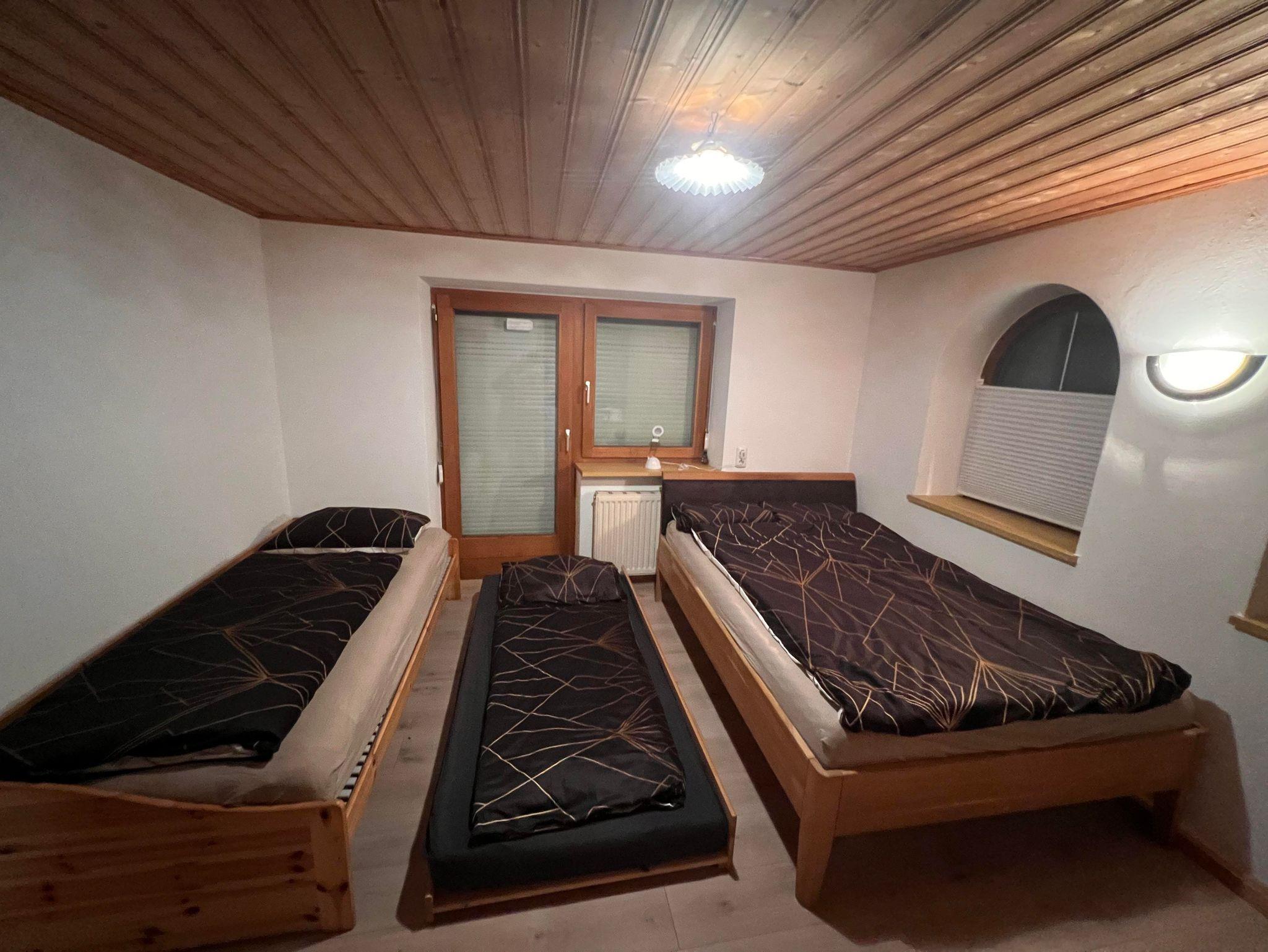 Die Wohnung verfügt über drei Schlafzimmer und eine große, komplett ausgestattete Küche mit Esstisch und zusätzlichem Kachelofen. Das helle Bad bietet Dusche, Waschtisch und WC, ergänzt durch ein separates WC. 2 Parkplätze stehen zur Verfügung