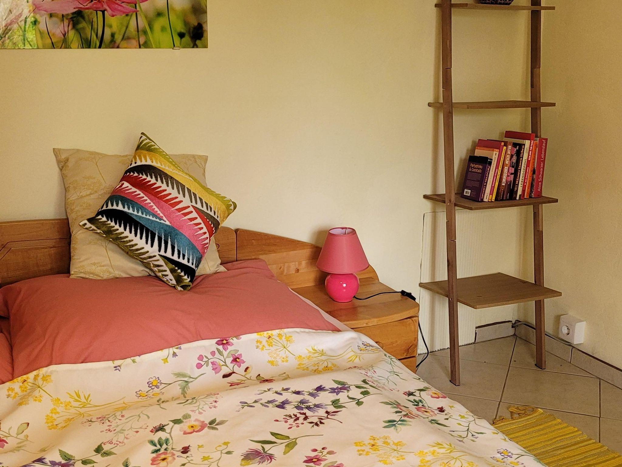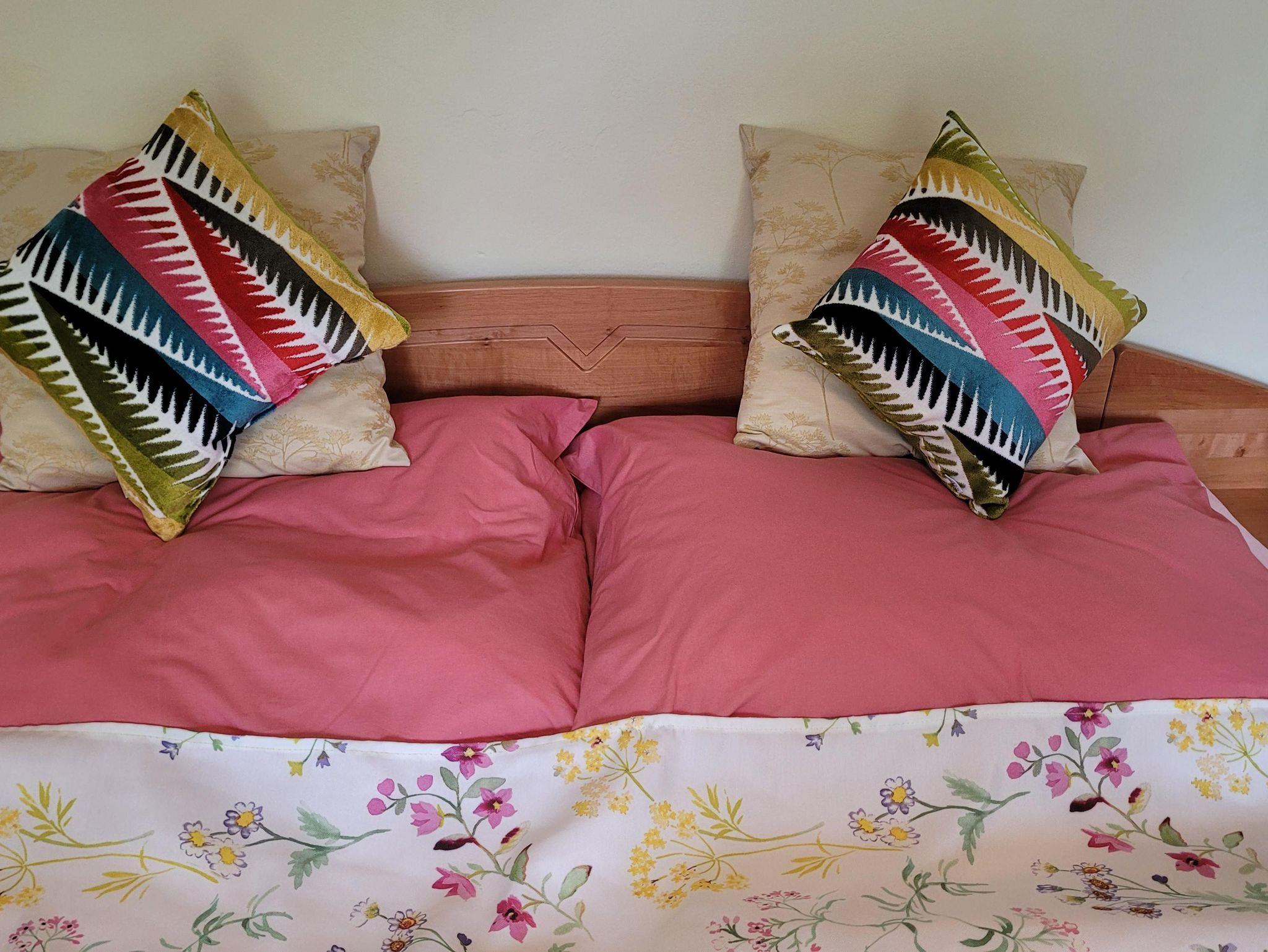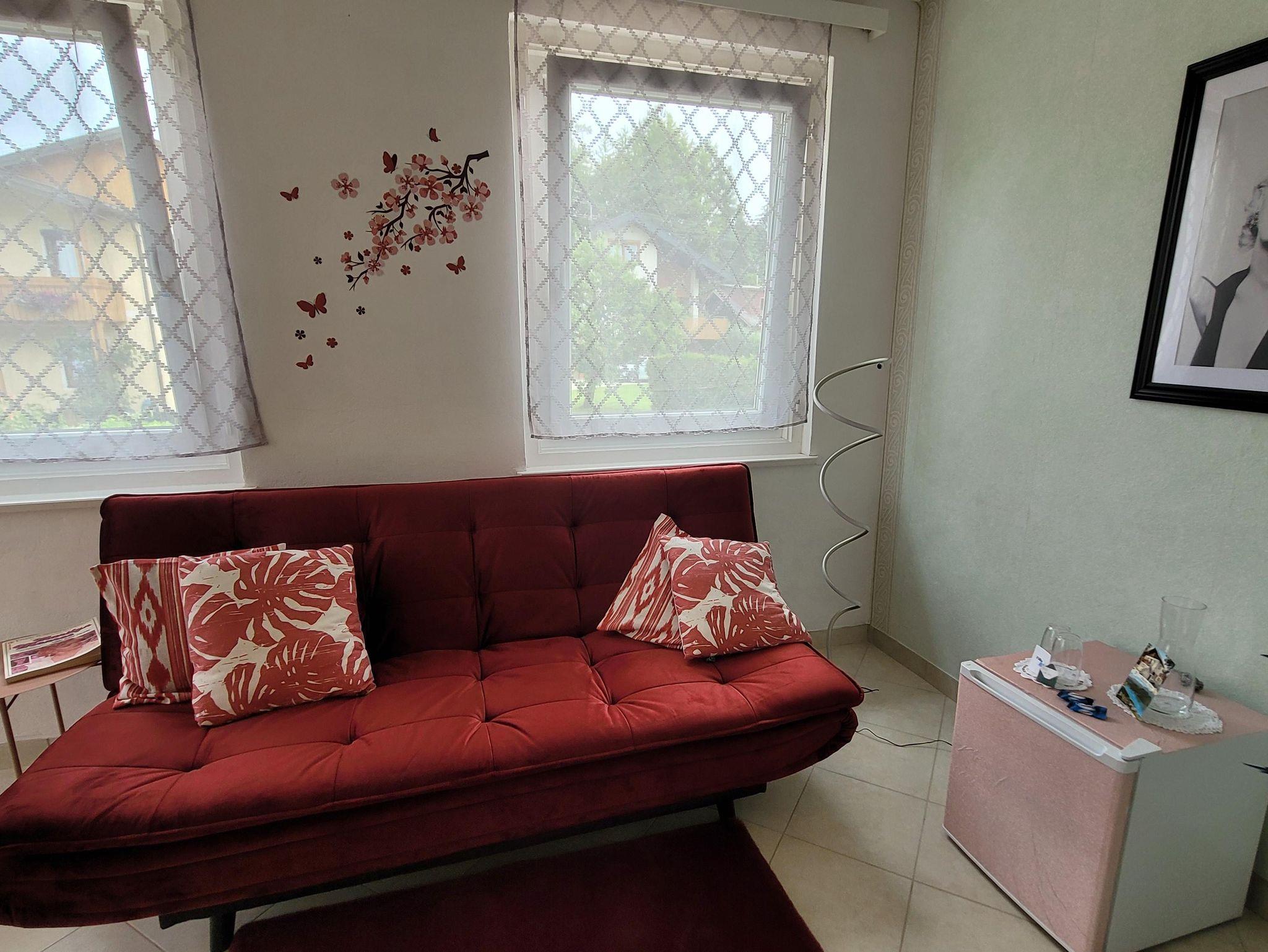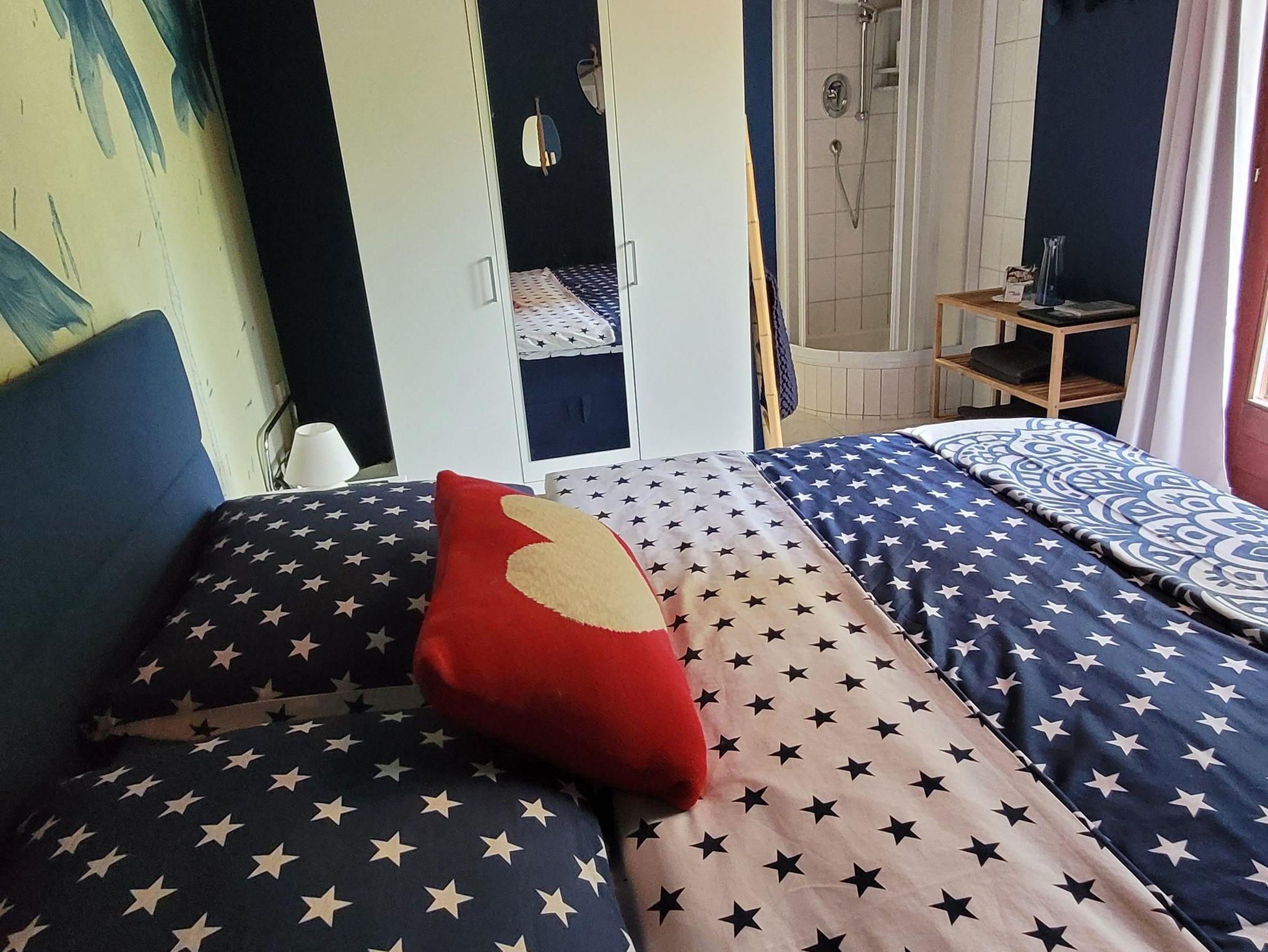 Das größere Zimmer ist ausgestattet mit einem komfortablen Doppelbett, Dusche und WC. Im Einzelzimmer befindet sich eine gemütliche Couch, ein kleienr Kühlschrank und ein Schreibtisch.