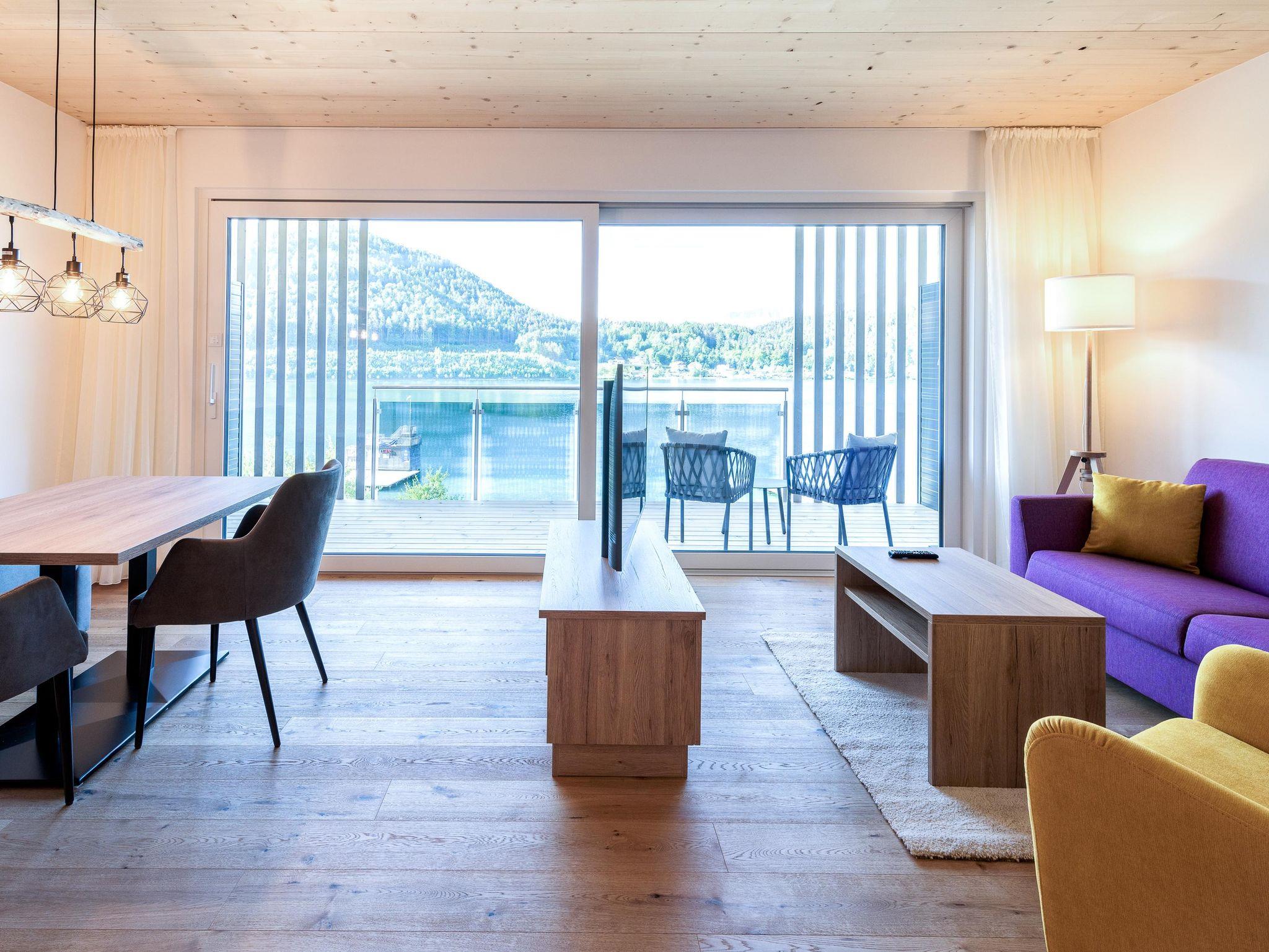 Dieses Appartement im 2. Obergeschoß bezaubert mit einem großartigen Panoramablick auf den See und die Bergwelt Südkärntens. Auf rund 50m2 Wohnfläche mit einer ca. 45m2 großen Balkonterrasse genießen Sie Ihren Aufenthalt am Klopeiner See das ganze Jahr über. Die exklusive Ausstattung der Ferienwohnung lässt keine Wünsche offen: Hochwertige Einrichtung mit einer modernen Küchenzeile, großem Flat-TV, WLAN, Klimaanlage, Bodenheizung und vieles mehr.