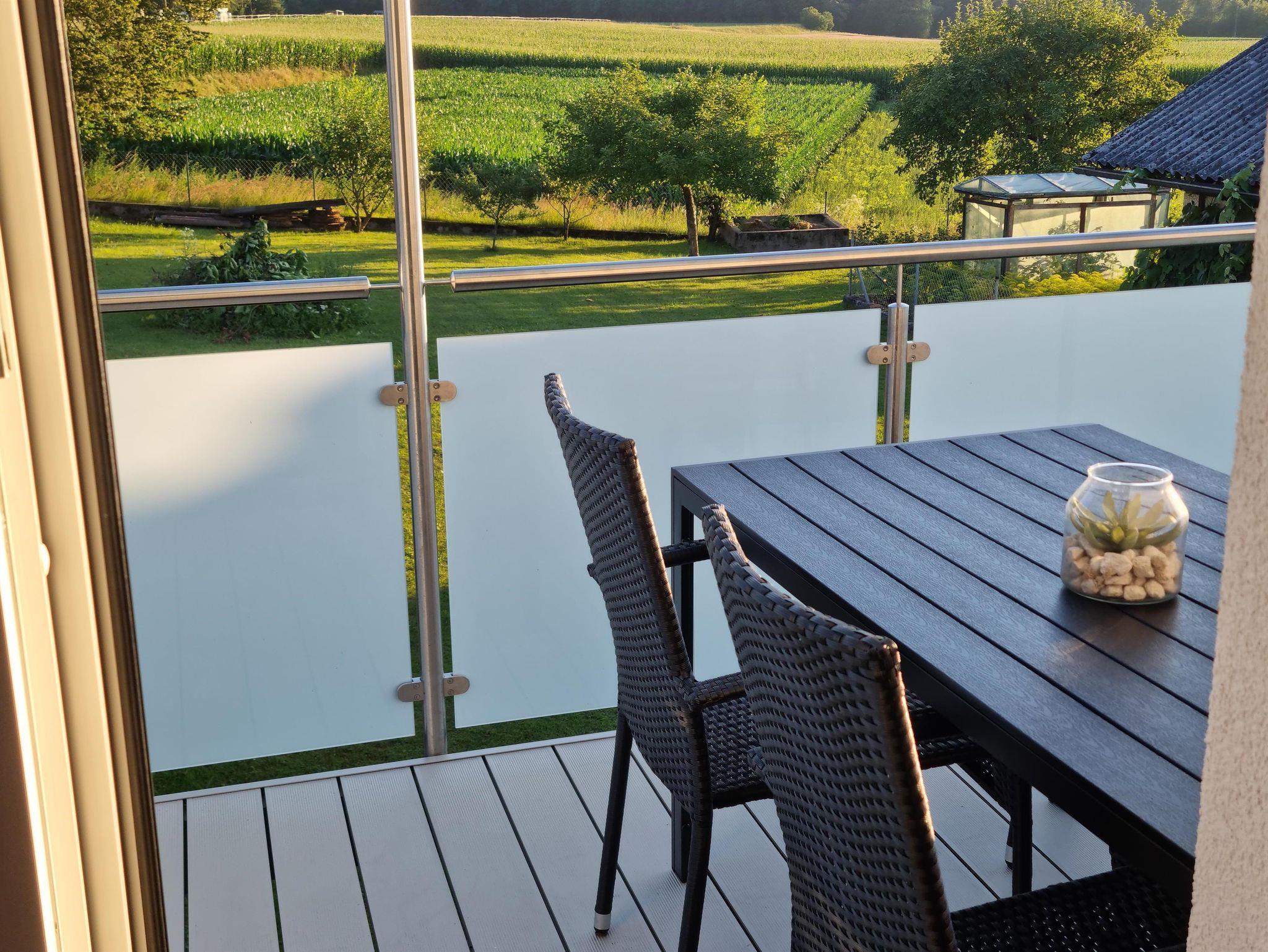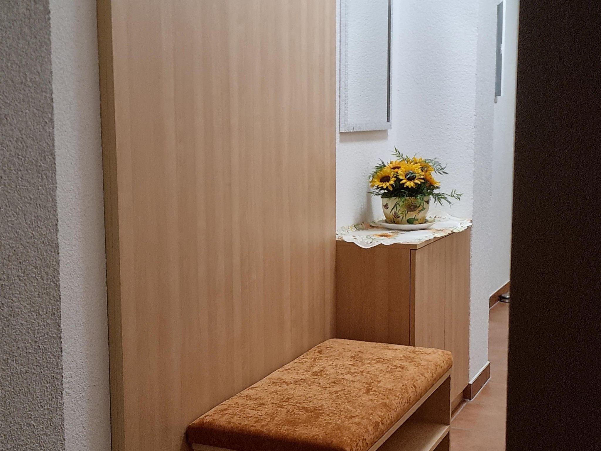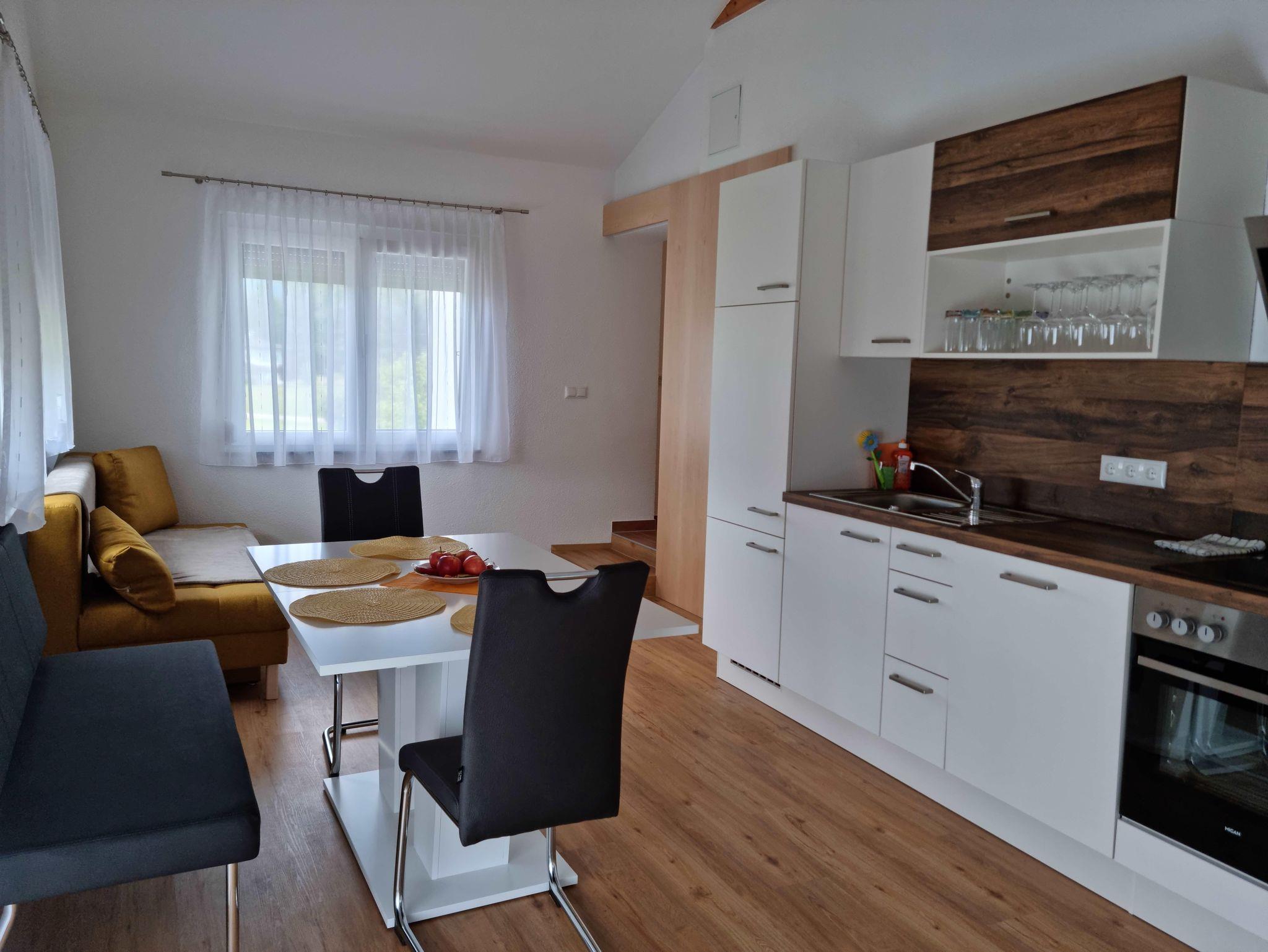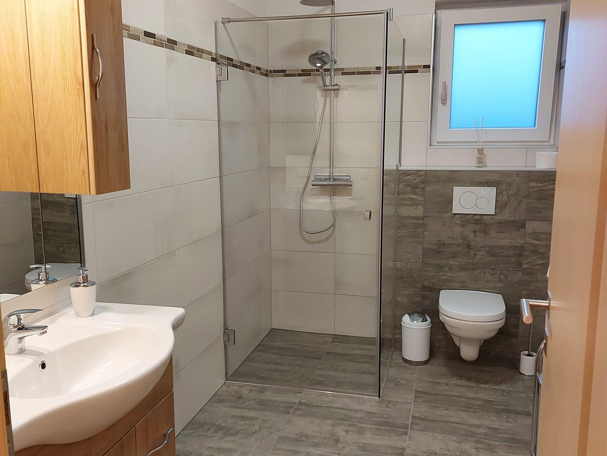 Das neu errichtete Appartement verfügt über eine Wohnküche, zwei große Schlafzimmer, eine Wohnküche, ein Badezimmer mit Badewanne und einer geräumigen ebenerdigen Dusche und einem Waschbecken mit Spiegelschrank. Das WC ist getrennt. Bei einem Schlafzimmer gibt es einen Balkon mit Sitzgelegenheit. Von der Wohnküche gelangen Sie auf einen schönen großen Balkon mit Sitzgelegenheit. Hier können Sie die Nachmittagssonne mit Blick in den Garten bis zum Sonnenuntergang genießen.