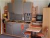 • Im Raum integrierte Kleinküche (in silbergrau) mit Doppelkochplatte, Kühlschrank,Abwasch,Geschirr, Kaffeemaschiene usw. sowie ausziehbarer Tisch für 4 Personen.