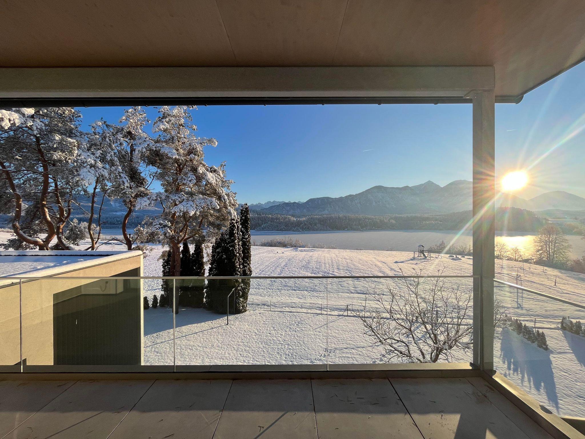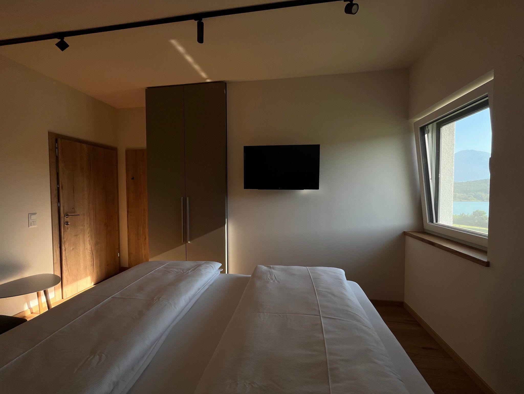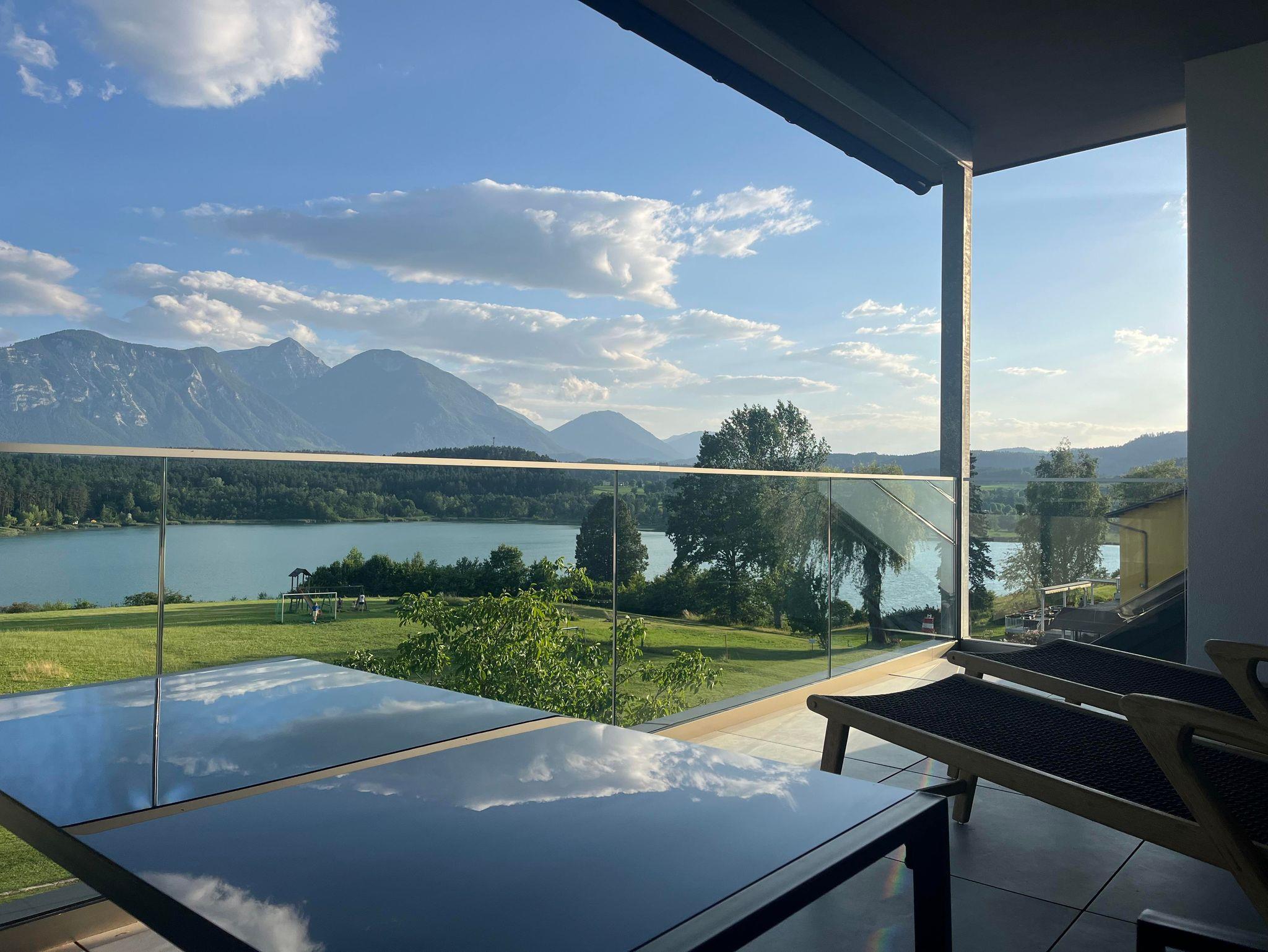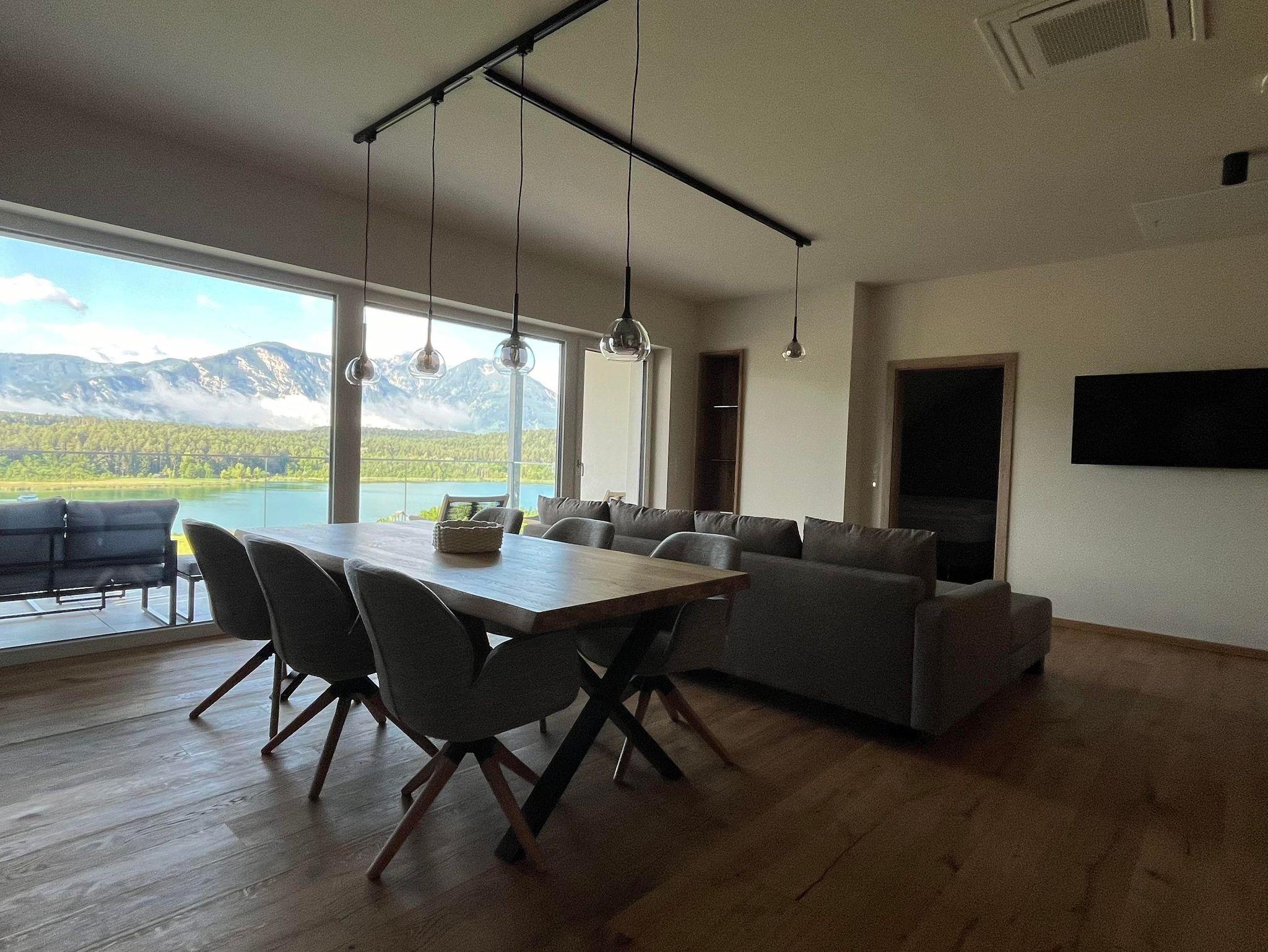 Das Penthouse-Appartement befindet sich im 2. Stock, ist 85 m² groß, verfügt über eine 20 m² große überdachte Terrasse mit Blick auf den See und ist das Highlight unseres Hauses. Die Terrasse ist mit Gartenmöbeln ausgestattet und lädt zum Verweilen, mit Aussicht auf die Karawanken, ein.