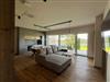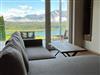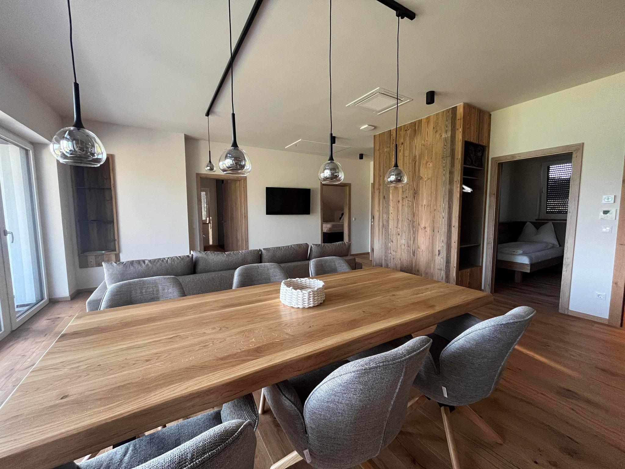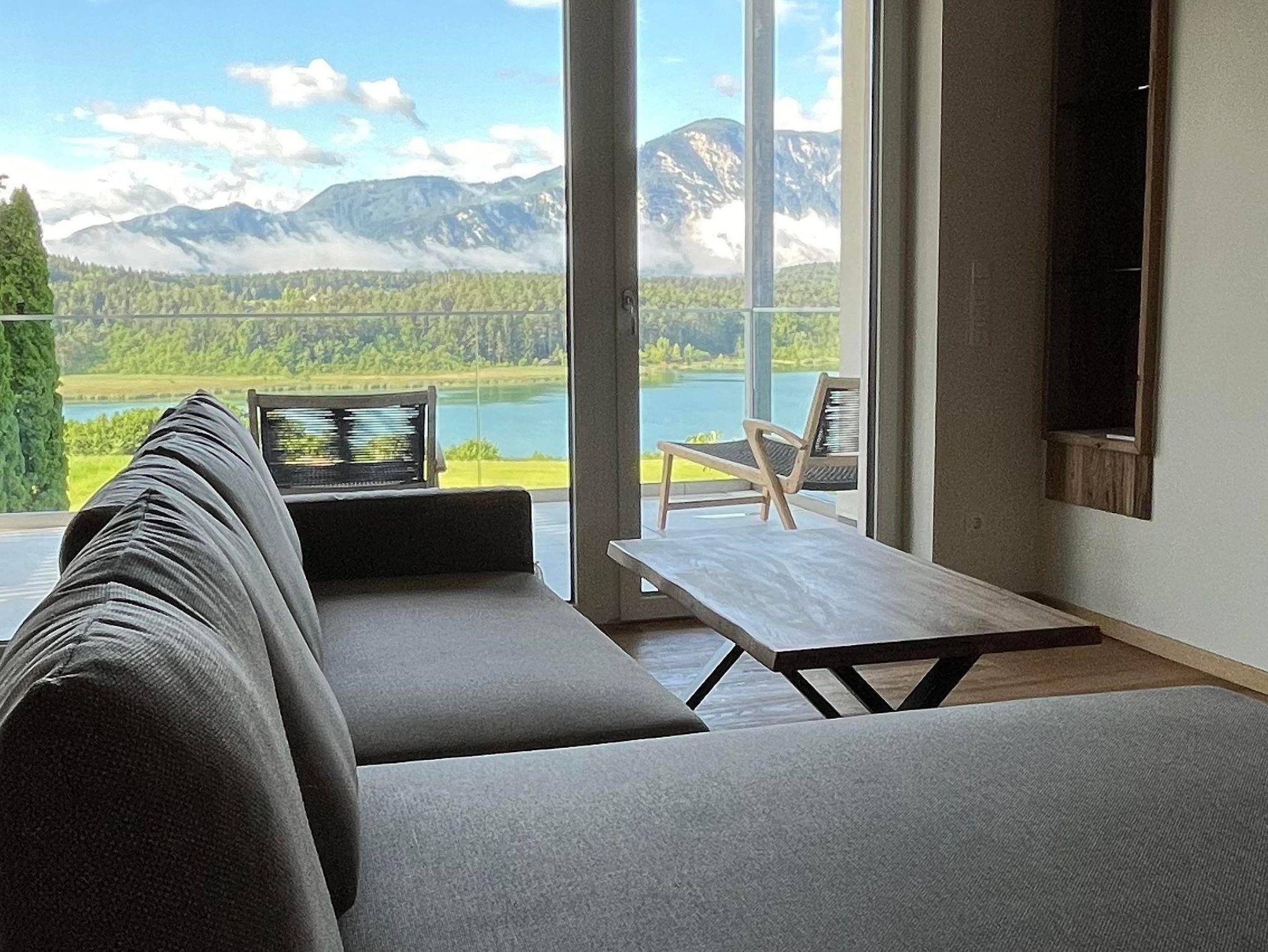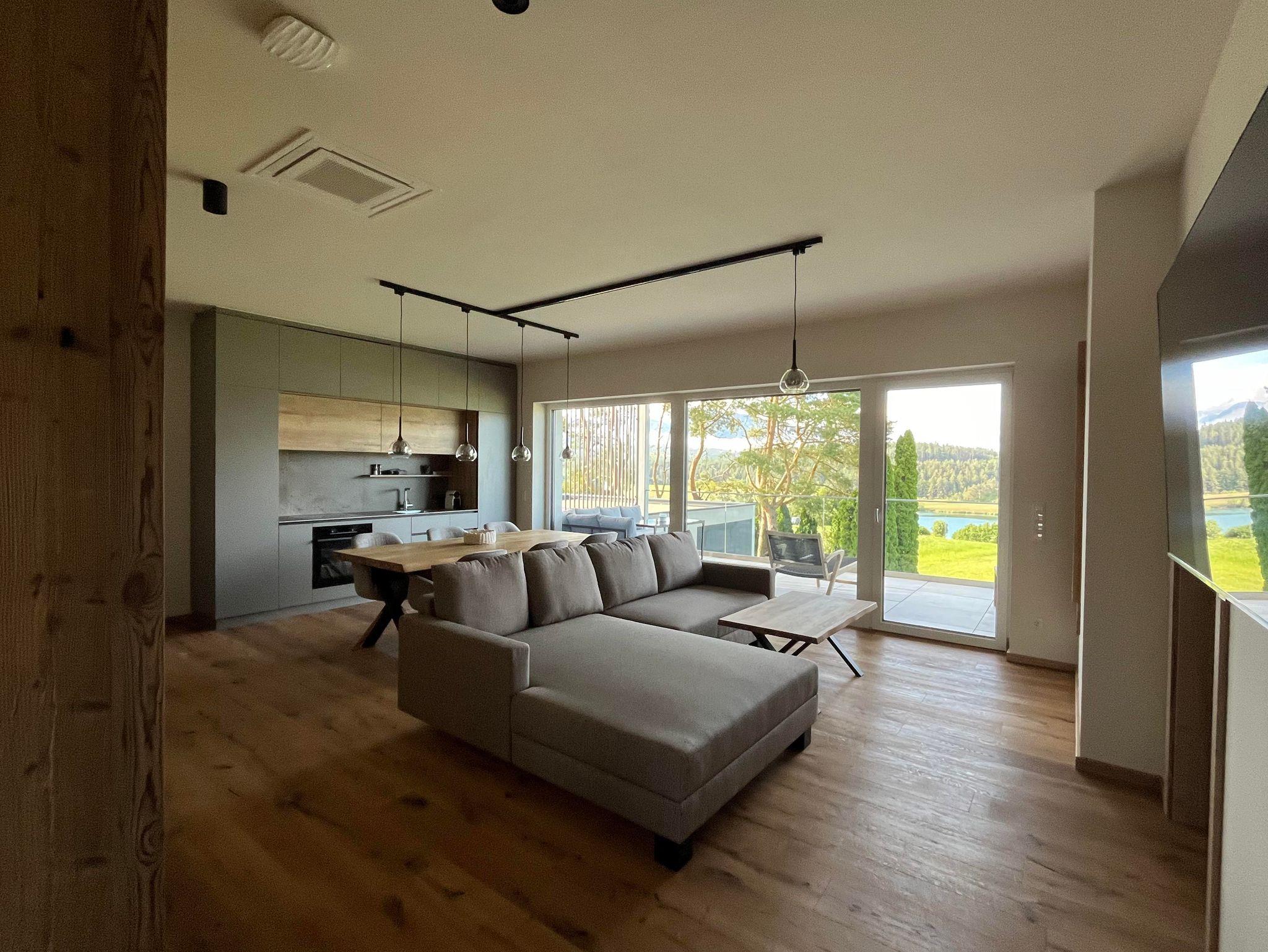 Der Wohnraum besticht mit seiner großen Glasfront, die direkt auf die Terrasse führt. Im Wohnraum befindet sich eine moderne Küche, ausgestattet mit Kühlschrank, Gefrierfach, Ceranfeld, Backrohr, Geschirrspüler, Spüle, Kaffeemaschine und Wasserkocher. Die Küche enthält ein vollständiges Besteck- und Geschirrservice. Der Esstisch, für bis zu 6 Personen, ermöglicht einen einzigartigen Ausblick auf den See während dem Essen. Zum Entspannen lädt die große Couch mit Fernseher ein. Bei mehr als 5 Personen, findet eine weitere Person auf der gemütlichen Ausziehcouch Platz.