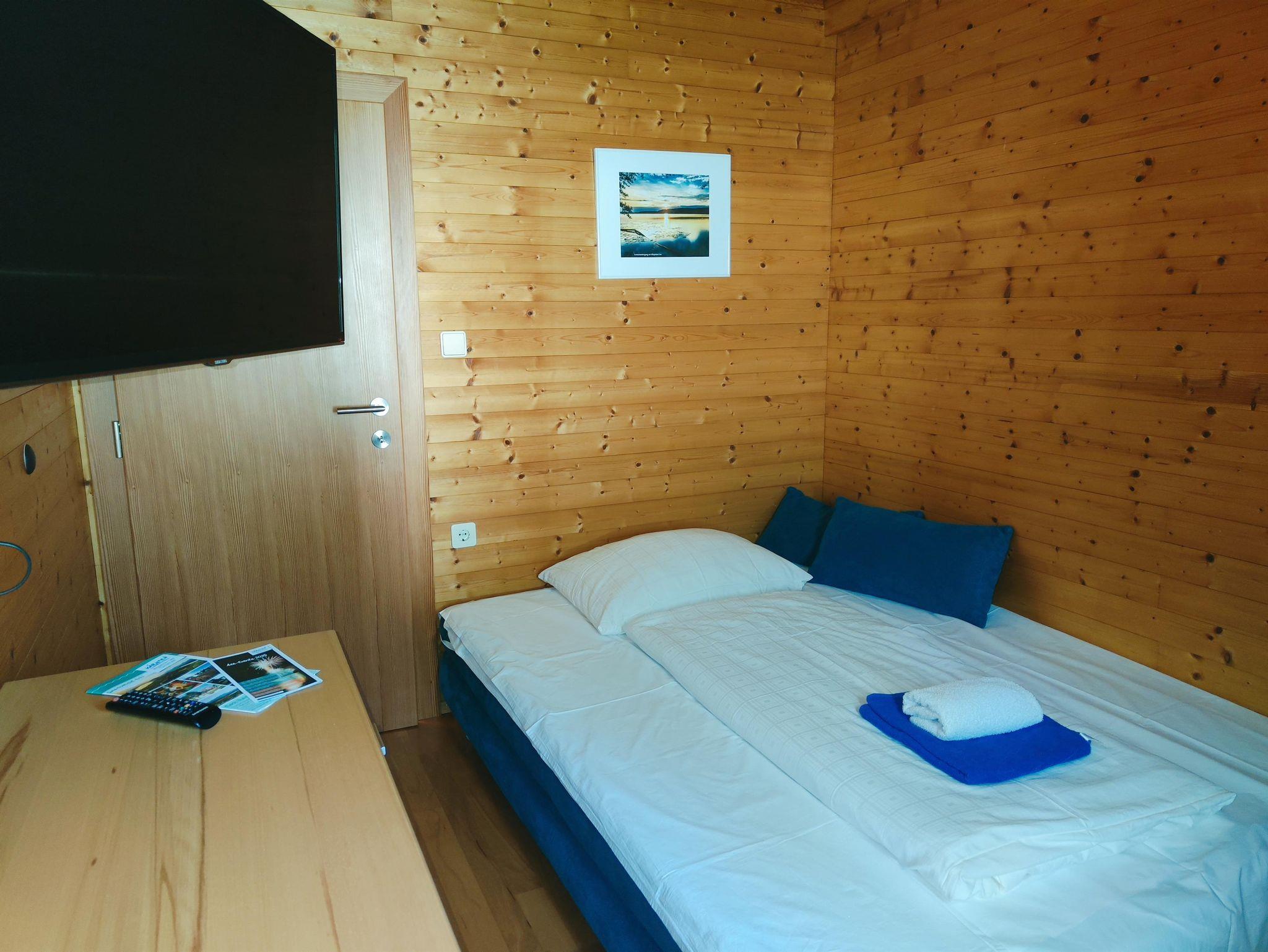 Der gemütliche Holzbungalow (34m²)bietet 1 Schlafzimmer und 1 getrenntes Wohnzimmer mit ausziehbarer Couch und Sat-TV. Die 6m² große überdachte Veranda mit Seeblick ist der ideale Platz für ein Frühstück mit Seeblick. Der Bungalow ist mit einer Klimaanlage ausgestattet. Es sind 2 Liegestühle und 1 Sonnenschirm für Sie im Bungalow reserviert. Zum Privatstrand gelangen Sie direkt über unsere große Liegewiese und über die Fußgänger-Seepromenade.