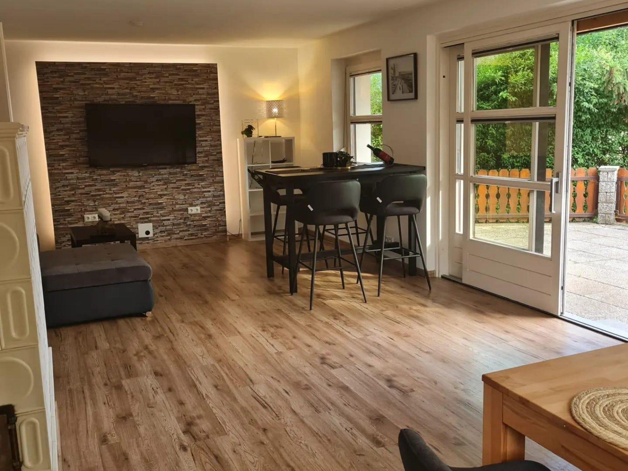 Das große Wohnzimmer verfügt über einen ausziehbaren Esstisch, eine Bar und einen Kachelofen, sowie ein Schlafsofa. Ein TV ist natürlich auch vorhanden.