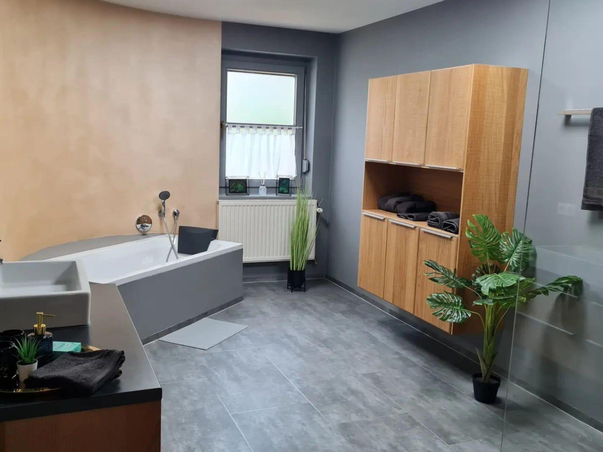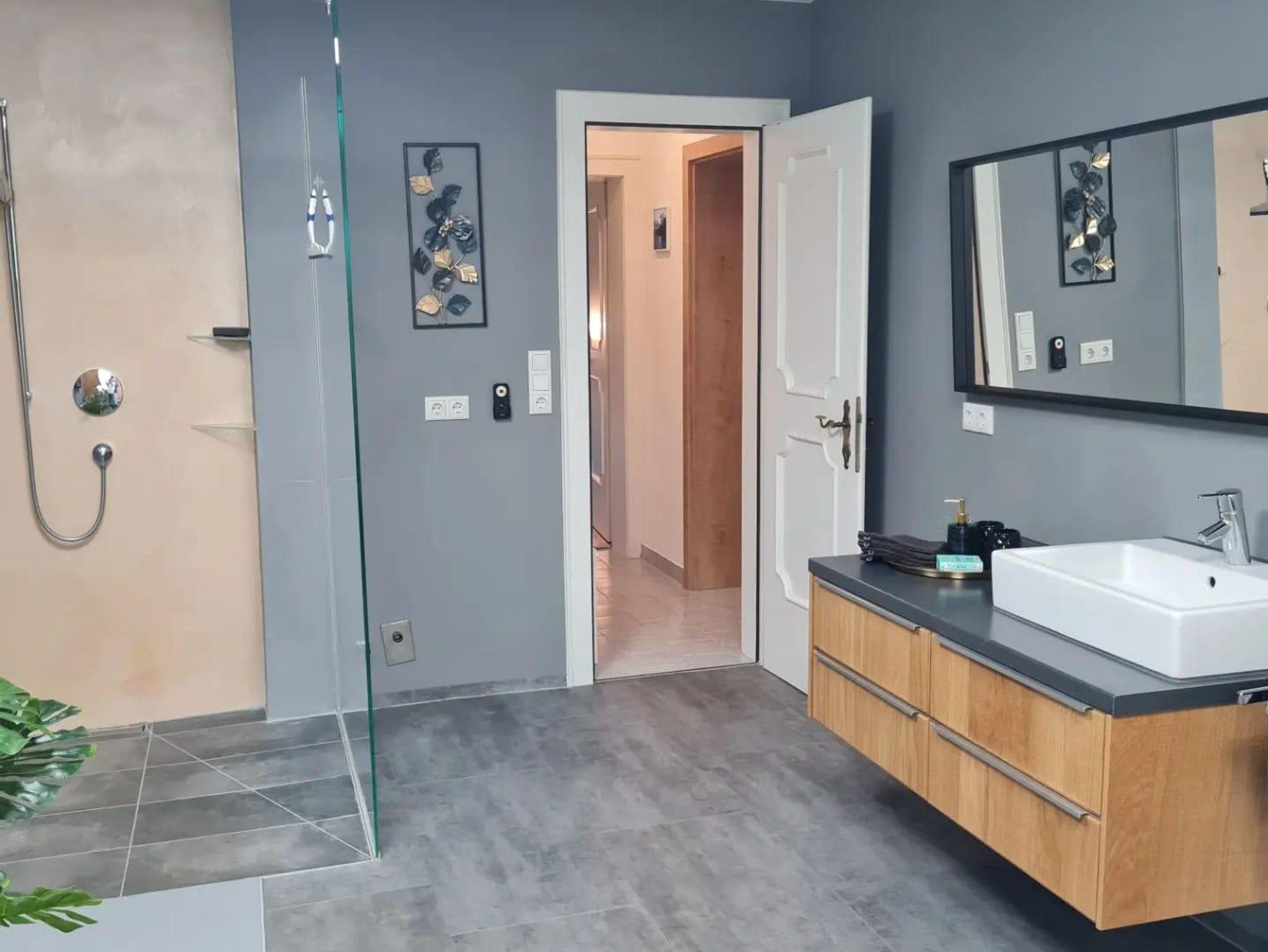 Das Bad verfügt über eine Badewanne, sowie eine große bodentiefe Dusche.