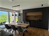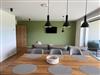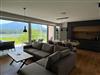 Der Wohnraum besticht mit seiner großen Glasfront, die direkt auf die Terrasse führt. Im Wohnraum befindet sich eine moderne Küche, ausgestattet mit Kühlschrank, Gefrierfach, Ceranfeld, Backrohr, Geschirrspüler, Spüle, Kaffeemaschine und Wasserkocher. Die Küche enthält ein vollständiges Besteck- und Geschirrservice. Der Esstisch, für bis zu 6 Personen, ermöglicht einen einzigartigen Ausblick auf den See während dem Essen. Zum Entspannen lädt die große Couch mit Fernseher ein. Bei mehr als 4 Personen, finden bis zu 2 weitere Personen auf der gemütlichen Ausziehcouch Platz.