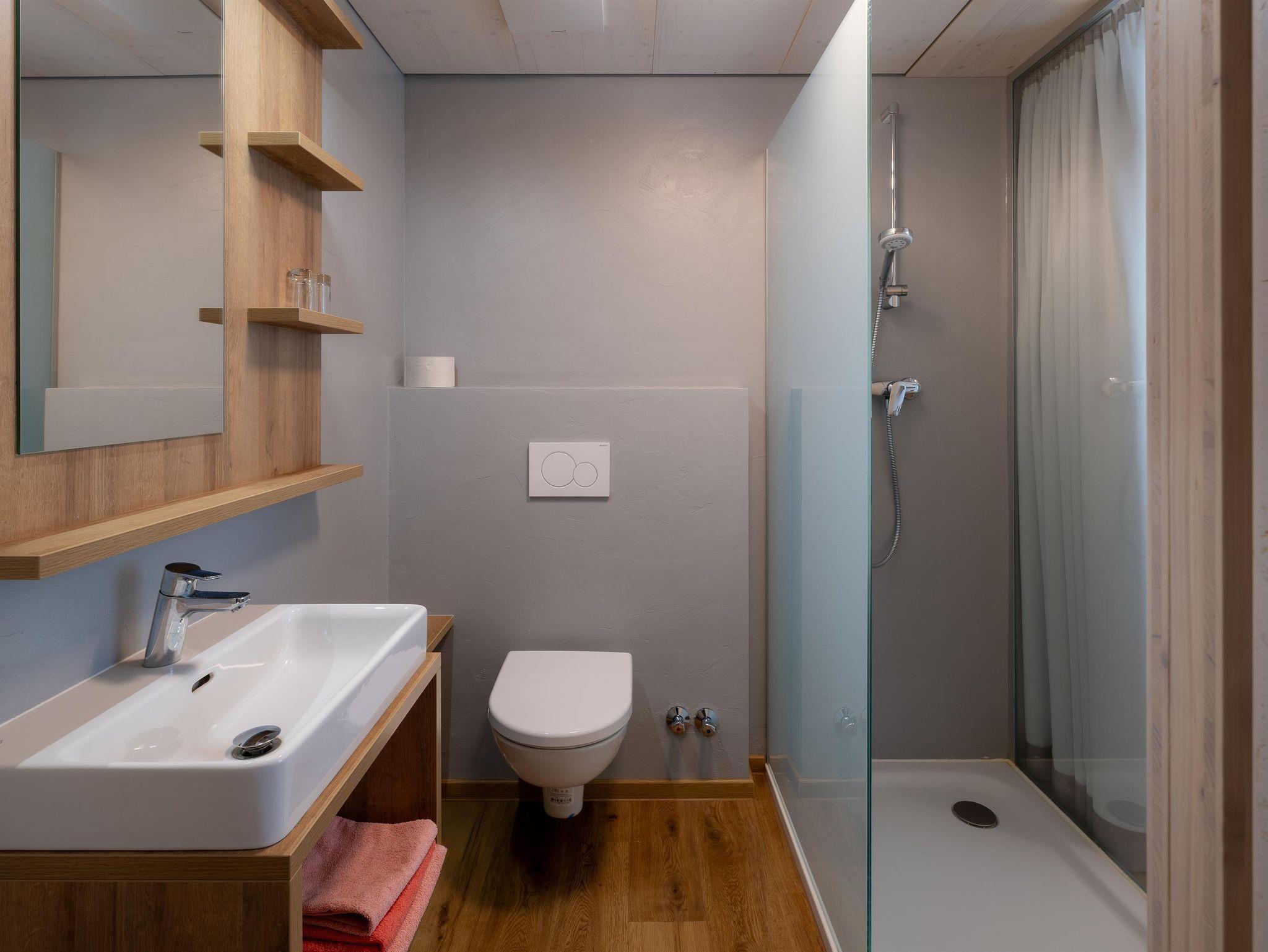 Zuerst kommt man in den Vorraum und von dort dann in die beiden Doppelzimmer, getrennte Eingänge und vom Vorraum erreicht man auch das Badezimmer mit DU und das getrennte WC. Das Familienappartement ist mit hellen einheitlichen Möbeln, einer ebenerdigen DU mit Waschtisch, WC, SAT-TV und Heizung in beiden Doppelzimmern, Heizung im Badezimmer ausgestattet. Balkon mit Tisch und 4 Stühlen.