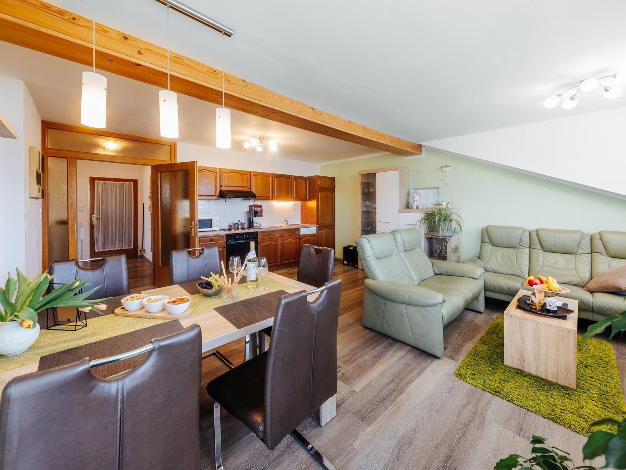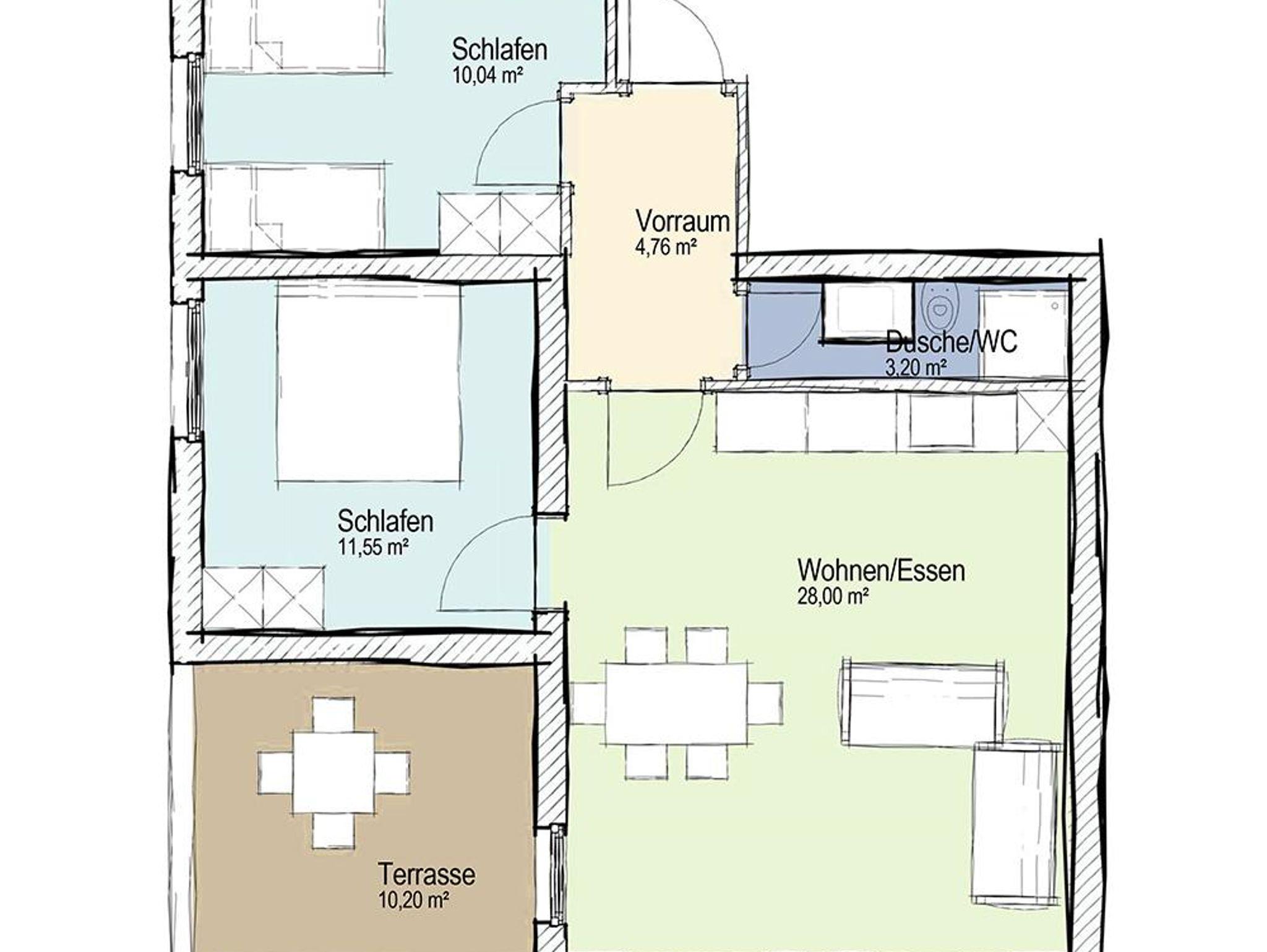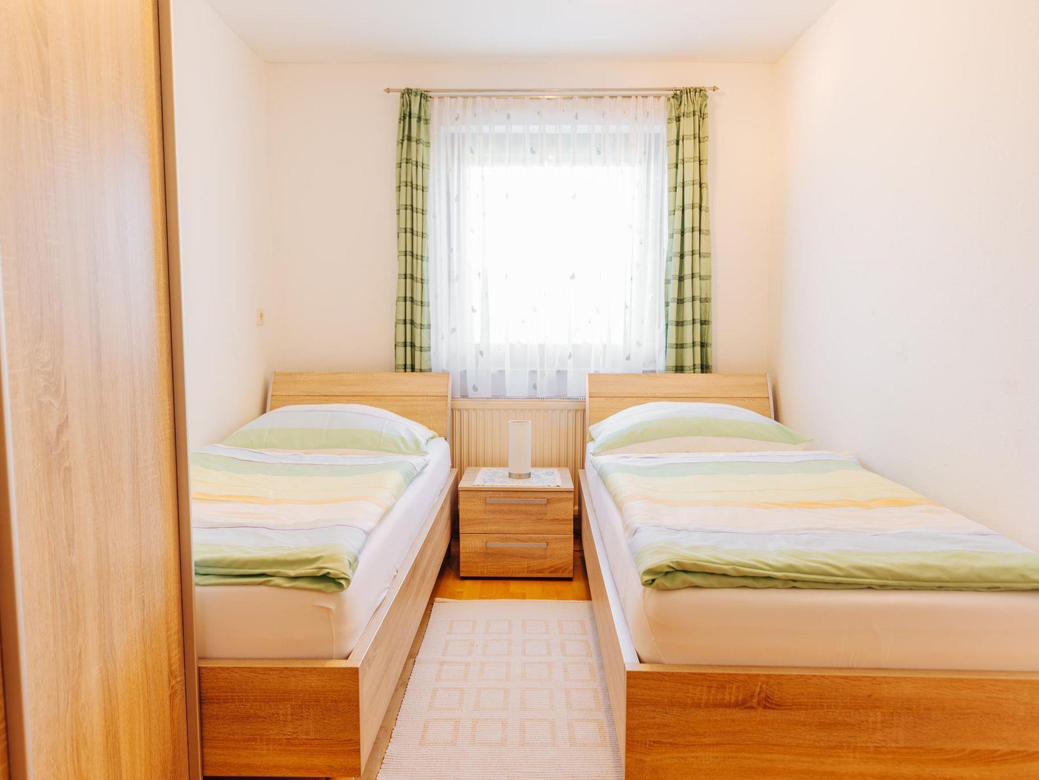 Die Ferienwohnung ist 58m² groß, bietet Platz für 5 Personen und beinhaltet zwei getrennte Schlafzimmer. Eines der Schlafzimmer verfügt über ein Doppelbett und ein Schlafsofa, das zweite über zwei Singlebetten. Weiters gibt es eine Wohnküche mit einer Essecke, Dusche mit WC und einen Vorraum. Die Wohnung verfügt zusätzlich über eine Sat/TV Anlage, Geschirrspüler, Kaffeemaschine, Küchenutensilien, Geschirr-, Handtücher und Bettwäsche. Sie liegt im 1.OG und ist an eine Dachterrasse angeschlossen, welche Sitzmöglichkeiten sowie einen Blick über den Turnersee und die Karawanken bietet.