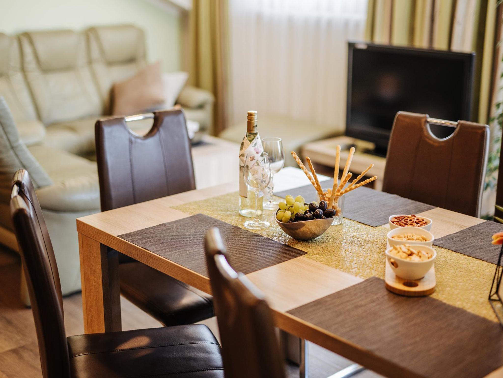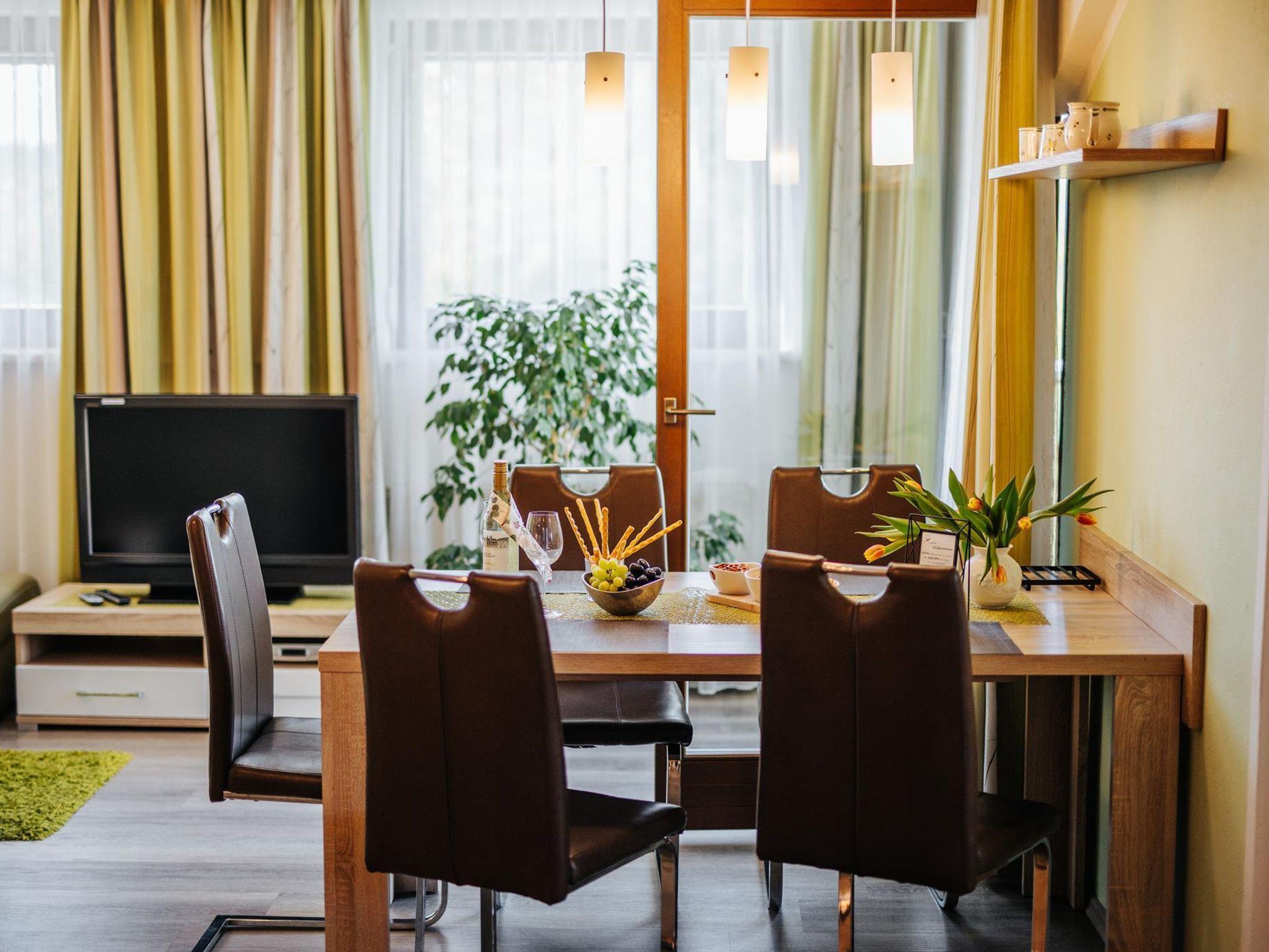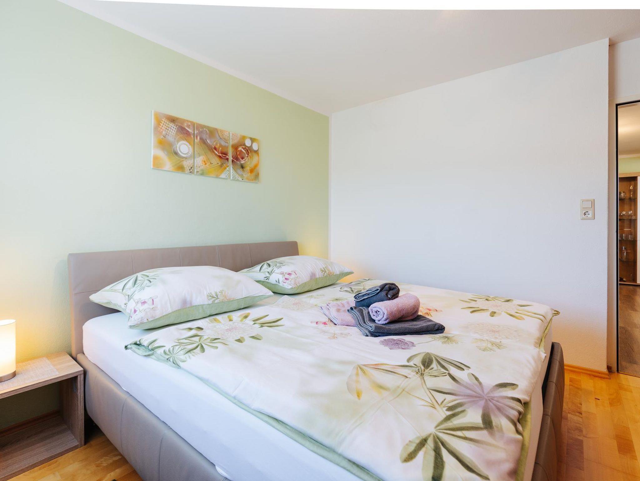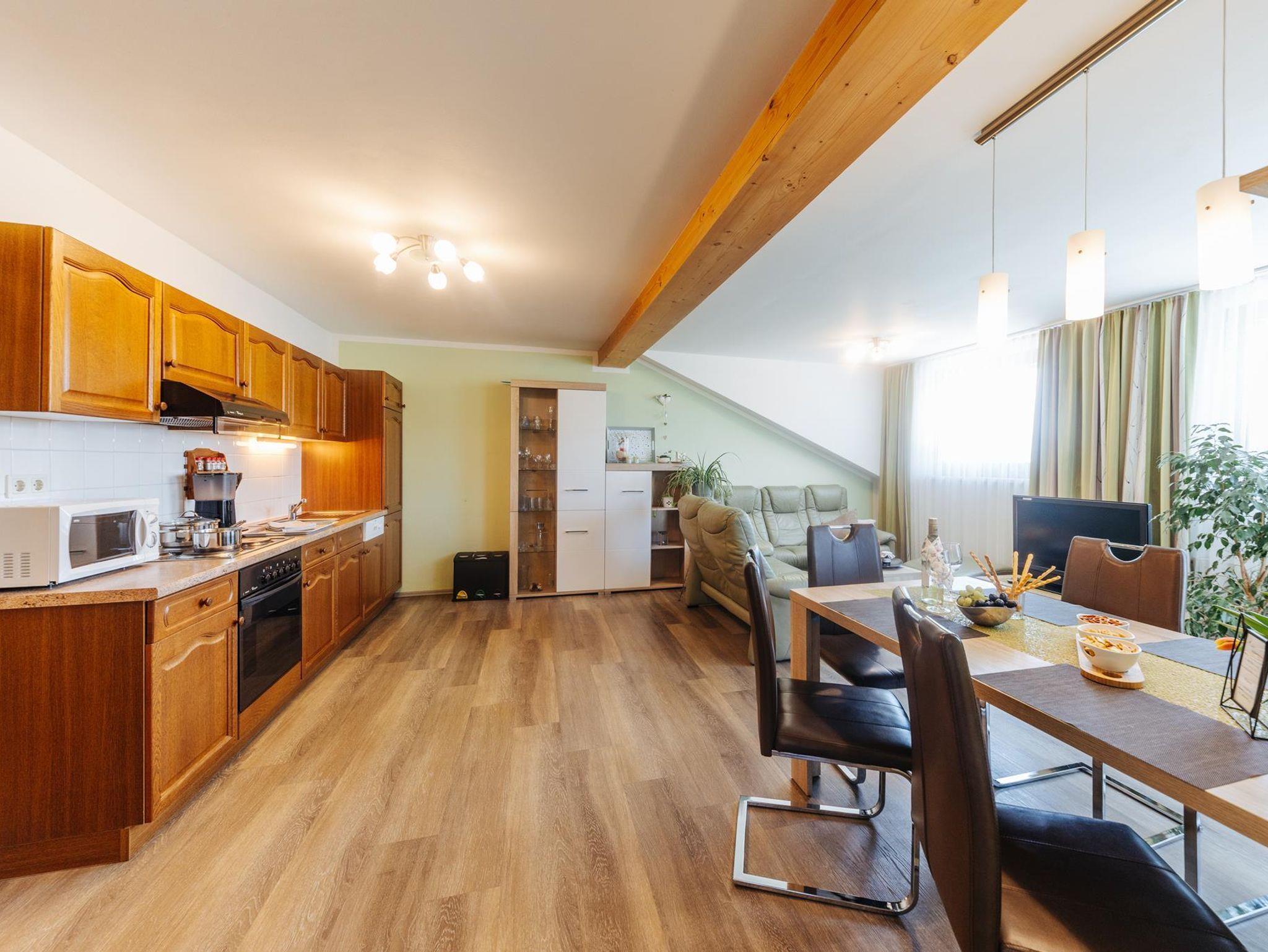 Die Ferienwohnung ist 58m² groß, bietet Platz für 5 Personen und beinhaltet zwei getrennte Schlafzimmer. Eines der Schlafzimmer verfügt über ein Doppelbett und ein Schlafsofa, das zweite über zwei Singlebetten. Weiters gibt es eine Wohnküche mit einer Essecke, Dusche mit WC und einen Vorraum. Die Wohnung verfügt zusätzlich über eine Sat/TV Anlage, Geschirrspüler, Kaffeemaschine, Küchenutensilien, Geschirr-, Handtücher und Bettwäsche. Sie liegt im 1.OG und ist an eine Dachterrasse angeschlossen, welche Sitzmöglichkeiten sowie einen Blick über den Turnersee und die Karawanken bietet.