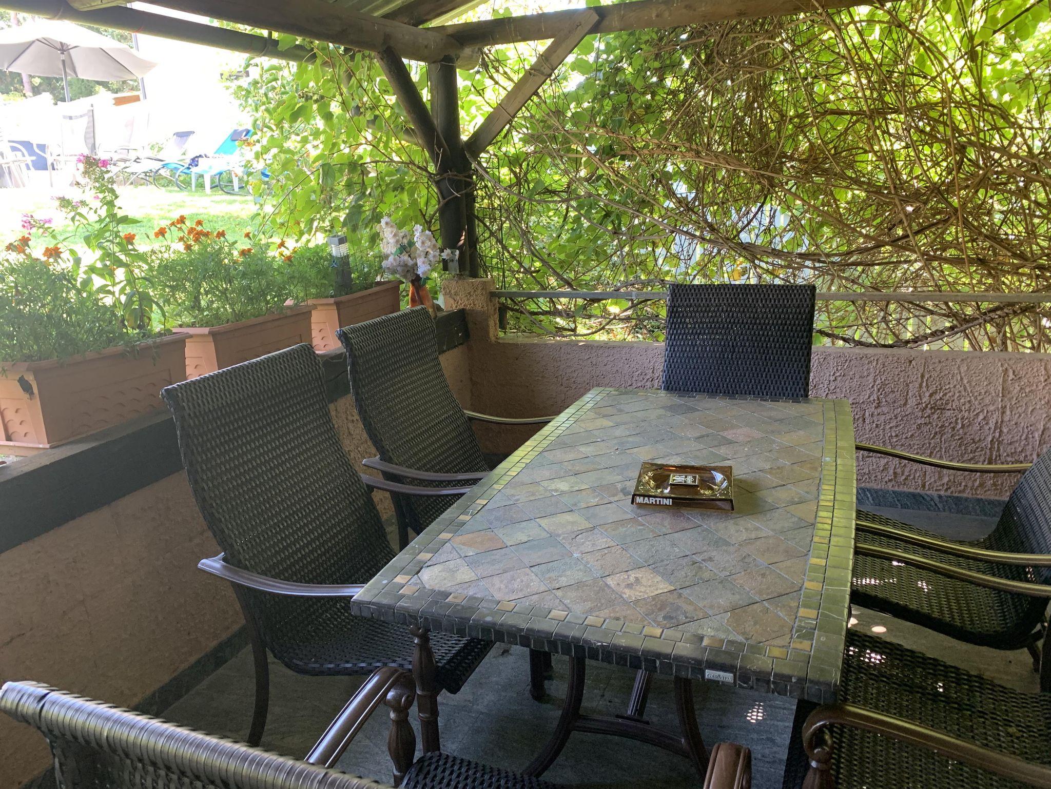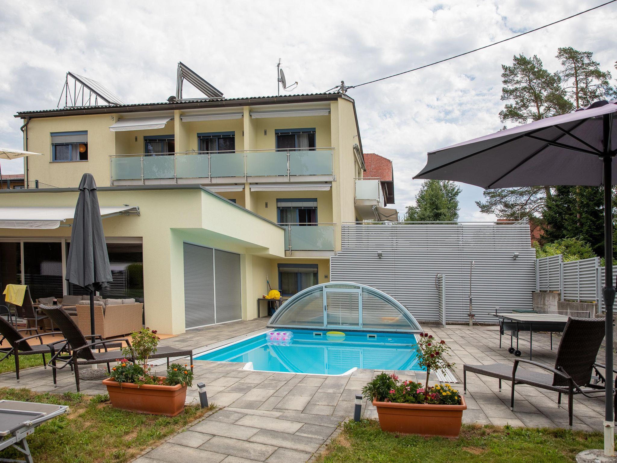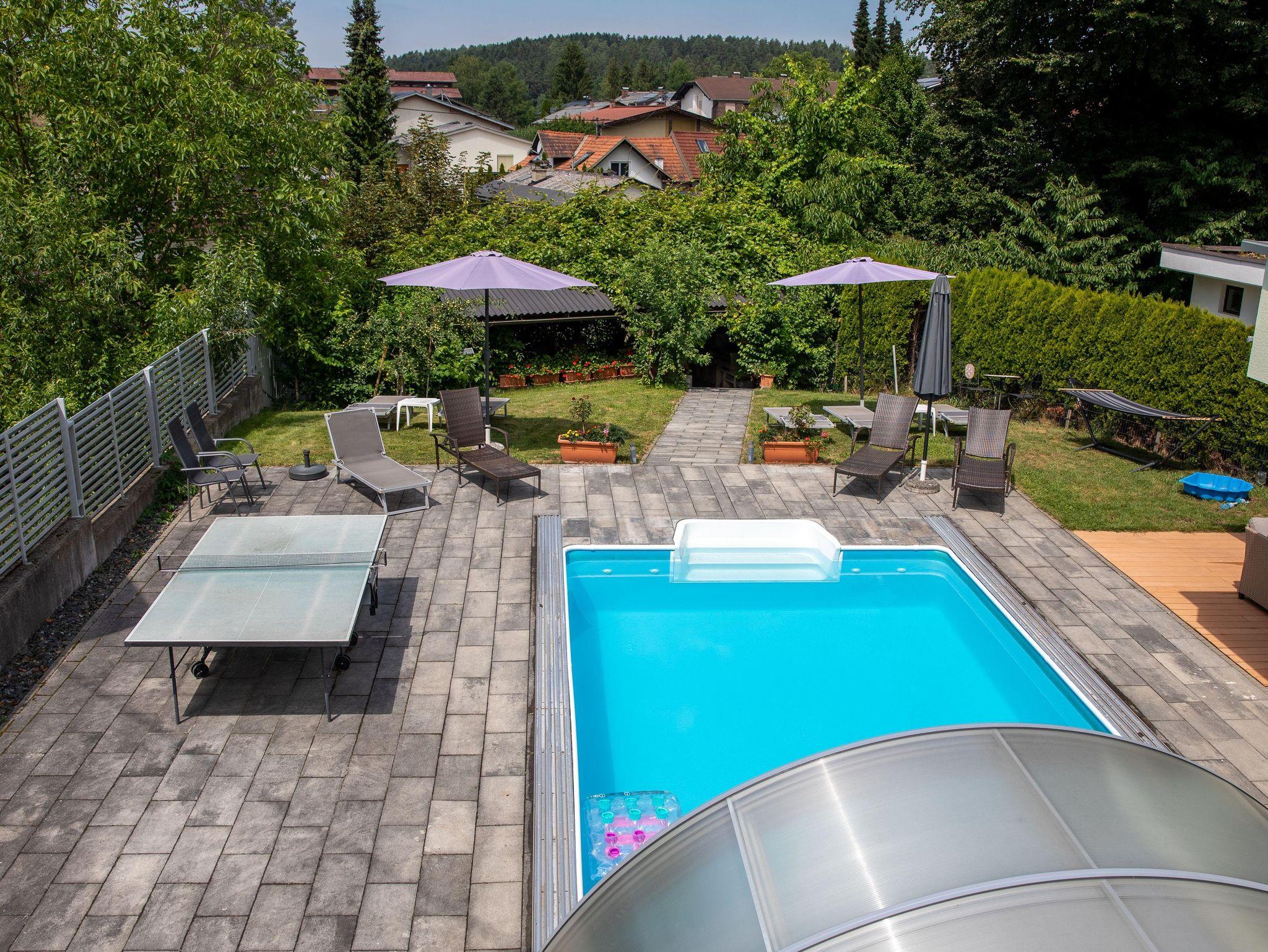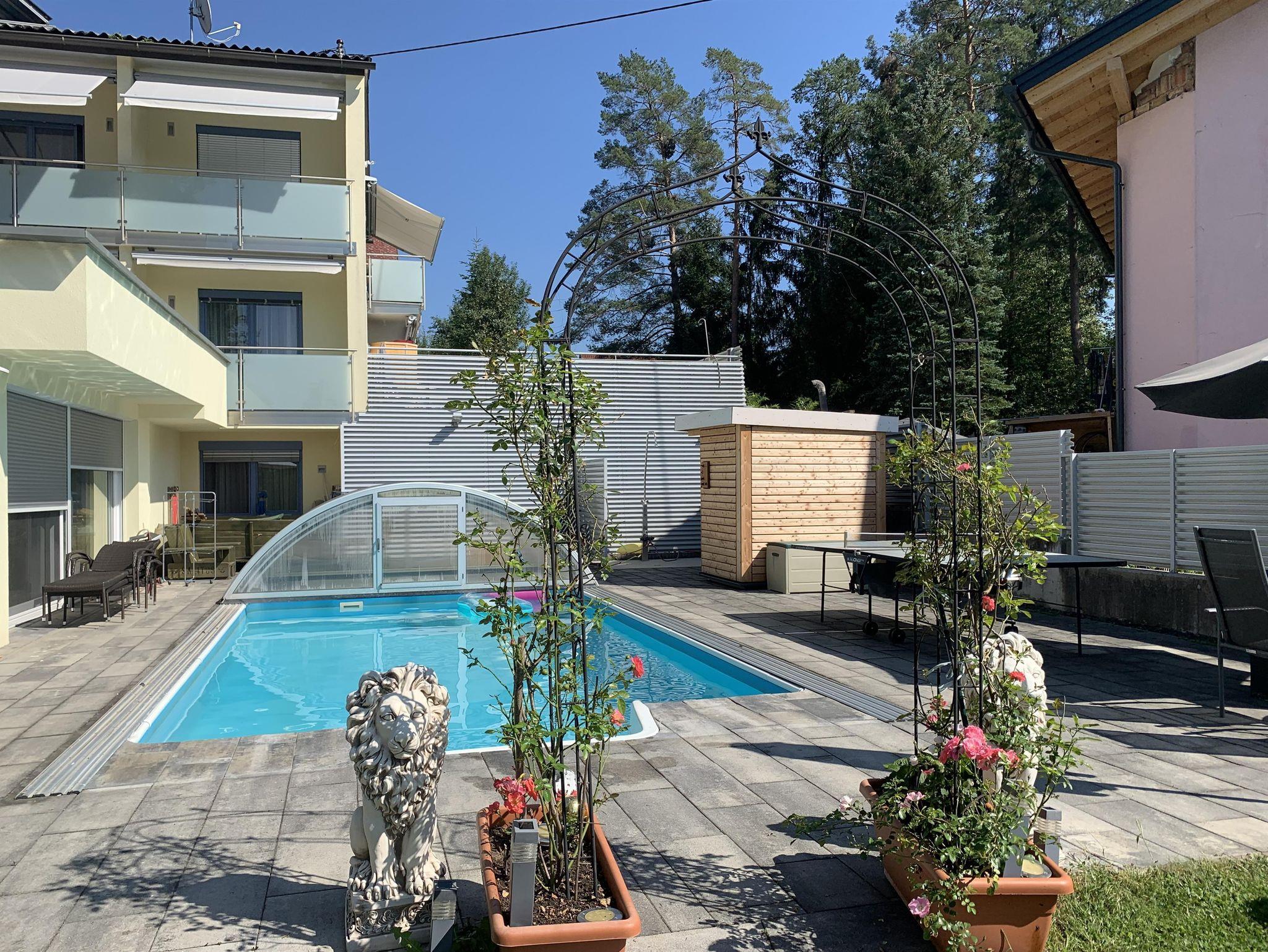 • Allgemeiner Gartenbereich mit Swimmingpool, Liegewiese (30 m²), Gartenlaube mit Grillmöglichkeit, Tischtennis und Sauna: Montag bis Freitag 9 bis 20 Uhr.
