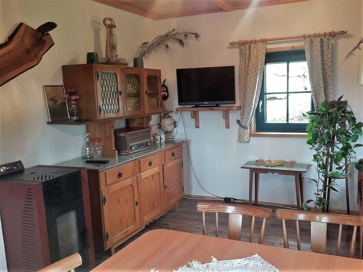 Der Wohnraum mit gemütlicher Essecke und Sofa lädt zu entspannten Abenden ein. Für behagliche Wärme sorgen ein Pelletsofen, ergänzt durch den Holzofen.