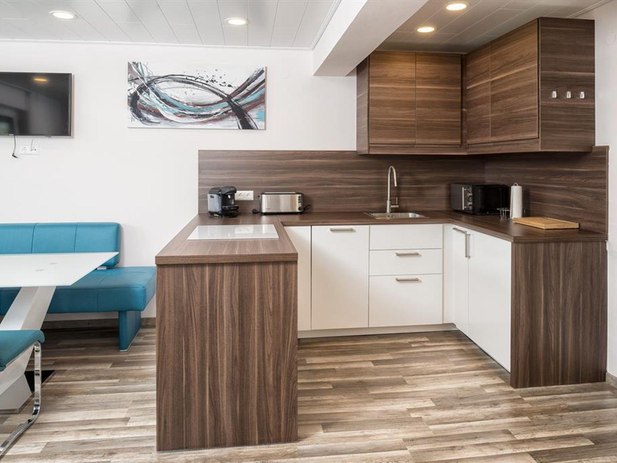 Der Wohnbereich (mit ausziehbarem Sofa), die funktional eingerichtete Küche mit Kühlschrank, Induktionskochfeld, Backrohr, Mikrowelle, Geschirrspüler, Toaster, Kaffeemaschine, etc. und eine Waschmaschine in der Wohnung sind ideal für Selbstversorger.
