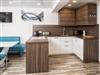 • Wohnbereich mit ausziehbarem Sofa sowie funktional eingerichteter Küche