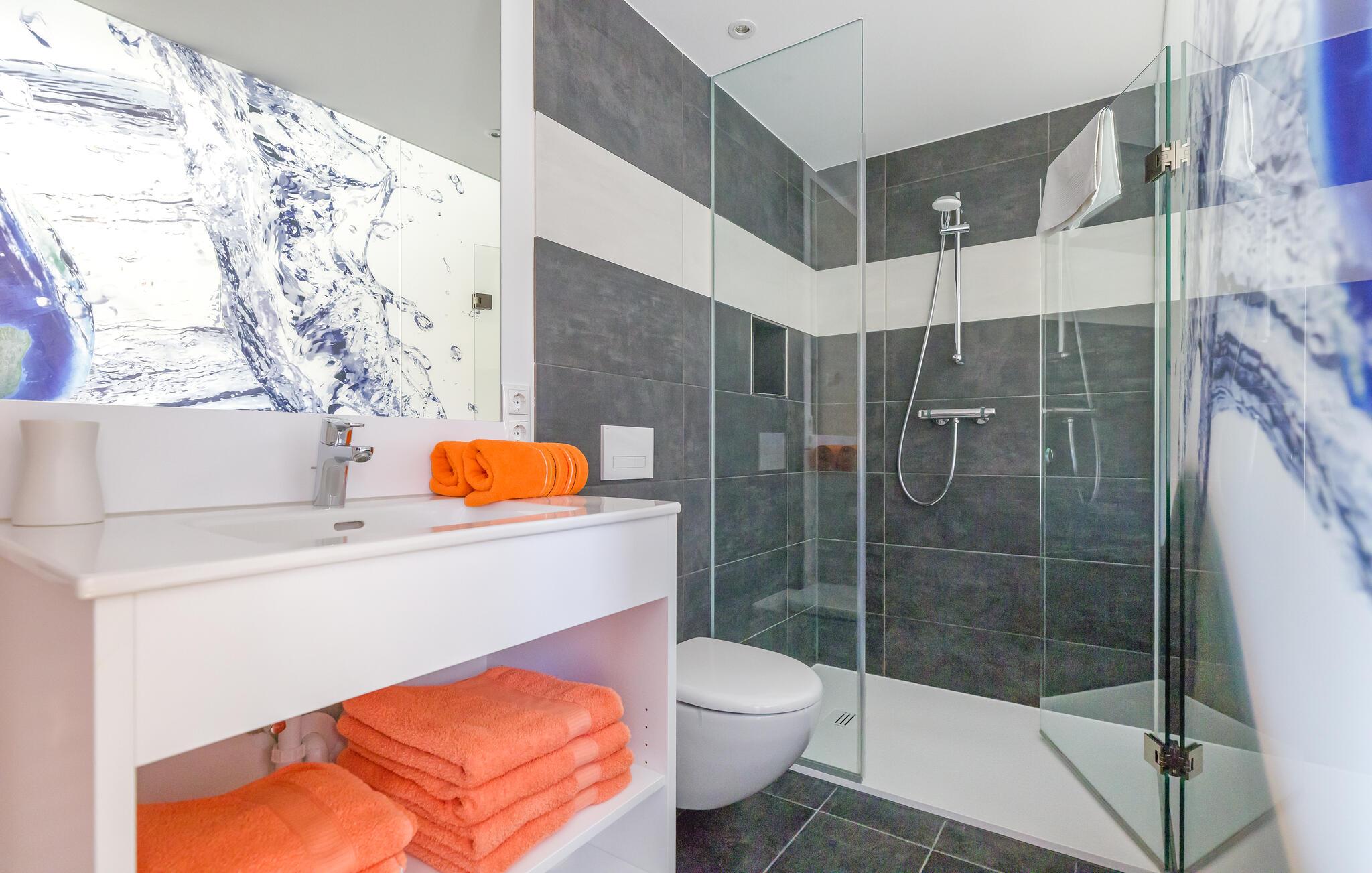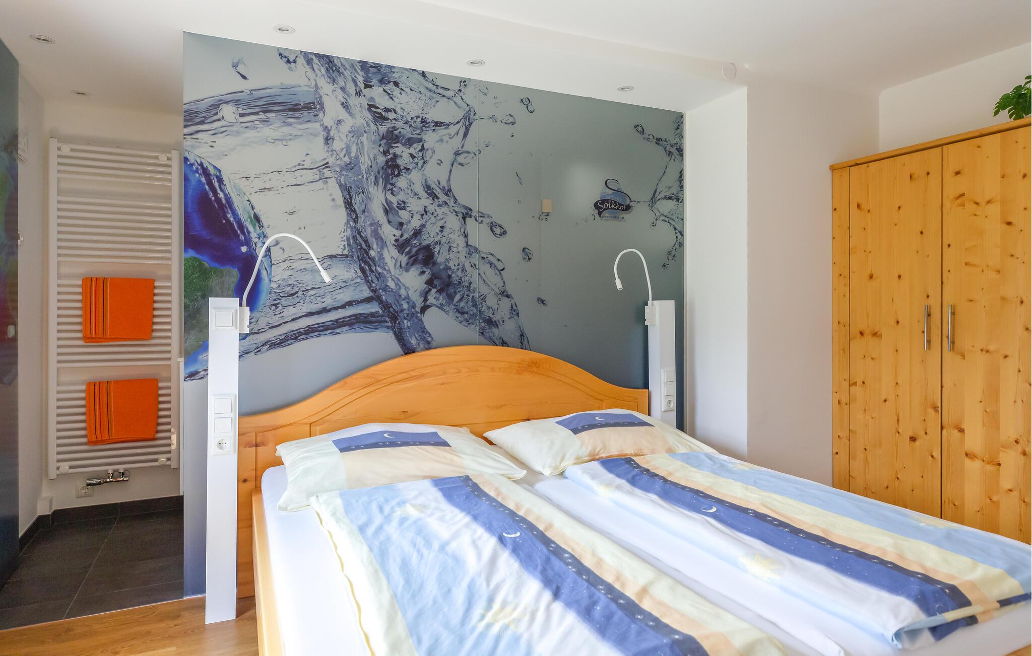 Denne lejlighed, der er møbleret i lyst træ, skaber en fredelig og hyggelig atmosfære, hvor I straks vil føle jer hjemme. Hyg jer sammen, og læg hverdagen bag jer. Tilbered jeres måltider i det moderne køkken og server dem ved spisebordet, inden I afslutter aftenen med et glas vin. Slap af i infrarød-saunaen, som I deler med andre gæster.