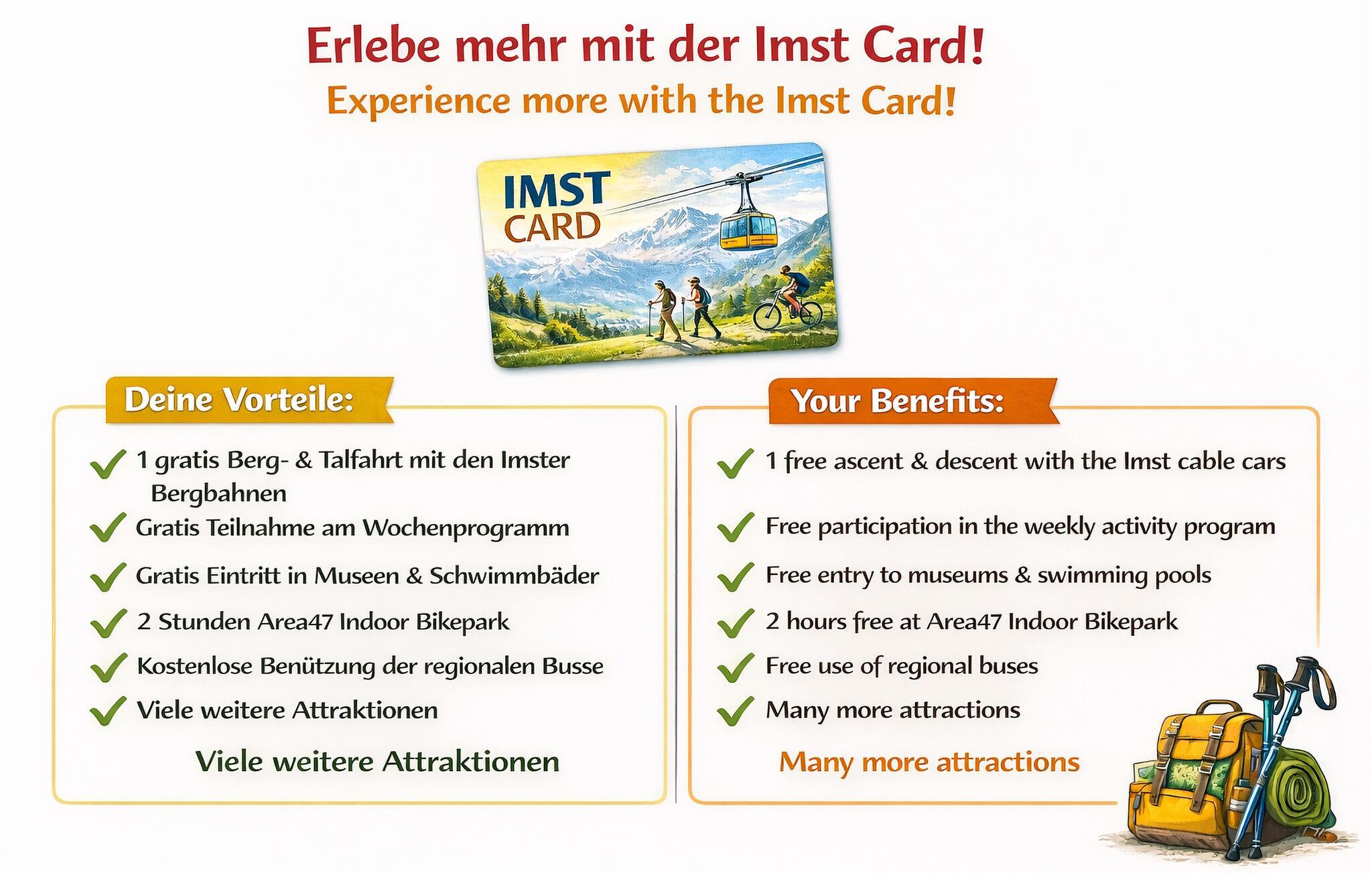 Udforsk det imponerende bjerglandskab i Lechtal-alperne på velmarkerede vandrestier. Tag lange gåture eller udfordr jer selv med en topvandring. fyld lungerne med den friske bjergluft og nyd den betagende udsigt over Inn-dalen. Om vinteren kan I opleve ren snesjov: Flere skisportssteder, såsom Venet, Serfaus-Fiss-Ladis og Ischgl, er let tilgængelige. Gå på snesko, glid langs langrendsløjper gennem sneklædte dale eller nyd romantiske vinterture gennem stille skove.